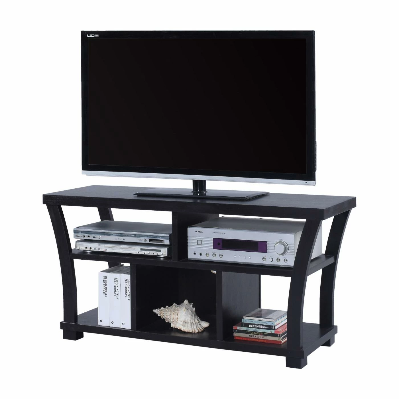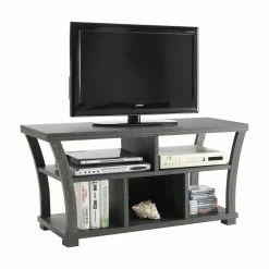 The Crown Mark Draper 5 Shelf TV Stand is perfect for the person that wants a lot of space around their TV to decorate and hold all of their technology essentials. Add your gaming systems, DVD player, and sound bars to the top shelves. Add decorative items, books, or DVDs to the bottom shelves. The curved frame and open shelf design provides a light and airy feel to this piece. Out of the five shelves, only one is closed off. This TV stand is constructed from melamine wood in your choice of available finish options. This stand will hold TVs up to 52 inches.