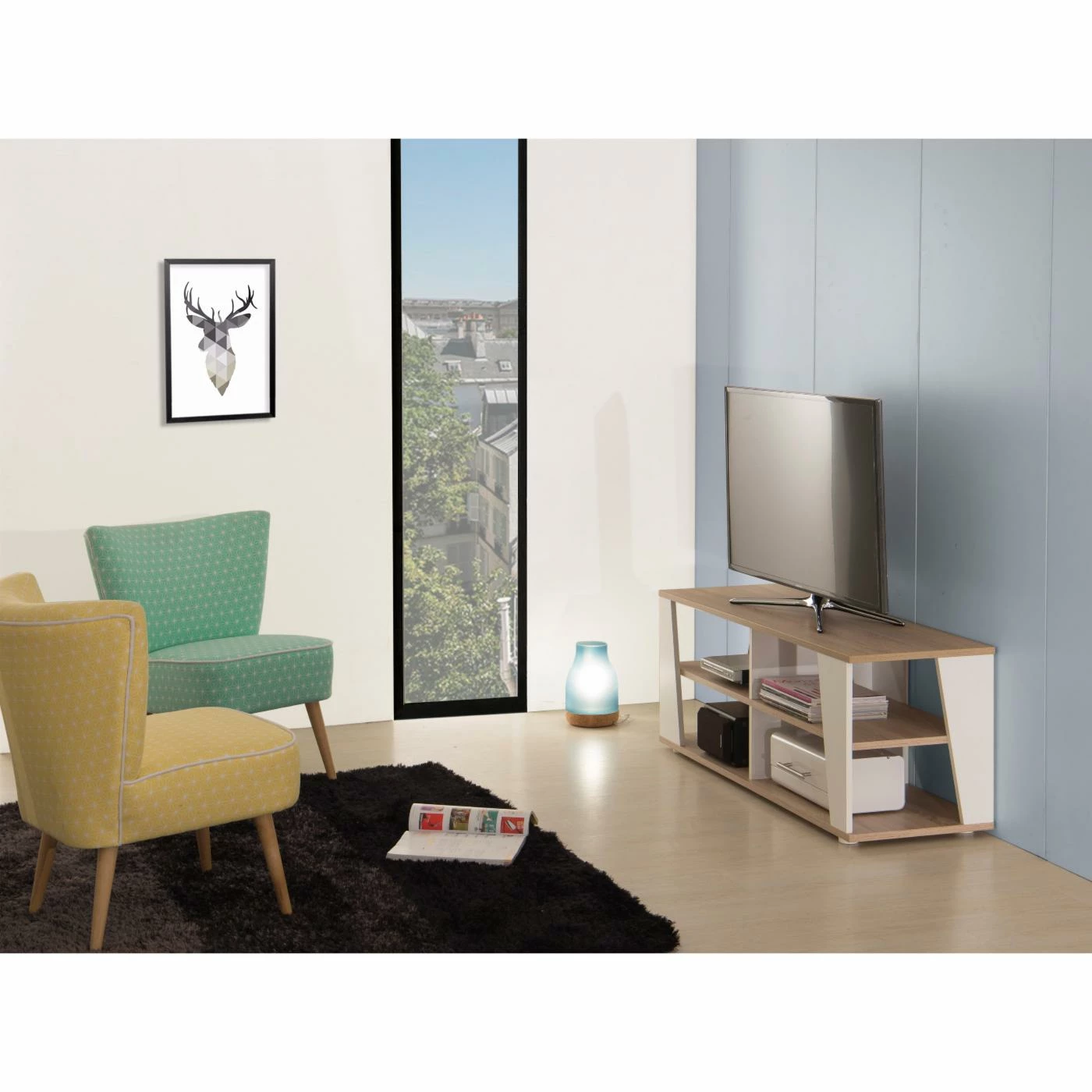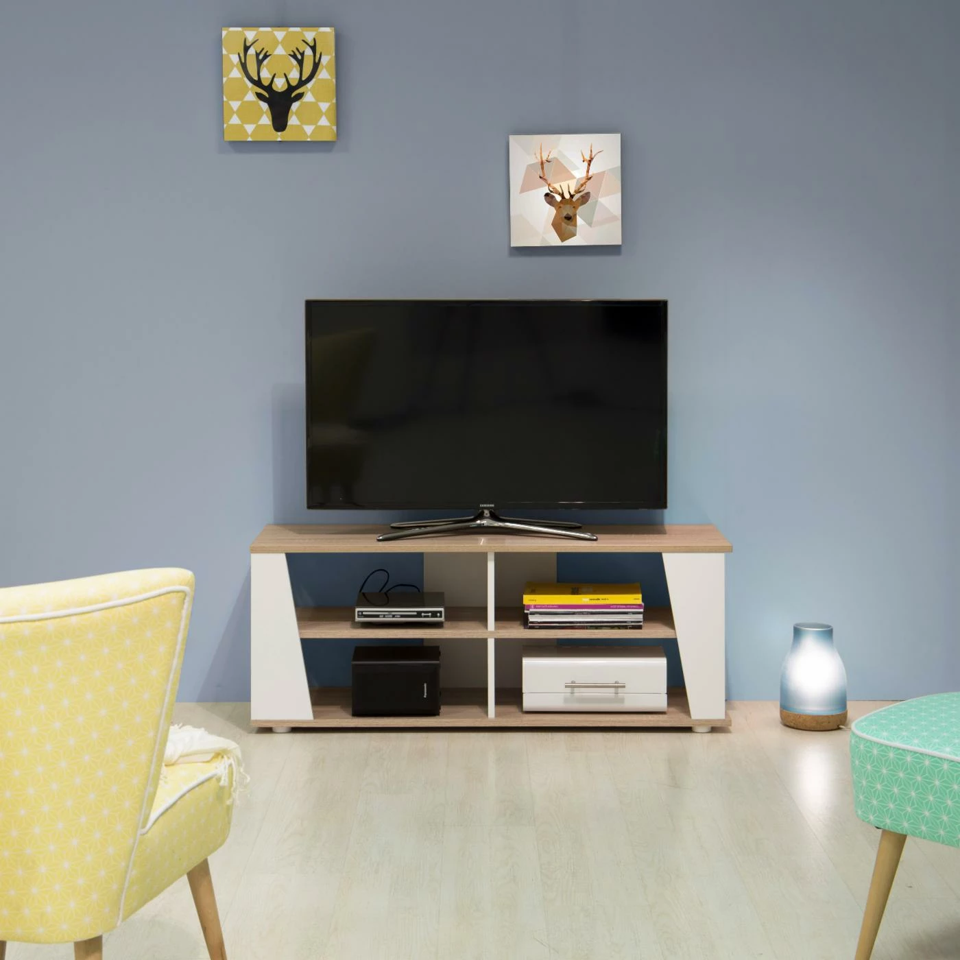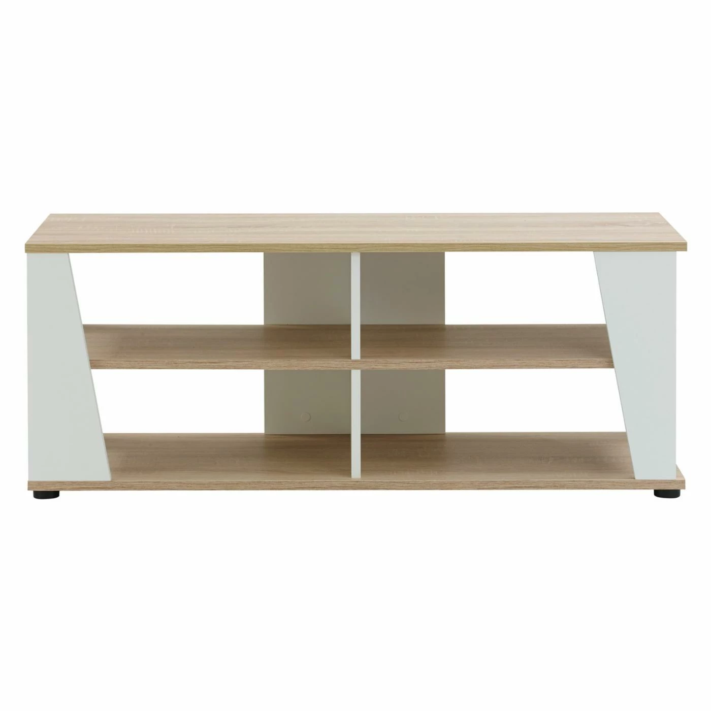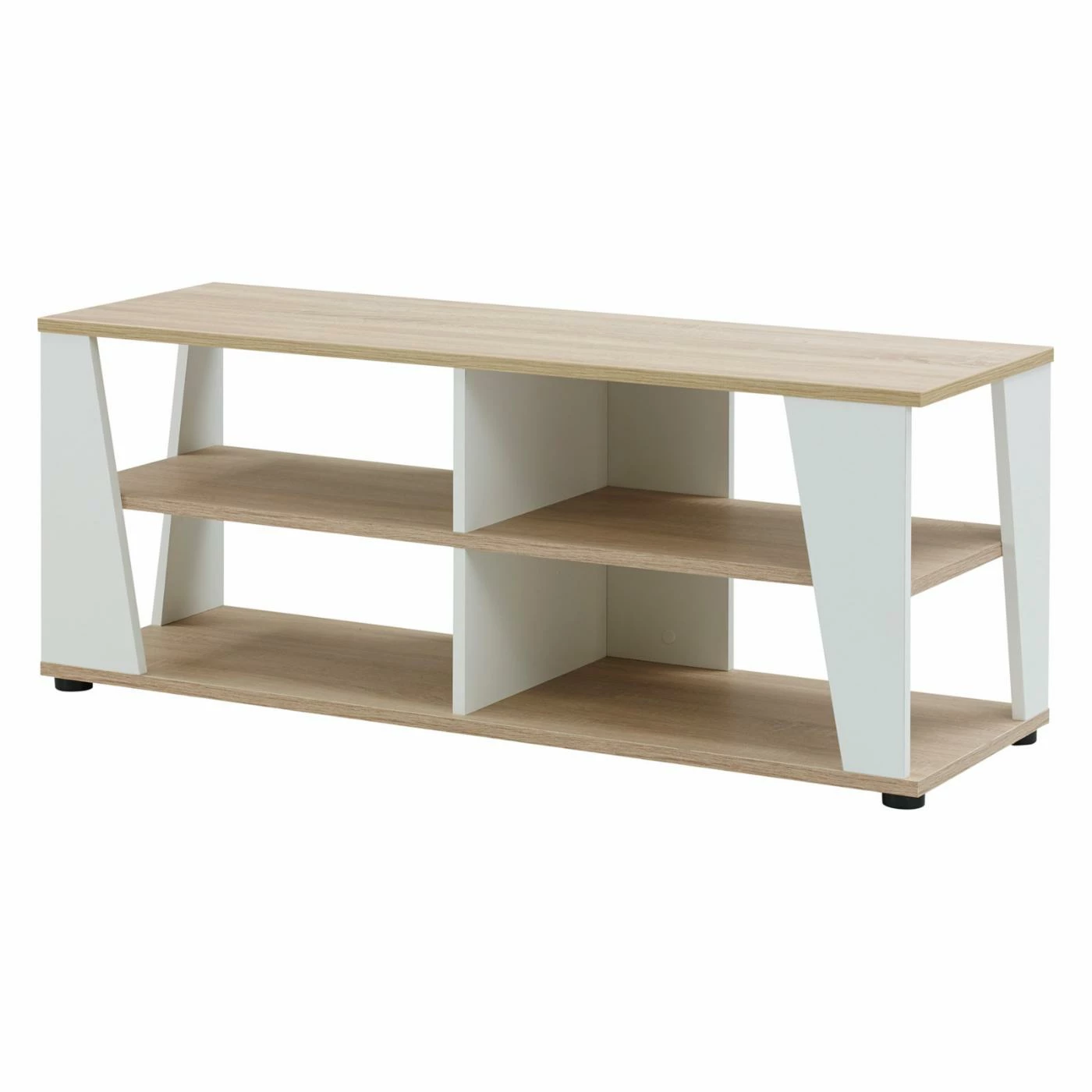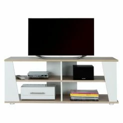 The Diagone Origami TV Stand‘s open back means it can hold electronics (such as televisions, DVRs, or gaming consoles) just as easily as display your favorite books or decorative objects. This media cabinet can accommodate most 52-inch TVs (or smaller). The two-toned oak veneer and matte white finish and the tapered panel legs are inspired by Scandinavian design.