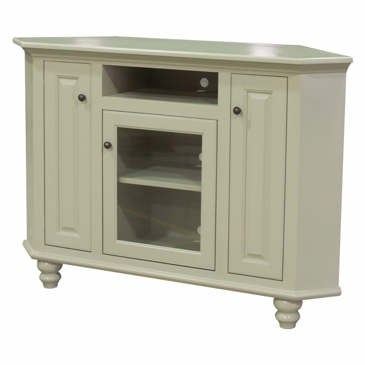 Utilize the unused space in your home with the Eagle Furniture 58 in. Orleans Corner Entertainment Console. This uniquely designed entertainment console tucks into the corner of your room, providing a place for your flat screen and storage for your electronic equipment and accessories. It’s solidly constructed from furniture-grade birch in your choice of available finish and includes two raised-panel door cabinets, a glass door cabinet, open component shelf, and a cord-organizing back panel to keep wires neat and tidy. The beautifully turned bun feet lend an elegant base to this versatile design.