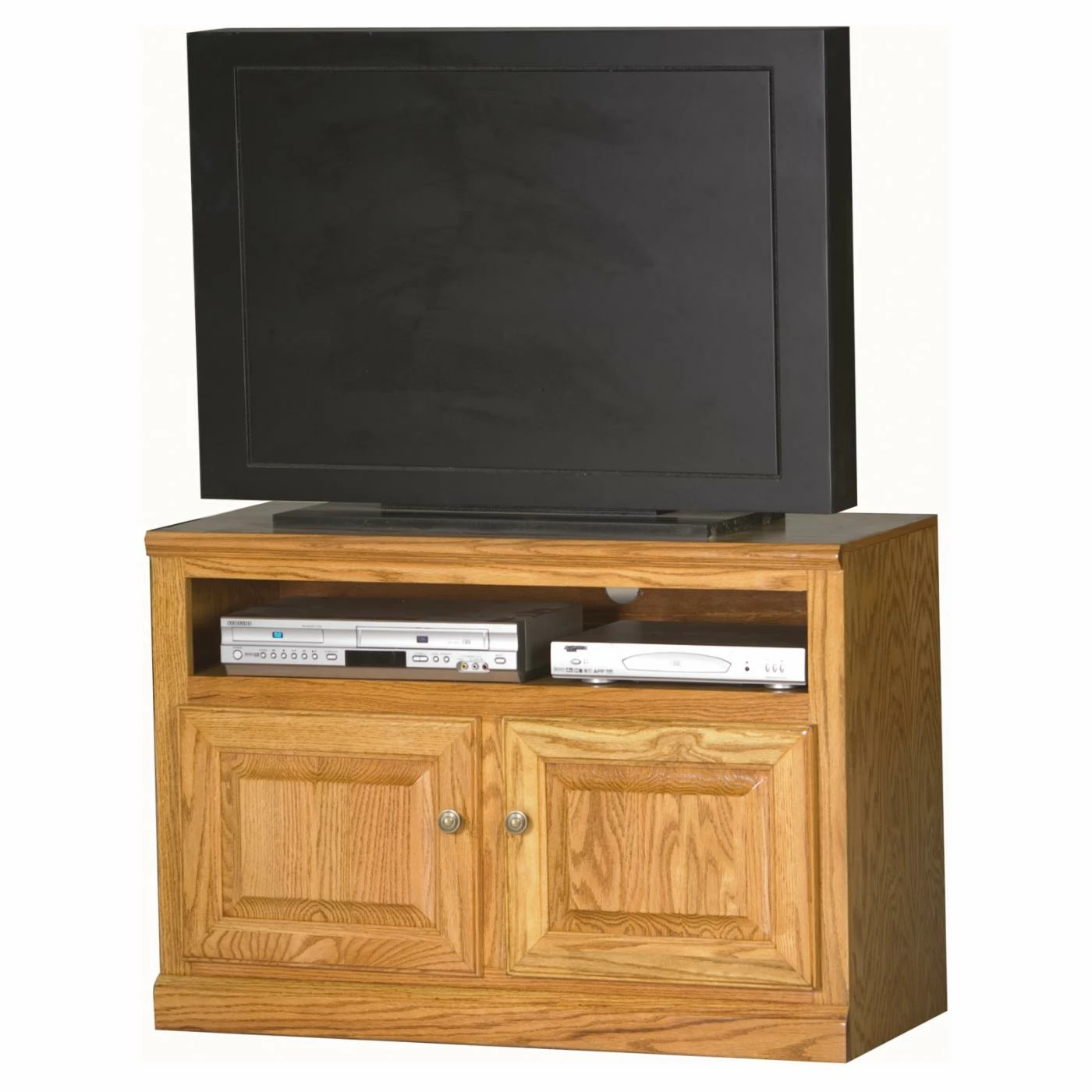 The Eagle Furniture Classic Oak Customizable 39 in. TV Stand combines classic styling and longevity beautifully. Constructed of American oak hardwood, this transitional piece can hold most TVâs up to 43 inches wide. It features decorative crown molding and antique brass hardware on each door. Open shelving and ample storage space behind two panel doors ensures neat organization for your console and media accessories. Made in America.