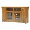 Simplistic organization is key with the Eagle Furniture Classic Oak Thin 66 in. Tall Entertainment TV Stand. This enduring TV stand is durably constructed of American oak hardwood. Holding most TVs up to 73W in., this handy stand features two open top shelves ideal for placing your DVD players or receiver. Open storage space is provided behind two plain glass, wood-framed doors perfect for displaying collectibles and knickknacks of any kind. The included two raised-panel doors open up to fixed shelves, offering ample space for media accessories. Antique brass hardware is included, completing the look and feel of this American-made TV stand. Variety of finish options available.
