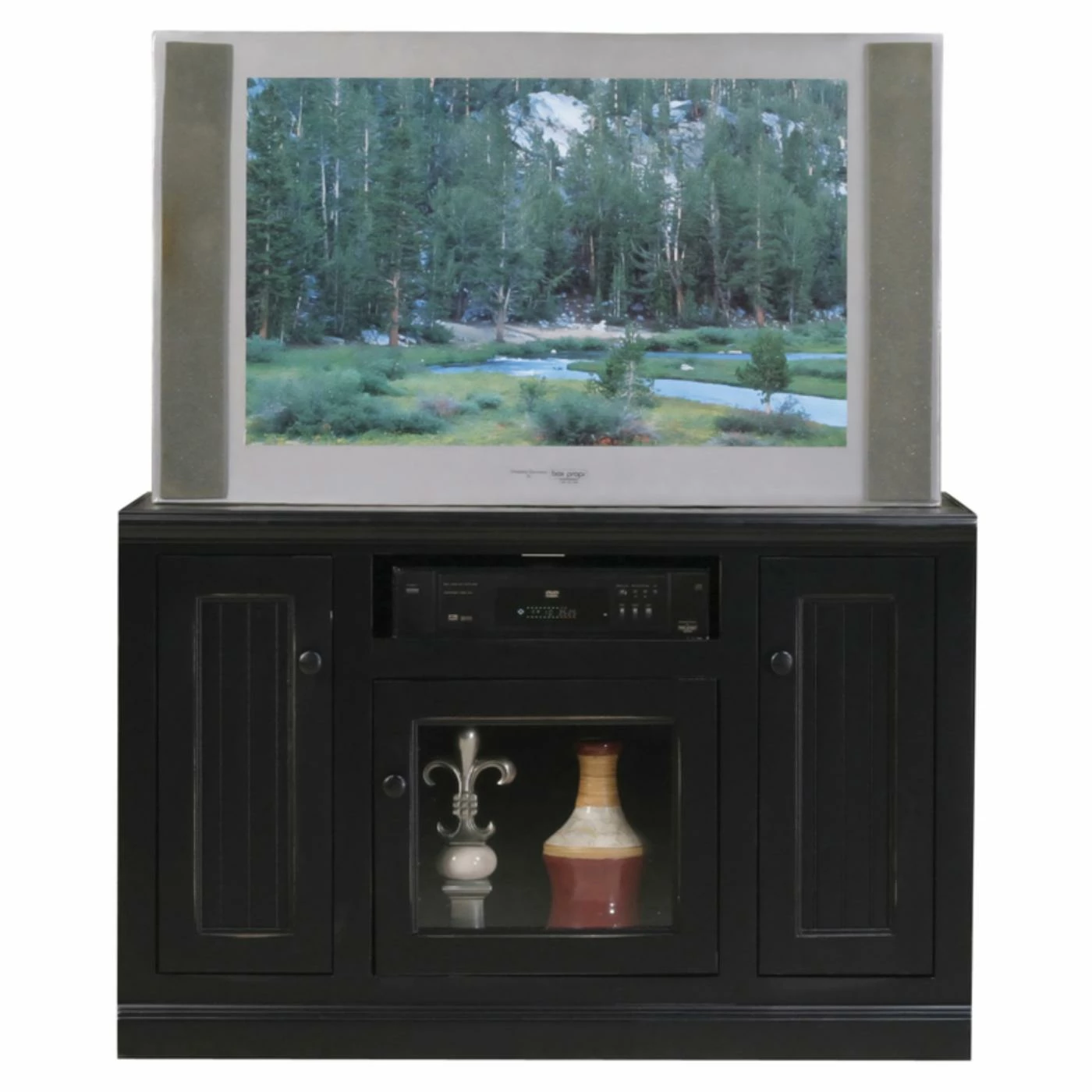 A combination of casual style and smart media storage makes the Eagle Furniture Coastal 45 in. Tall TV Stand perfect for your home. This birch wood TV stand comes in a variety of finish options and accommodates up to a 49-inch flat panel TV. One media opening and a remote control-friendly glass panel door offer component storage. The two beadboard panel doors open to reveal one fixed shelf behind each.