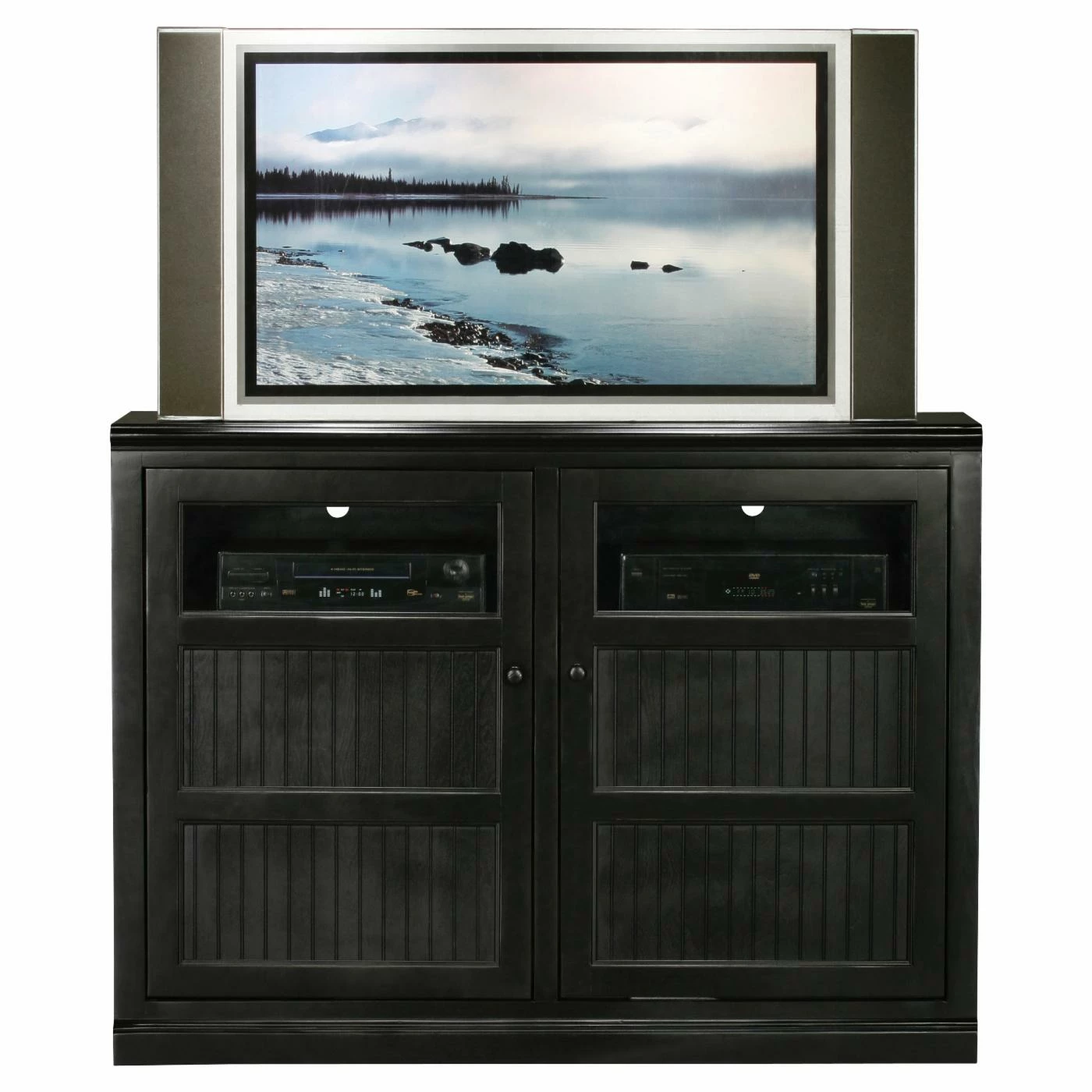 Perfect for your casual home theater, the Eagle Furniture Coastal 55 in. Flat-Panel Entertainment Center has two beadboard panel doors and comes in a wide variety of finish options. It holds up to a 61-inch flat-panel TV on top and offers ample storage within. At the top, each door has a remote control-friendly glass panel that houses media components. Wire-management holes keep cords tidy. Behind the doors you’ll find fixed wood shelves.