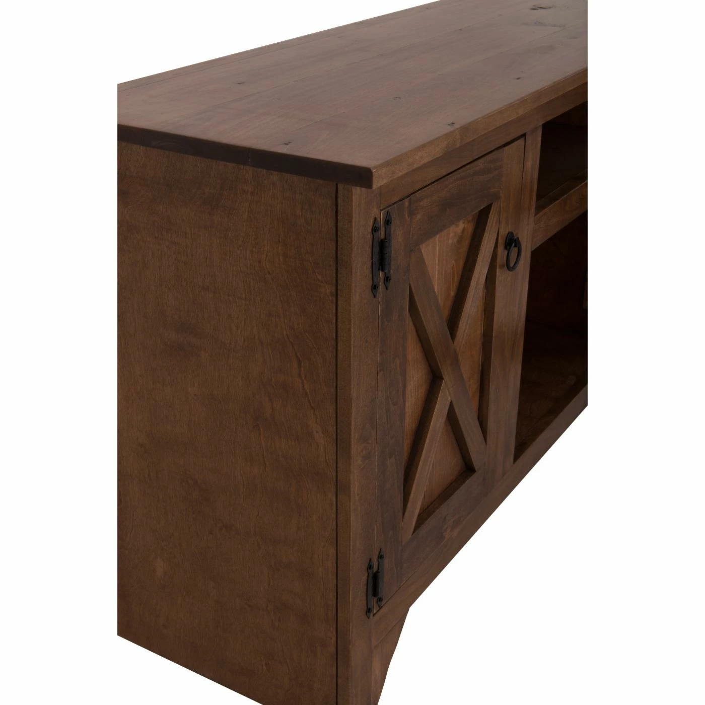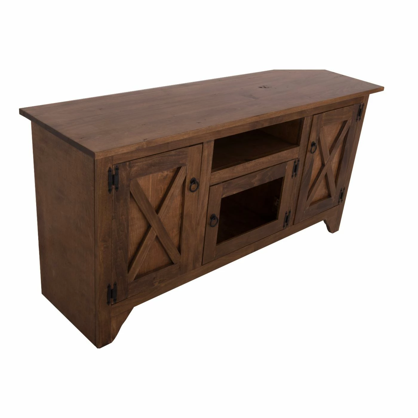 Complete your rustic living room with the Eagle Furniture Farm House TV Stand with 3 Doors. Handsomely crafted, this piece boasts a shelf behind each farmhouse style door, an open shelf with built-in cord control, and a bottom glass cabinet. Great for game consoles, media devices, remotes, books, and more, this TV stand helps you keep your living room neat and organized. Crafted from pine wood for lasting durability, this TV stand can withstand years of regular use. With a selection of available finishes to choose from, itβll blend seamlessly with your current furnishings. Able to hold most TV screens up to 59.5-inches wide, youβll love being able to have a large screen in your living room or family room.