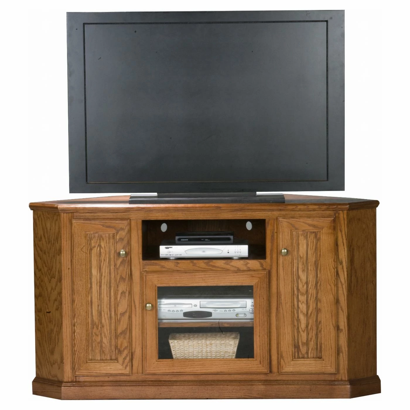 Keep your media consoles and accessories nice and neat within the Eagle Furniture Heritage Customizable 56 in. Tall Corner TV Stand. American-made, this enduring piece is constructed of American oak hardwood and comes in a variety of finish options. This TV stand comes with ample storage space behind two bead board doors and one plain glass wood-framed door; it also boasts open shelving. A fixed shelf is placed behind the glass door, offering ample display space for your collectibles and knickknacks. Decorative crown molding and antique brass hardware complete the look of this piece. Holds most TVโs up to 62W in.