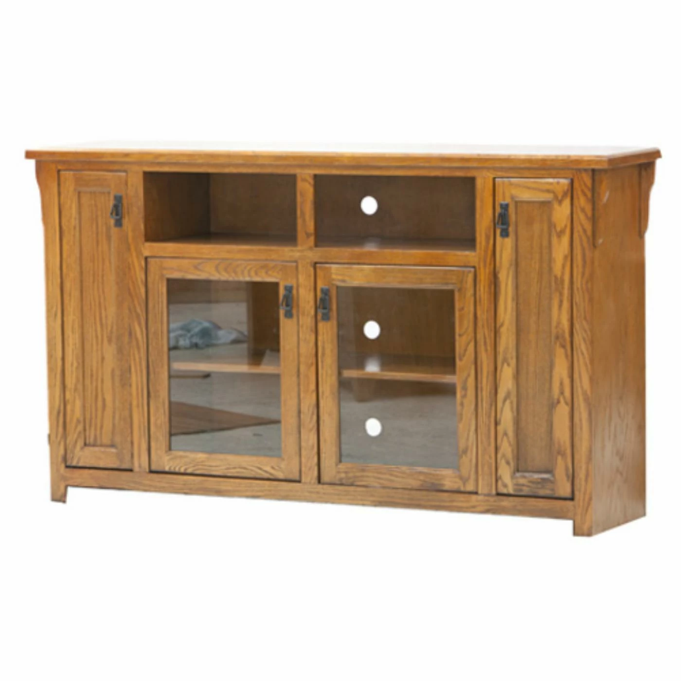 A combination of classic mission style and ample media storage make the Eagle Furniture Mission 66 in. Wide TV Stand perfect for your home. This TV stand is made of birch, comes in a wide variety of finish options, and has decorative mission style hardware. It holds up to 78-inch TV on top. An wide, open shelf houses media components. Two wood framed glass panel doors open to reveal a fixed shelf behind each. Wire management lives at the back to keep cords tidy. Two wood panel cupboard doors open to showcase one fixed shelf behind each.