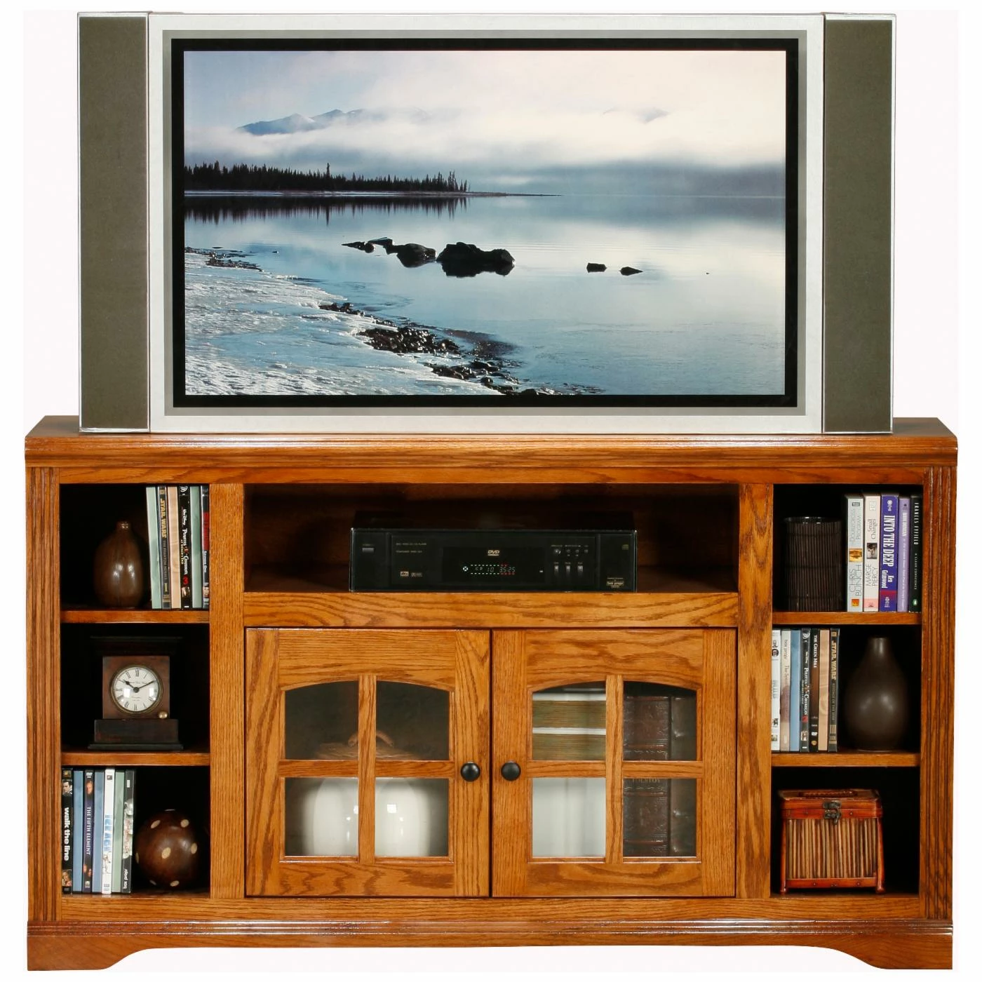 The Eagle Furniture Oak Ridge 55 in. Plain Glass Thin-Screen TV Stand gives your entertainment space a touch of transitional style. This stand is made of sturdy oak with finish options to match your decor. Open shelving lets you easily showcase games, movies, or books. A single open-top shelf as well as shelves behind dual glass-panel doors provides plenty of room for audio and video components.