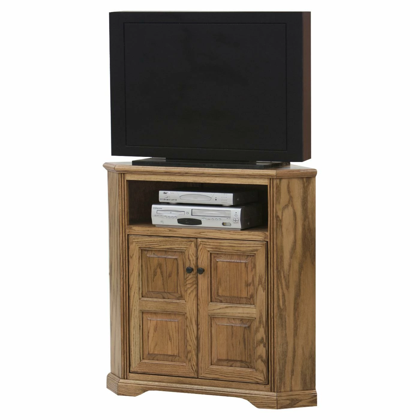 This Eagle Furniture Oak Ridge Customizable 41 in. Raised Panel Corner TV Console is the perfect spot to display your TV set. Capable of supporting most TV sets up to 45 in. wide, it boats solid wood construction and is available in your choice of finish. Two raised wood panel doors and a fixed shelf serve as the perfect places to store electronics, remotes, and any other household items.