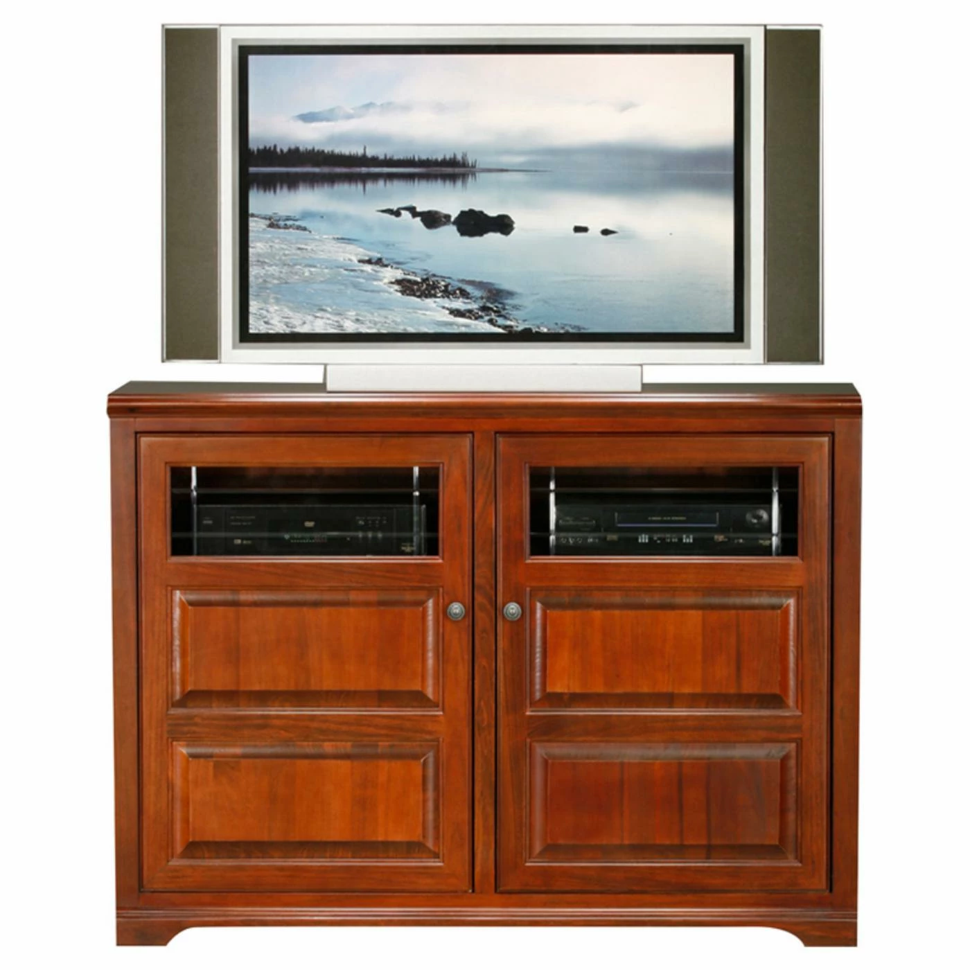 With the details and a wide variety of finish options available, the Eagle Furniture Savannah 55 in. Flat-Panel Entertainment Center makes it easy to find the right one for you. A handsome wood entertainment center, this one features raised-panel doors, detailed glass panels, and coordinating knob hardware. On top, it accommodates flat-panel TVs up to 61W in. Two decorative glass panels allow remote control access to the media components within. Wire-management holes at the back keep cords tidy. Two wooden raised-panel cupboard doors open to showcase fixed wood shelves.
