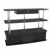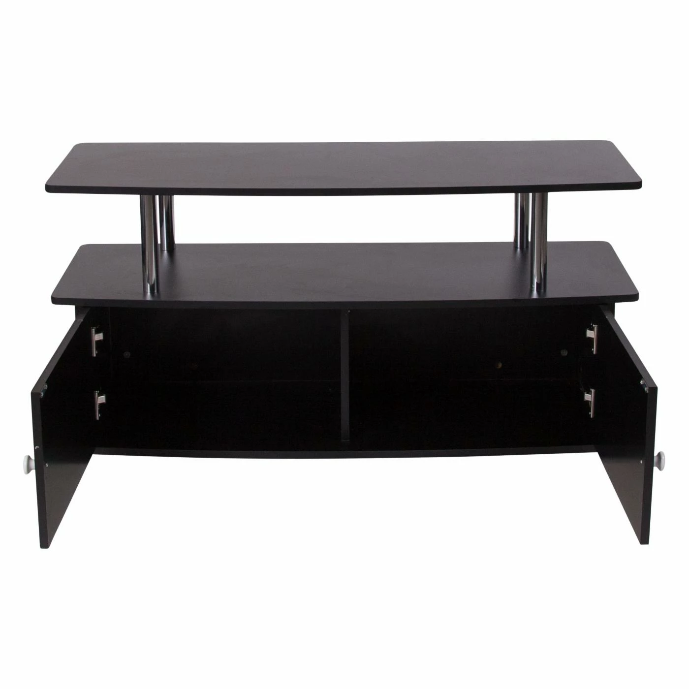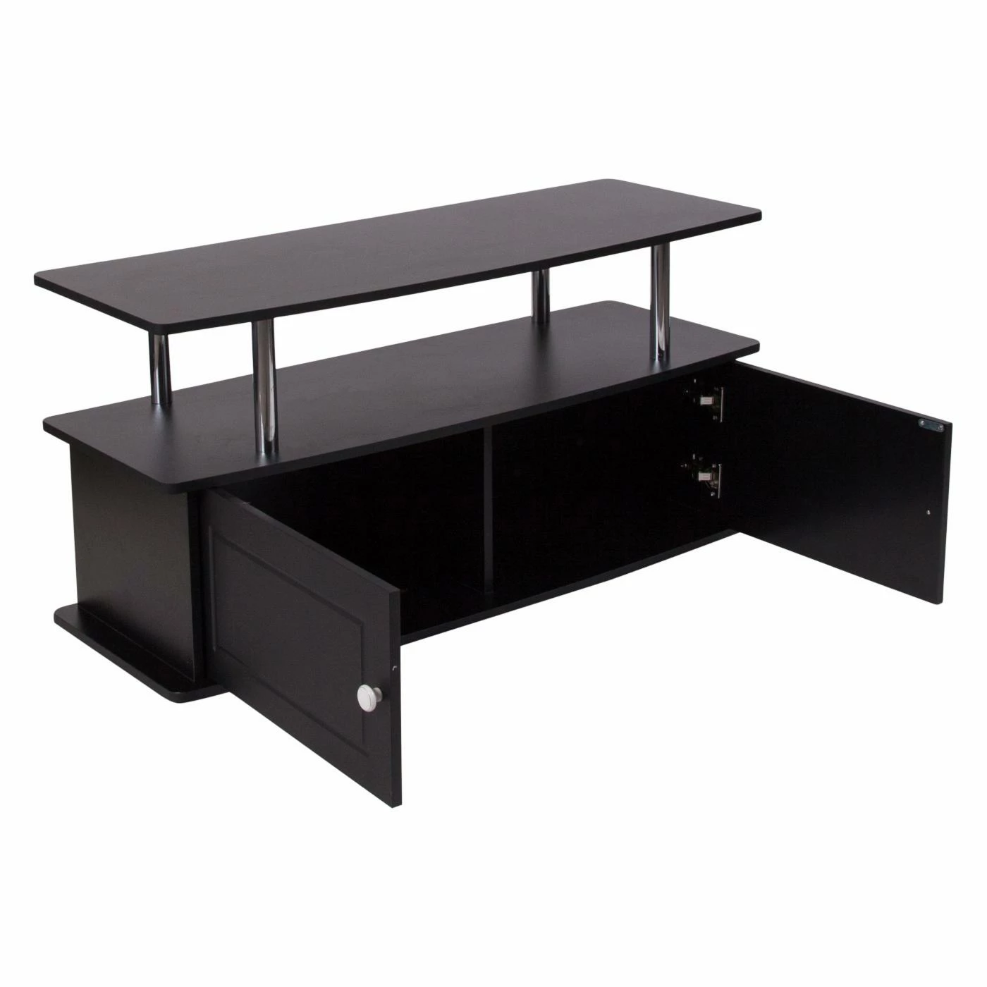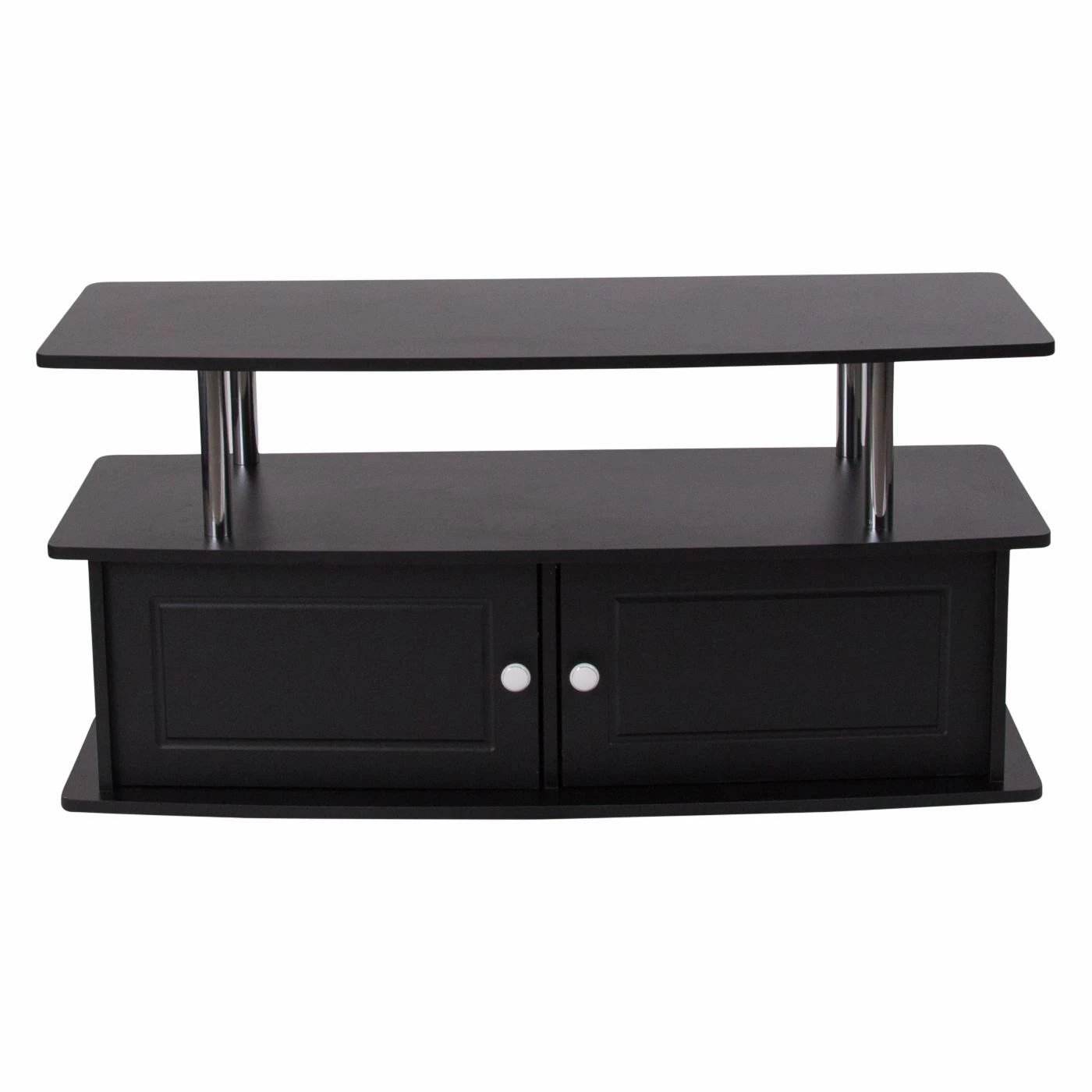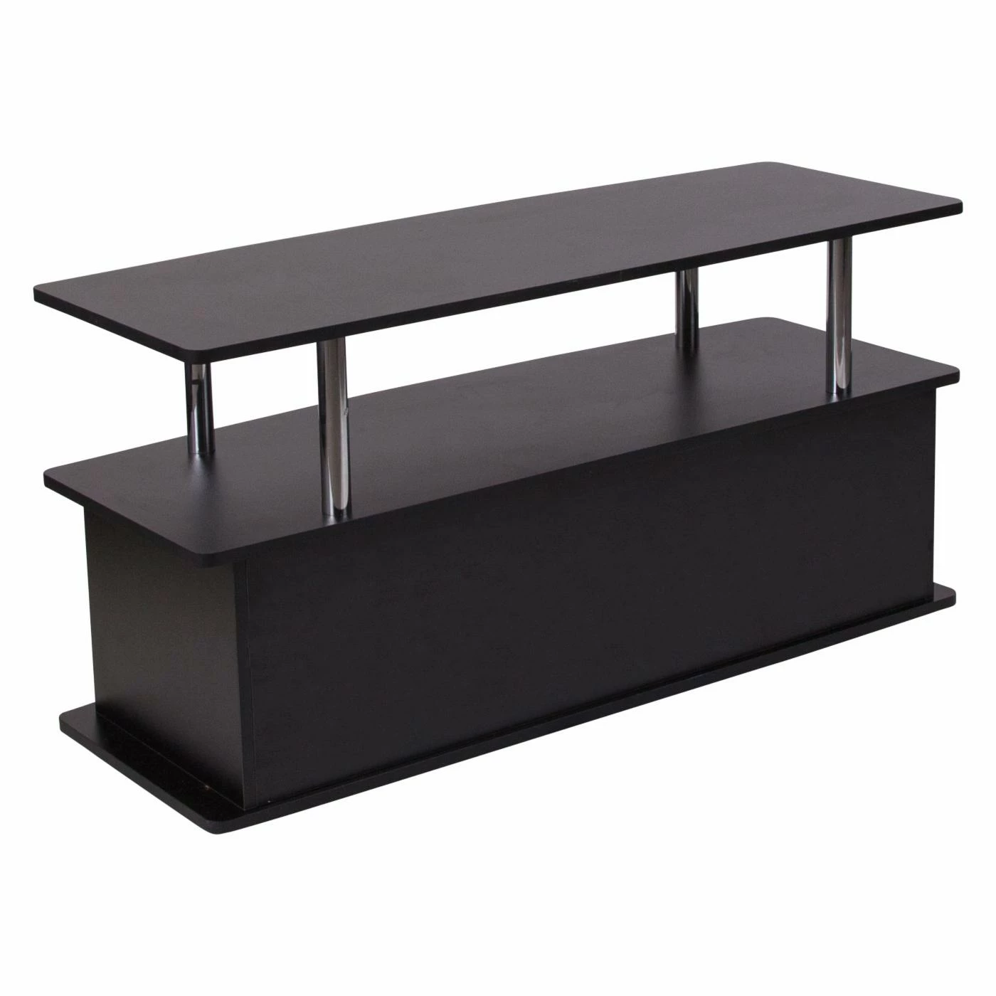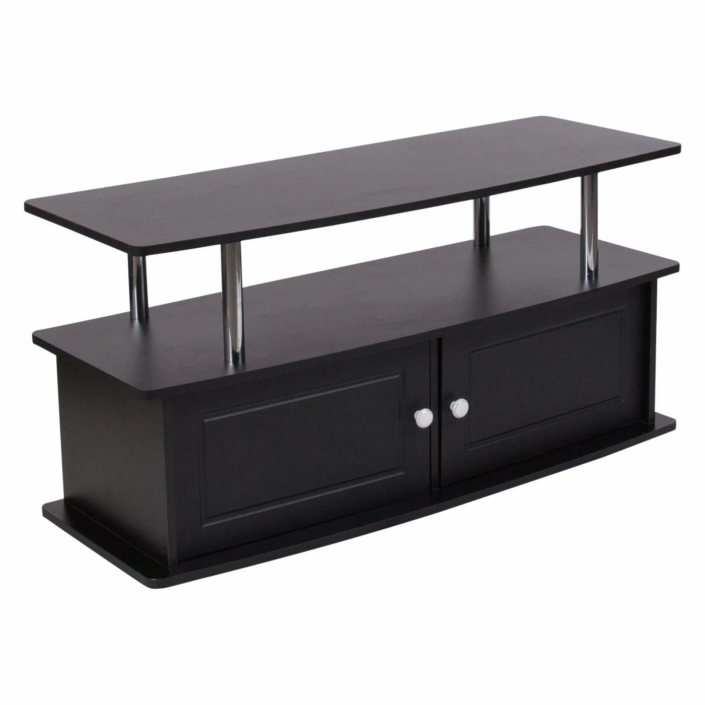 Complement your new contemporary living room with the Flash Furniture Evanston TV Stand for a stunning centerpiece that offers ample storage space. This TV stand features large base with two spacious cabinets, perfect for organizing your movie collection, video games, and more. An open console shelf makes installing stereo components, media players, and cables boxes a snap. The piece is built from hardy engineered wood and finished in black. The top shelf is perched on round, polished stainless steel supports.