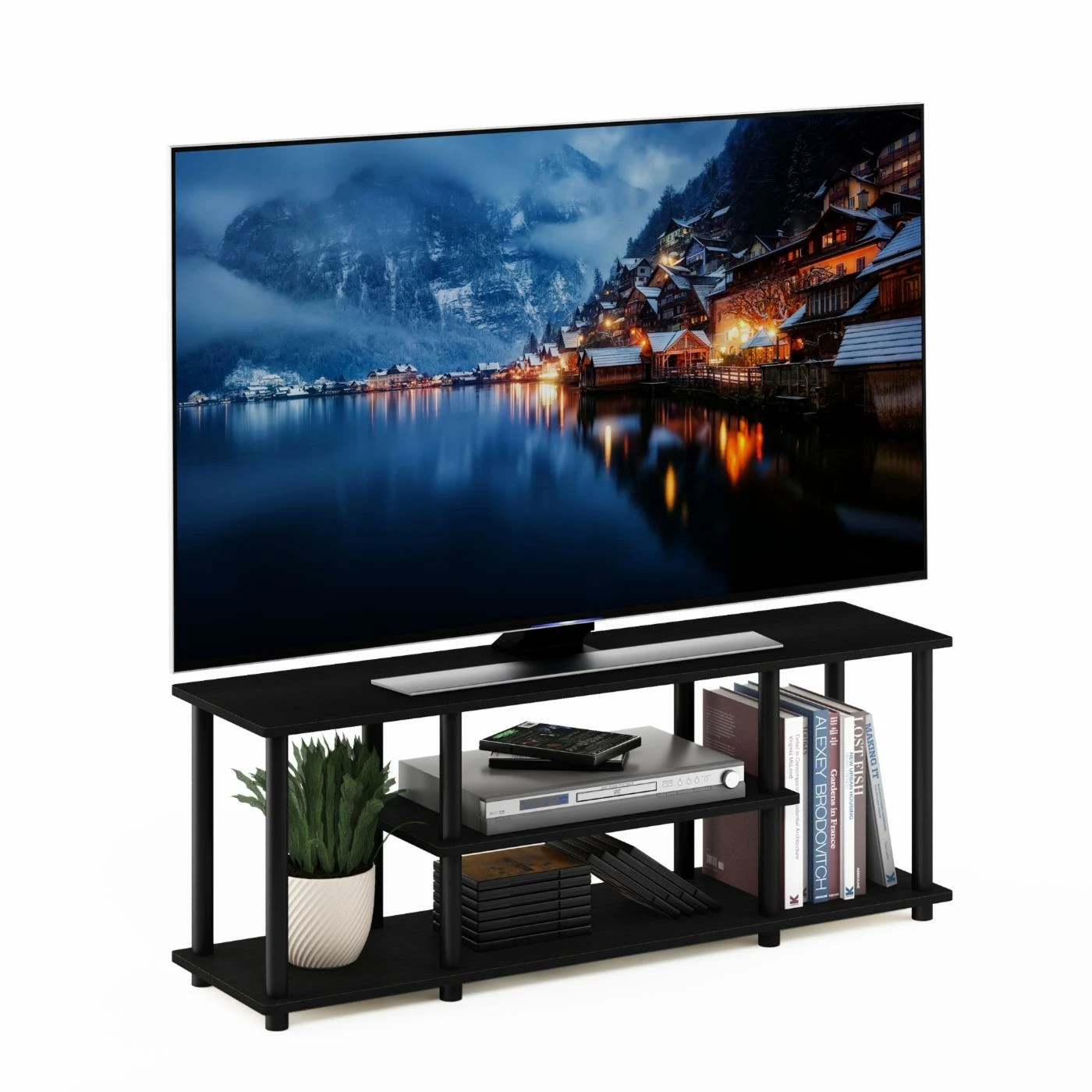 Get simple, savvy storage with the Furinno Turn-N-Tube No Tools Entertainment Center. Sleek, architectural design makes this TV stand striking and functional. Three open-storage shelves are ideal for organizing electronics or media, and the stand accommodates TVs up to 47 inches wide. No-tools assembly means anyone can build this stand in a flash. This stand is as smart as it is functional thanks to its primarily recycled-material construction. Stylish and unfussy, this stand is an ideal storage solution for any living room or den.