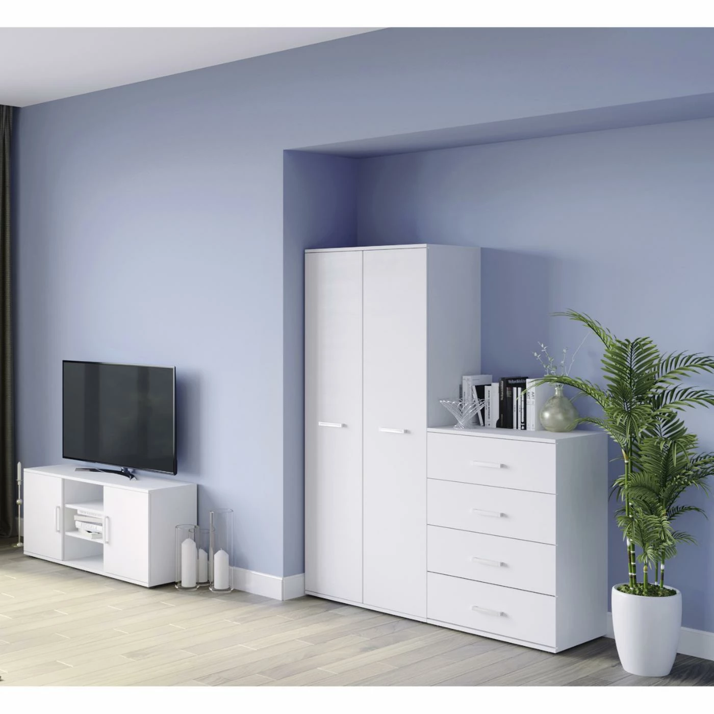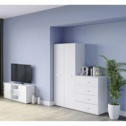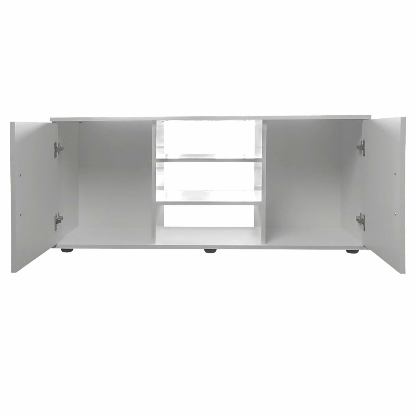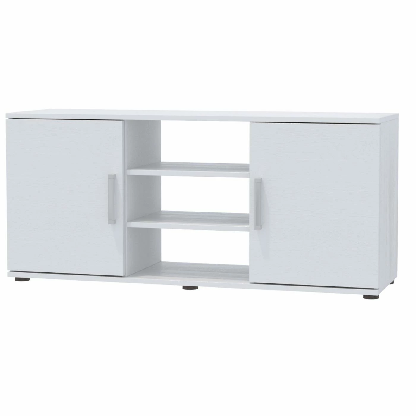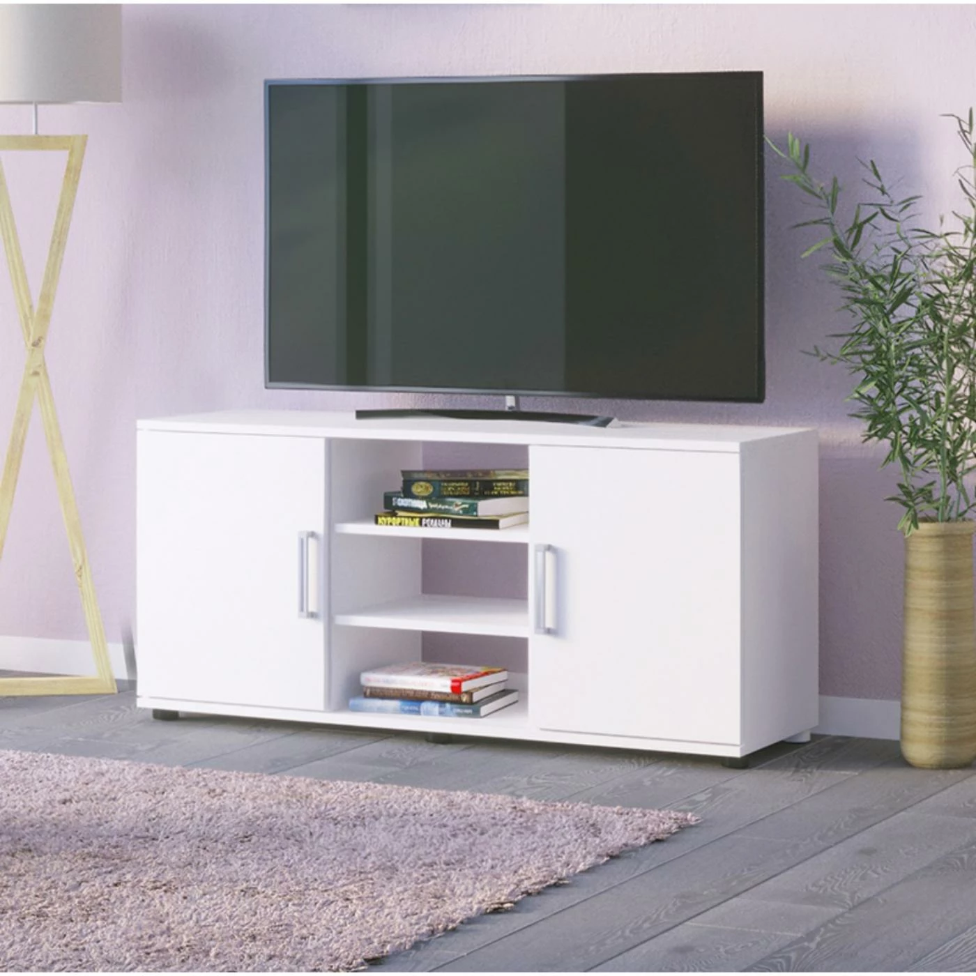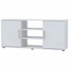 The Furniture.Agency Nuvole TV Stand – White is constructed in a rectangular shape with a minimalistic look. 2 large cabinets on each side and open shelving in the middle provide enough storage for your devices. This product accommodates TVs up to 55 in., manufactured with premium-grade particleboard and has superior quality.