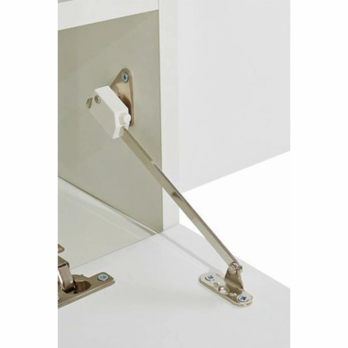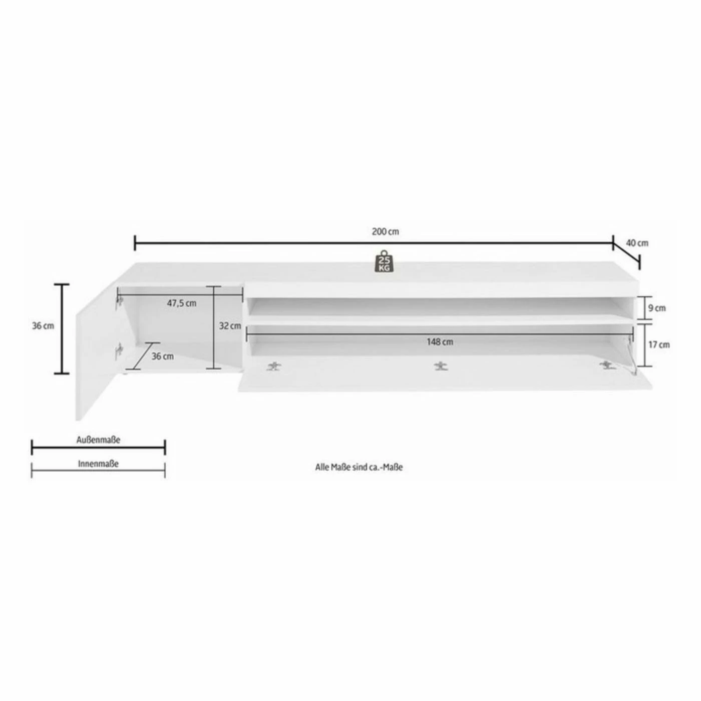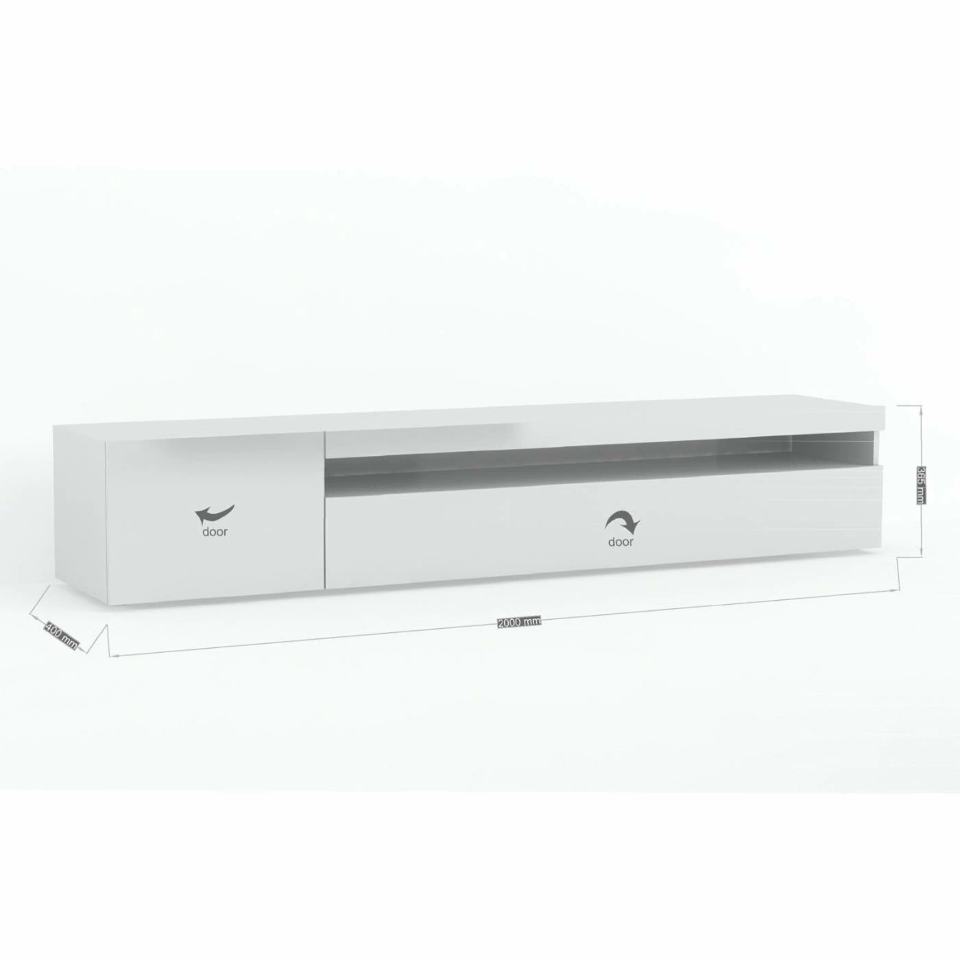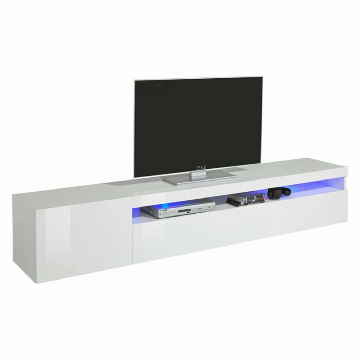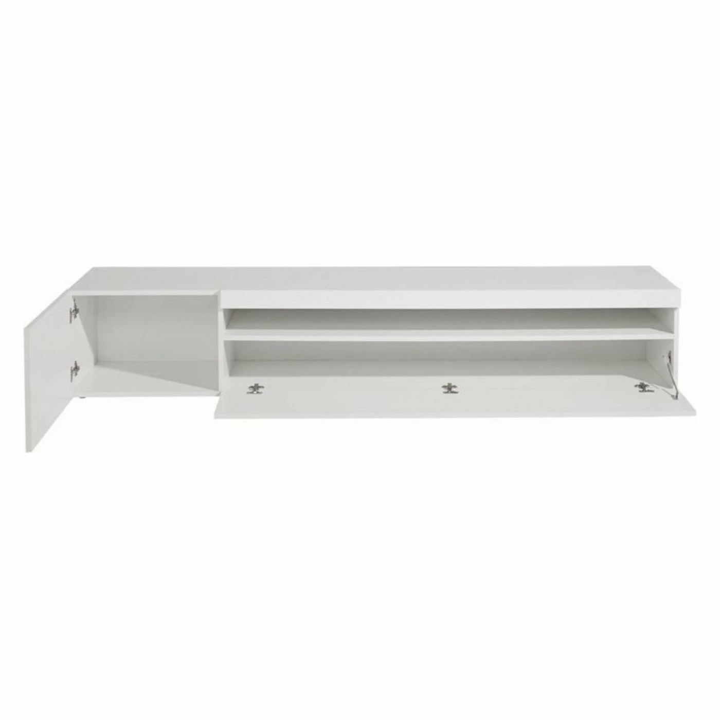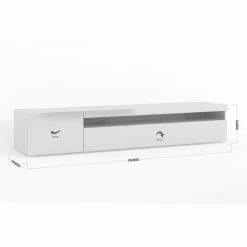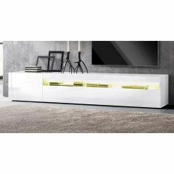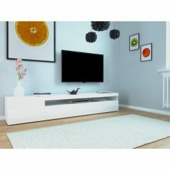 The Furniture.Agency Potenza Low Profile TV Standβs subtle asymmetry strikes the perfect balance between design and dutiful storage. This long, low-lying TV stand is durably crafted with engineered wood and combines both open and concealed storage spaces to maximum organizing effect. The fresh, white-finished unit boasts two high-glossed doors: On one side, a cabinet door swings outward; beside it, a wide door along the base drops down. Stack movies, music, and games inside. An open shelf runs along two-thirds of the unit and is ideal for electronic consoles. Prop your TV and a few objects on top, and then just enjoy. Assembly is required. A manufacturerβs one-year warranty is included.