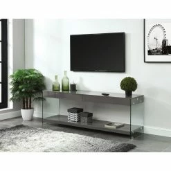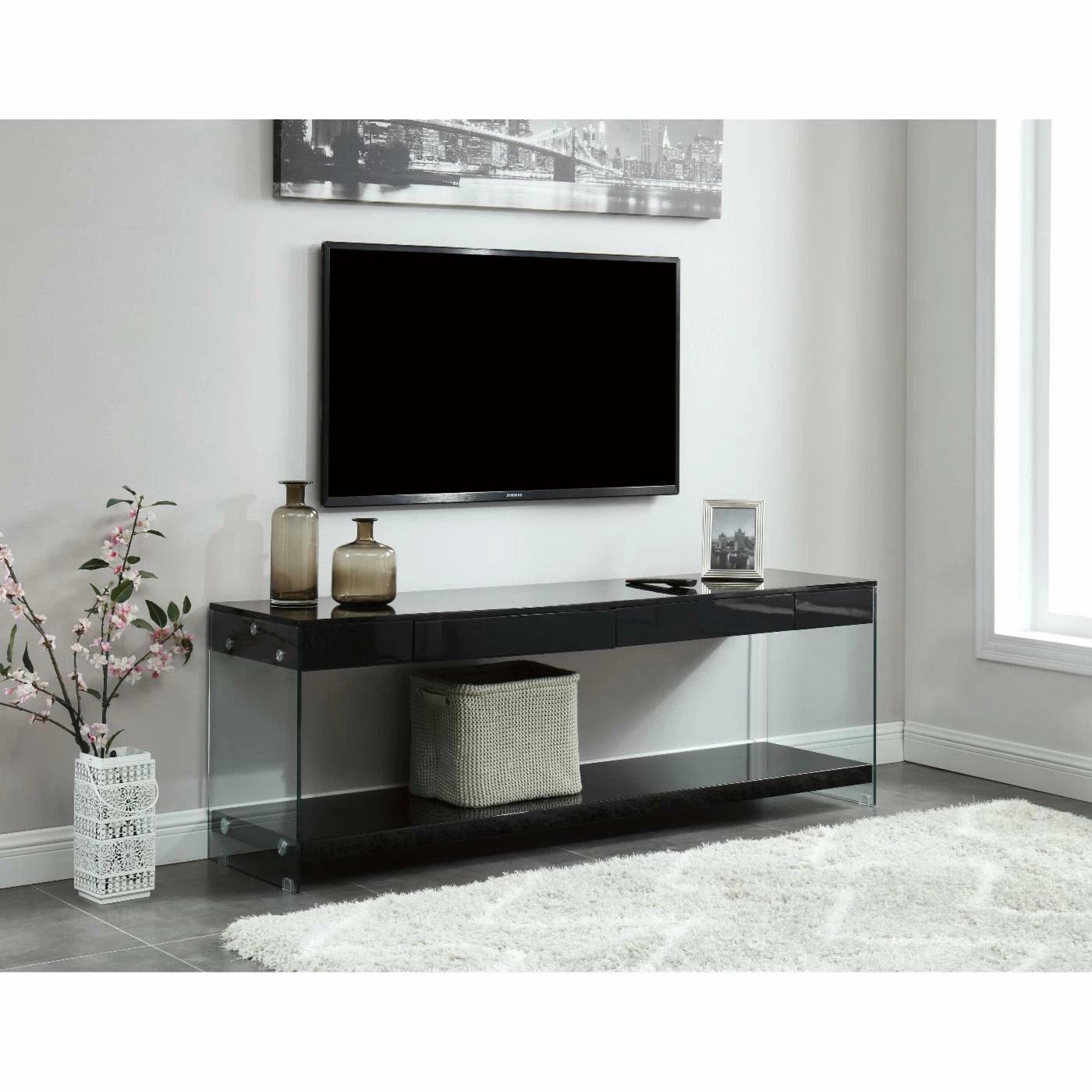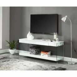 The future of entertainment is here, and it is the Furniture of America Cavalier TV Stand. Constructed of glass support panels, metal hardware, and wood, this credenza offers modern style and utility. Choose from available sizes as suits your needs. The entertainment unit can support most TVs up to 65 inches in size. Featuring open storage considerations inspired by Scandinavian design, this TV stand has an open bottom shelf, and either one or two hideaway drawers, depending on size. This means there’s plenty of space for books, magazines, video games, movies, or anything that strikes your fancy. For a customized look, choose from available finishes.