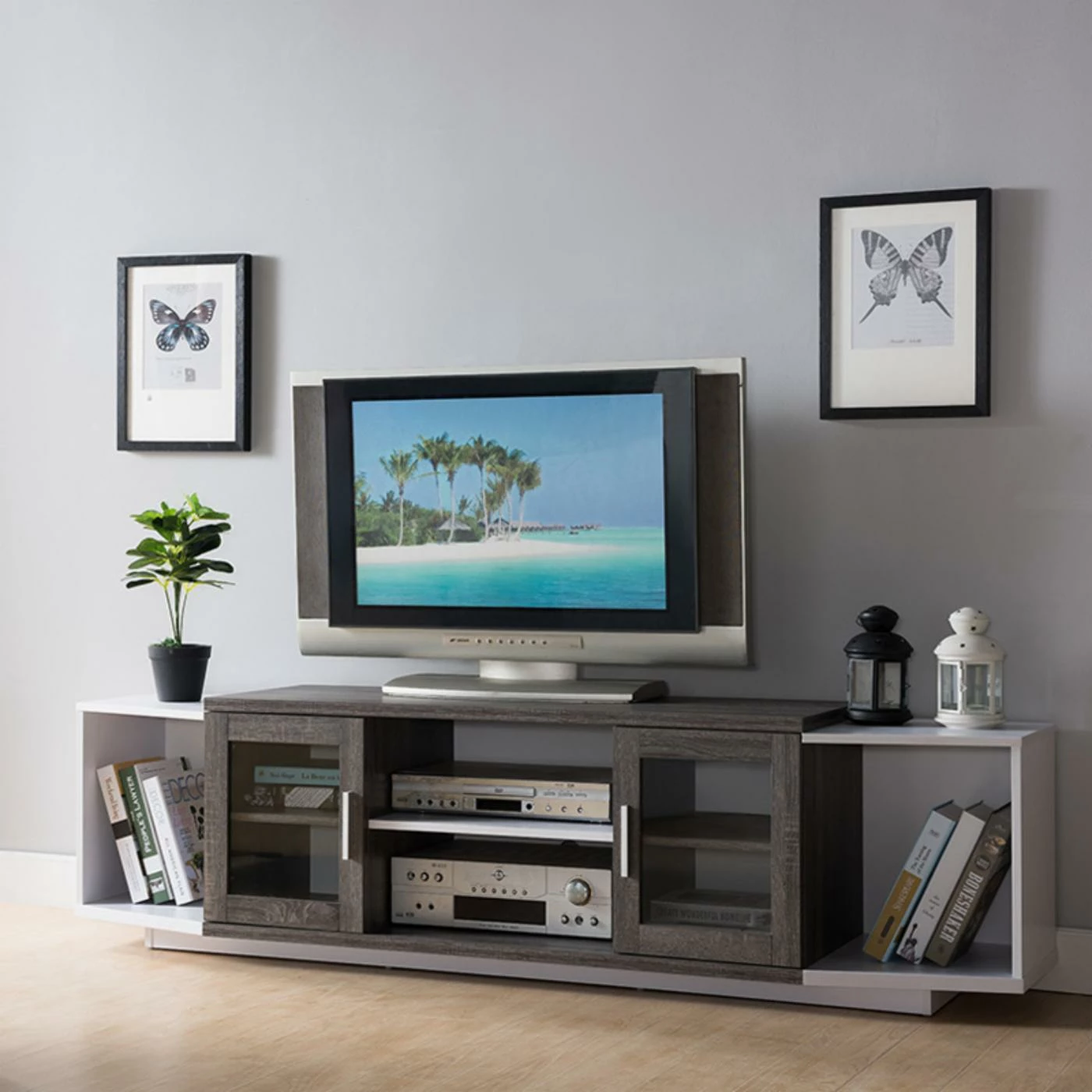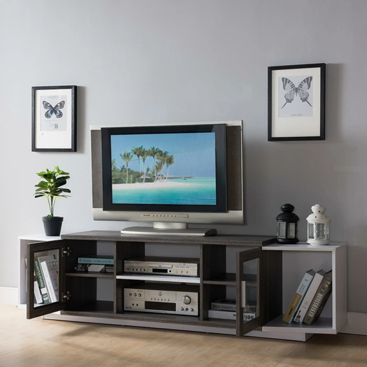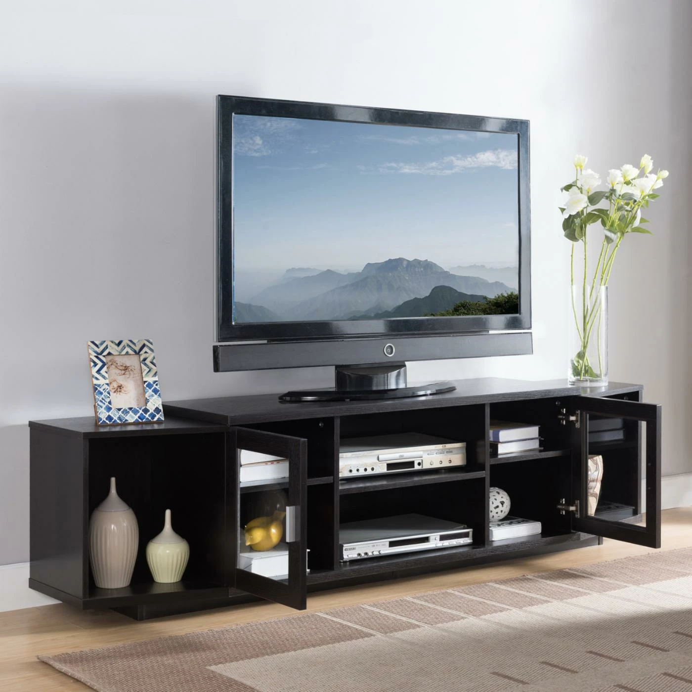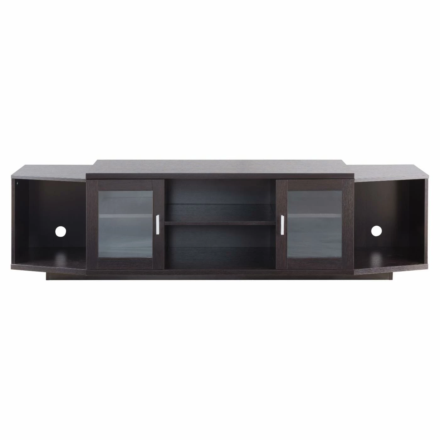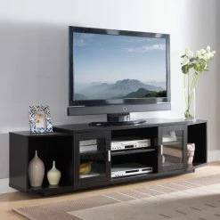 Give your living room a make-over with the Furniture of America Daytona Glass Cabinet TV Stand. This wide TV stand comes with plenty of storage space for all your media and accessories. The center features two open-backed console shelves with a single-door cabinet on either side. Each cabinet has a framed, clear glass door with an inner shelf. At either end is a canted open shelf for additional storage and display. The unit is constructed from engineered wood. Select among available finish options.