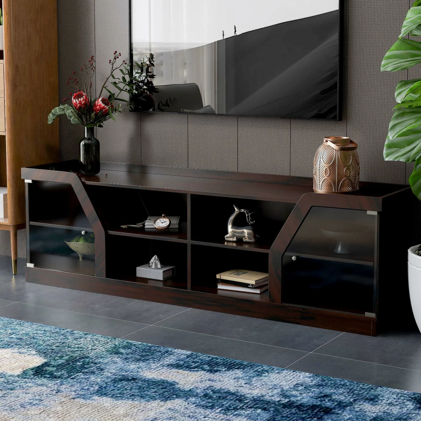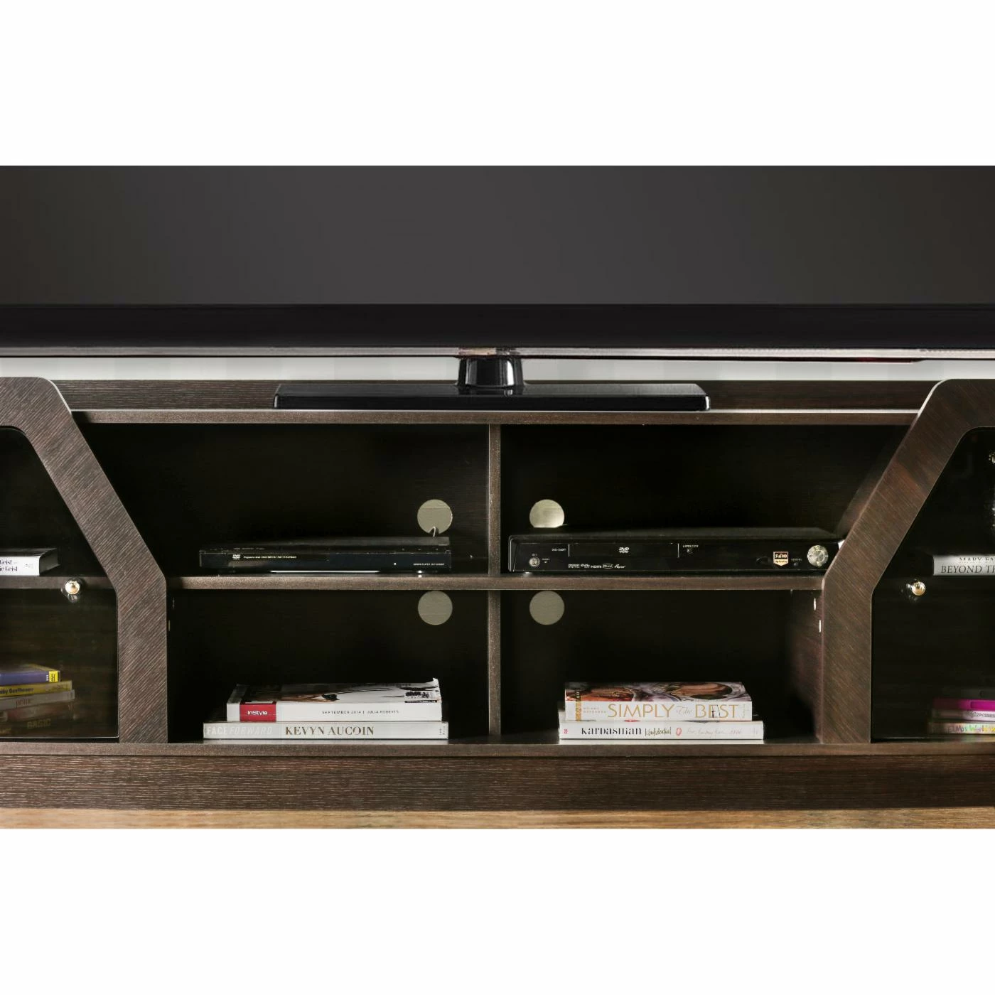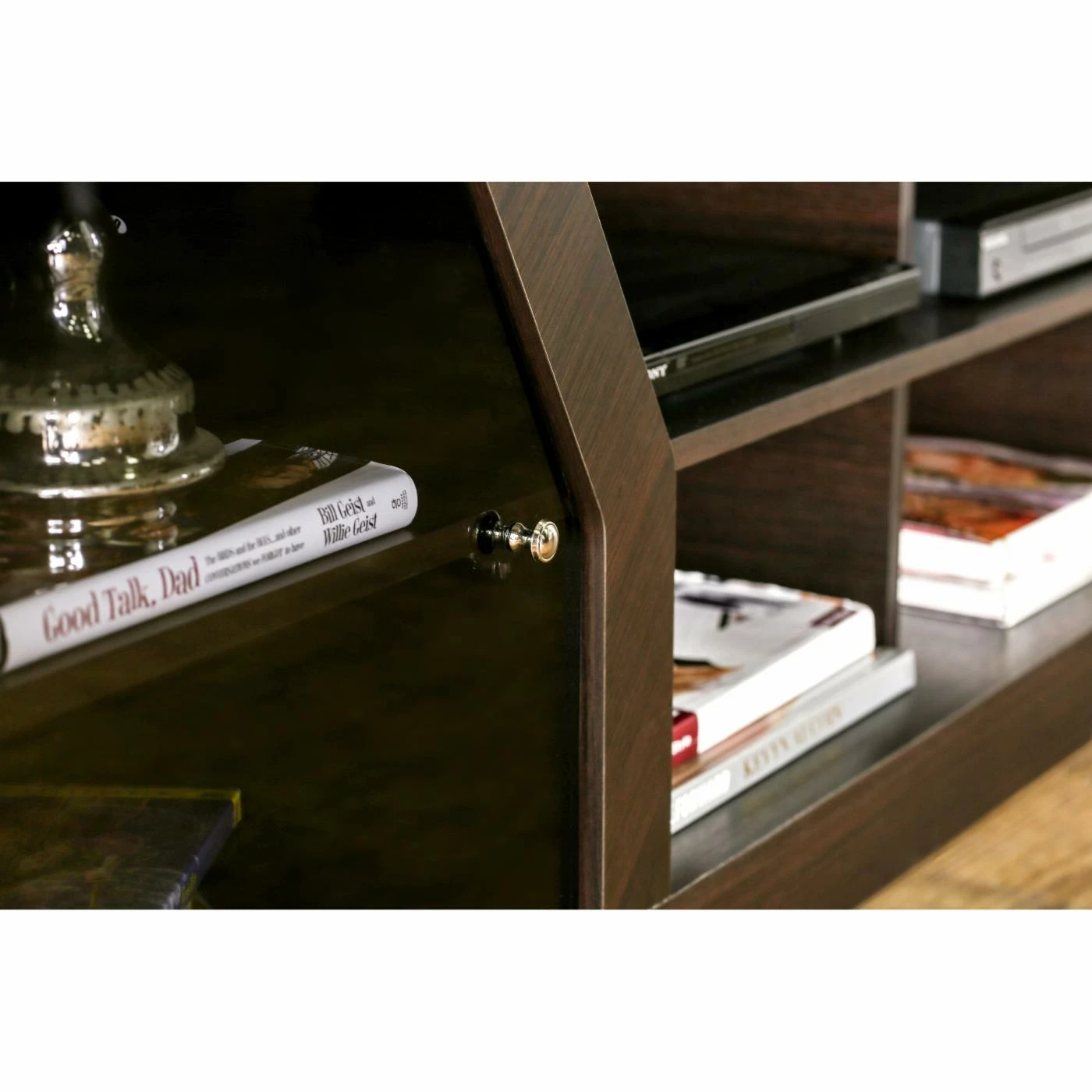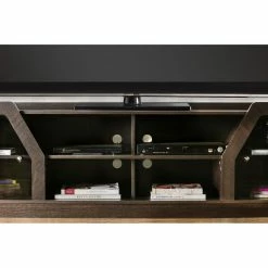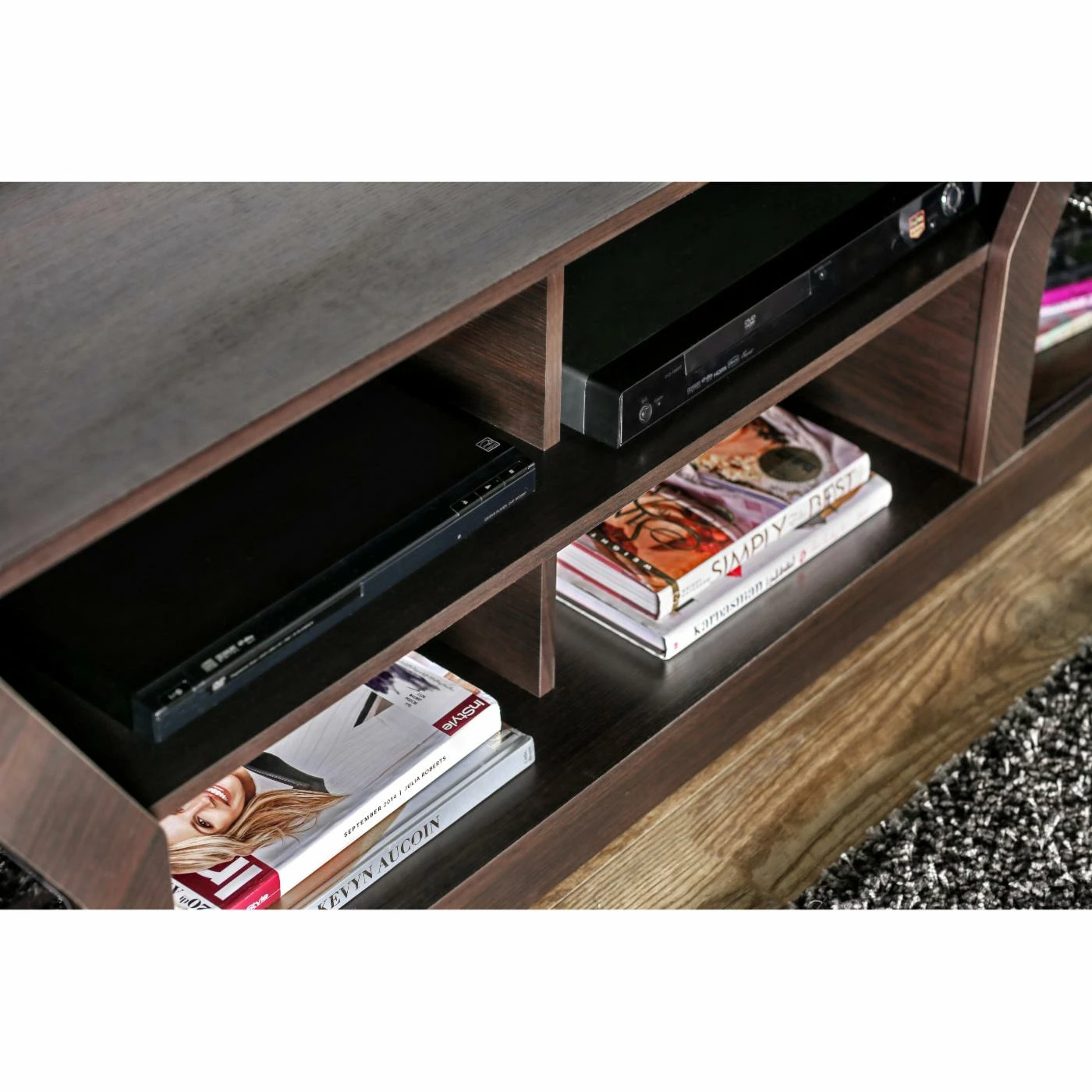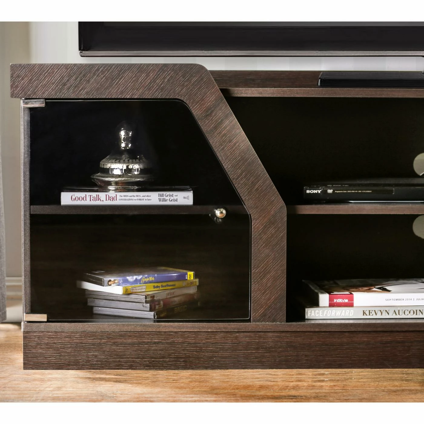 Do something different and add the Furniture of America Millburn TV Console to your space. A modern form gets a dash of visual spice with those angular front compartments covered with smoked glass. A quartet of open storage areas give you all the room you need for cable boxes, gaming consoles, and various AV components. The body is crafted from a robust mix of solid hardwood and medium-density fiberboard (MDF) that gets a sleek finish with the exterior of espresso-toned wood veneers.