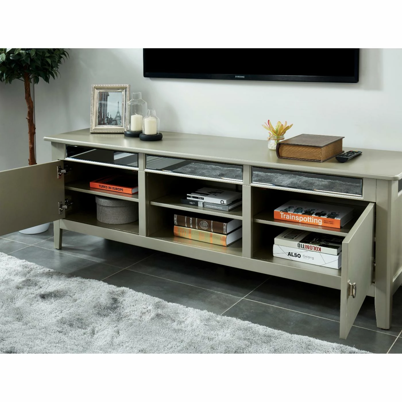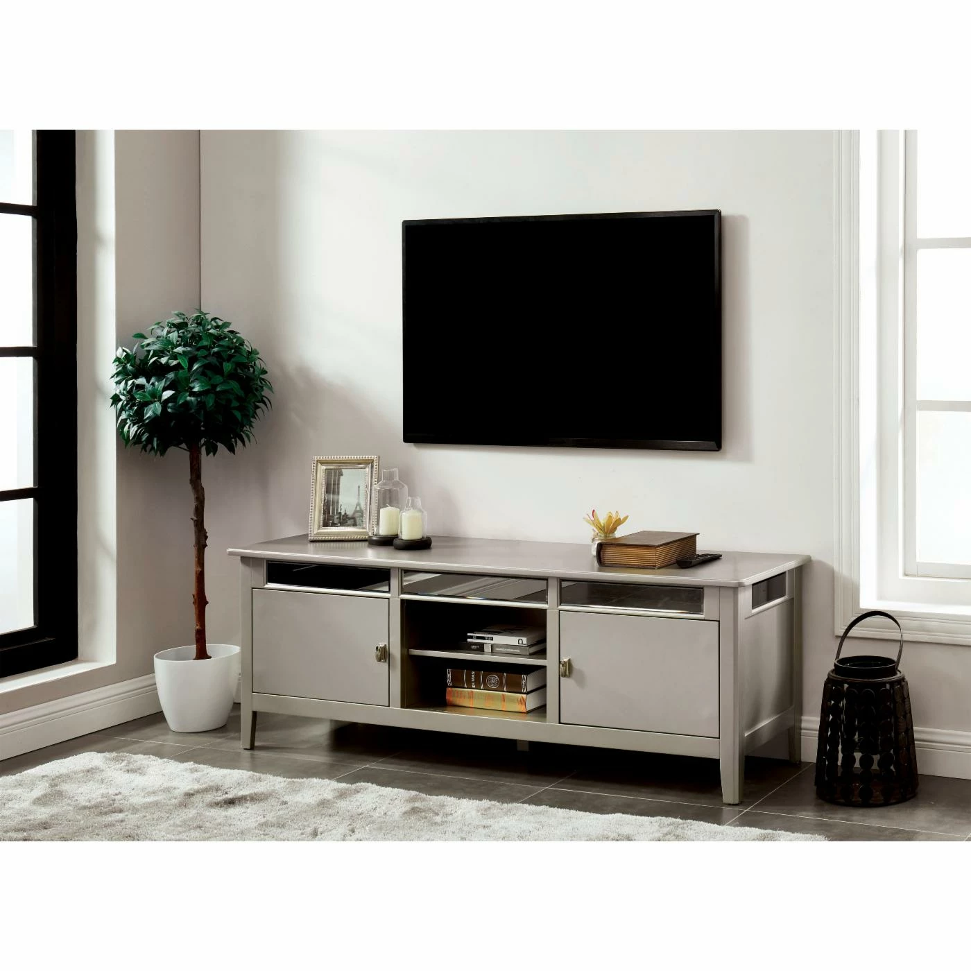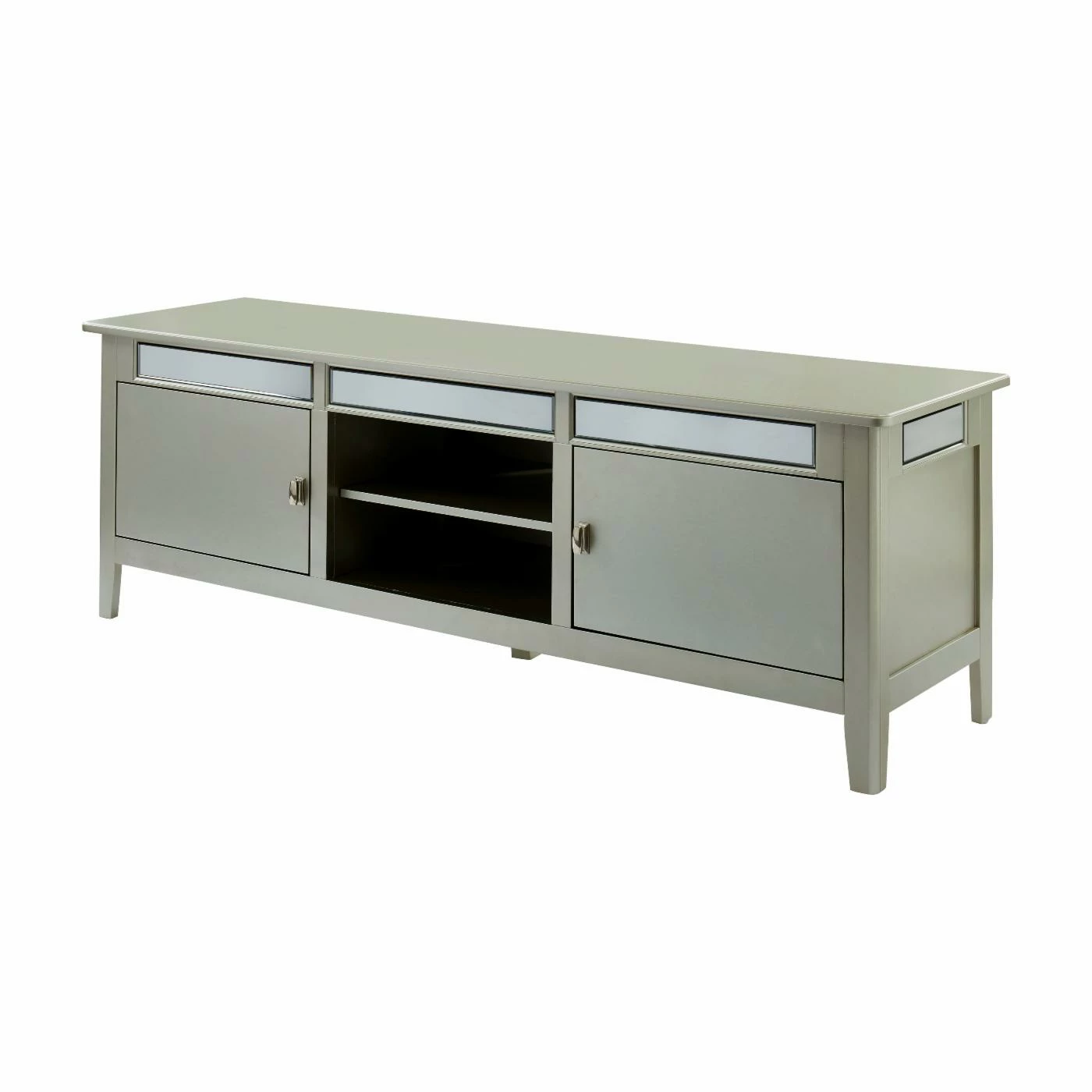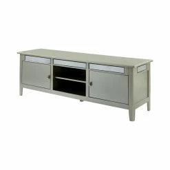 Add just a bit of glitz to your TV time with the Furniture of America Sloane 67 in. TV Stand. This entertainment unit can hold most TVs up to 65 inches. The frame is crafted of wood and wood veneers, and showcases flashy mirror insets and a silver-toned finish for a bit of a modern glam look. You can use all six shelves for storing books, movies, video games, or anything else you might like. Two of the shelves are open to the air, while four live behind cabinet doors with metal handles.