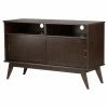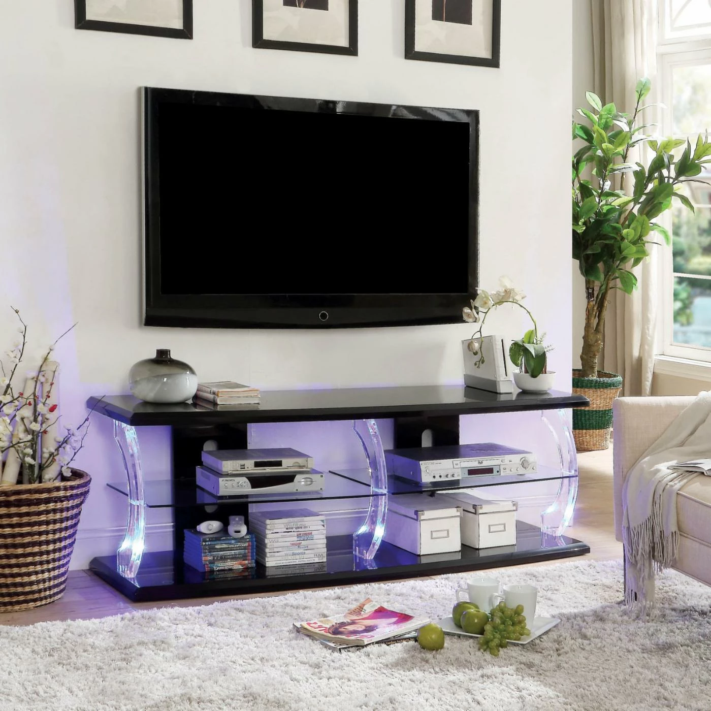 Give your home entertainment center a sleek, bold home with the Furniture of America Vedot LED TV Stand. Three acrylic curves connect the durable solid wood top and base and are illuminated by energy-efficient LEDs. A pair of eight-millimeter-thick tempered glass shelves provide storage space for your AV components. Cable management openings make it easy to access your wall outlets.