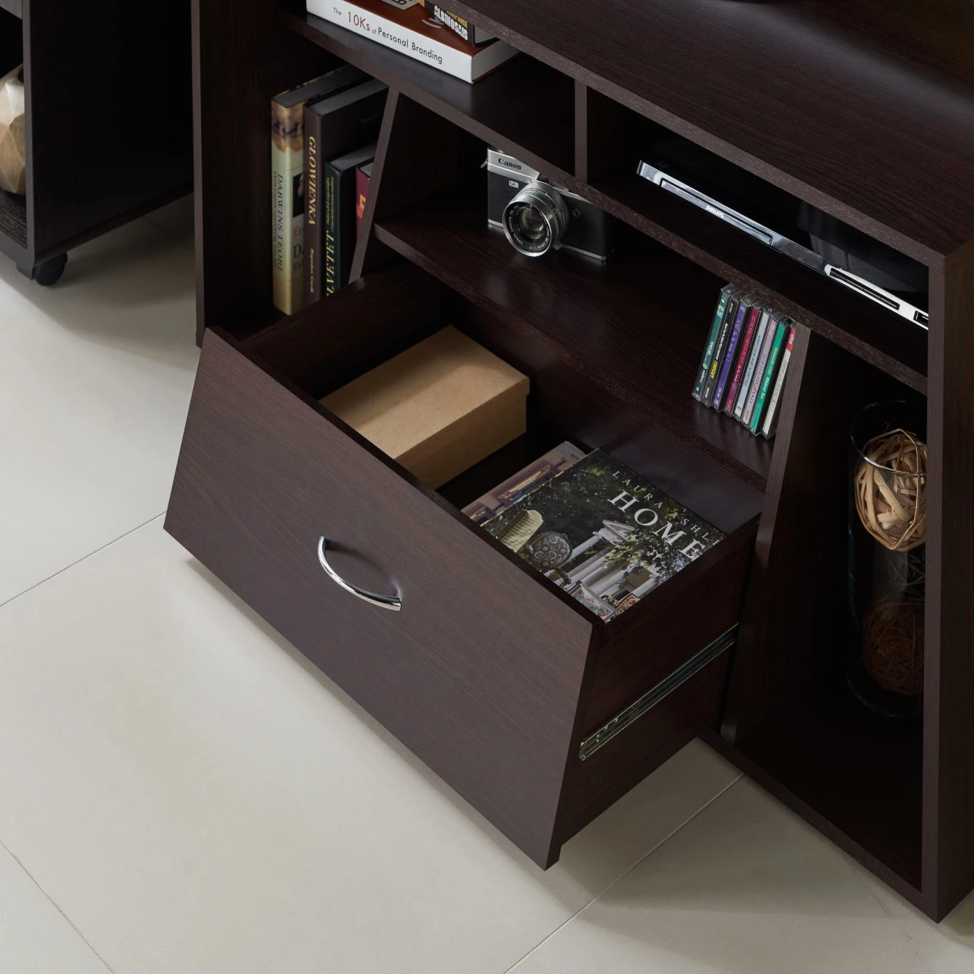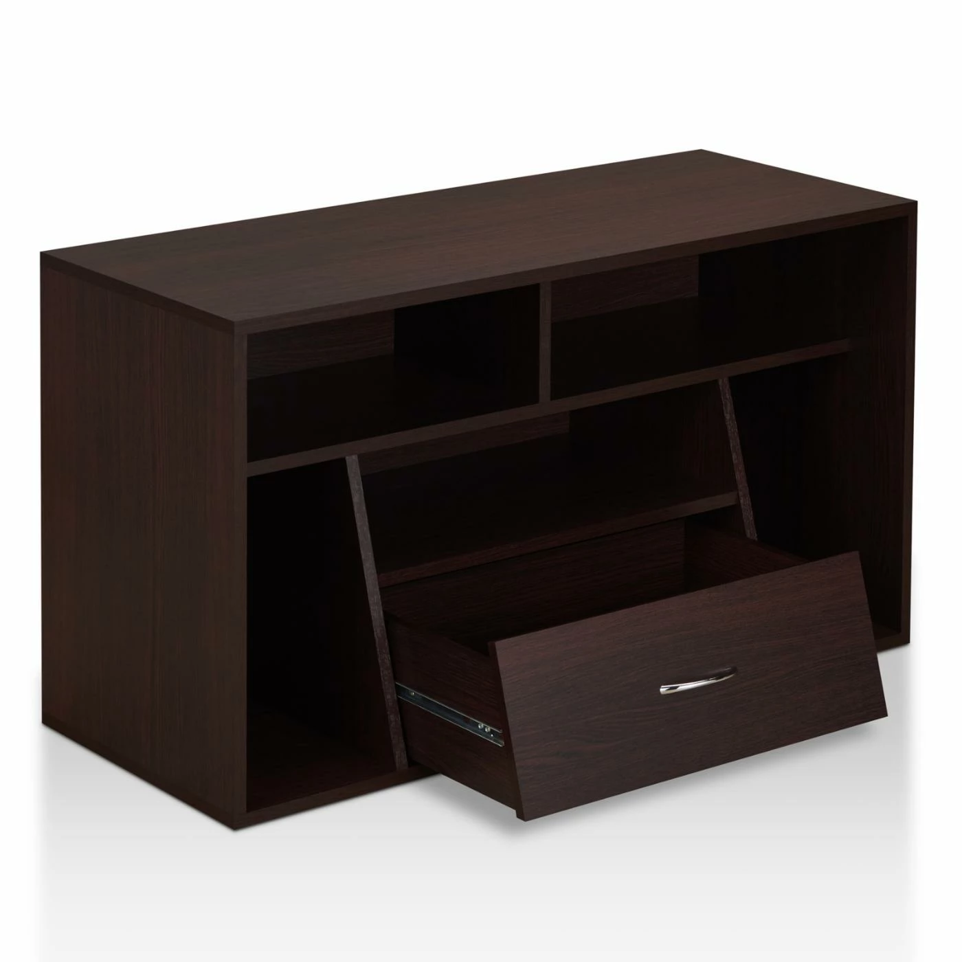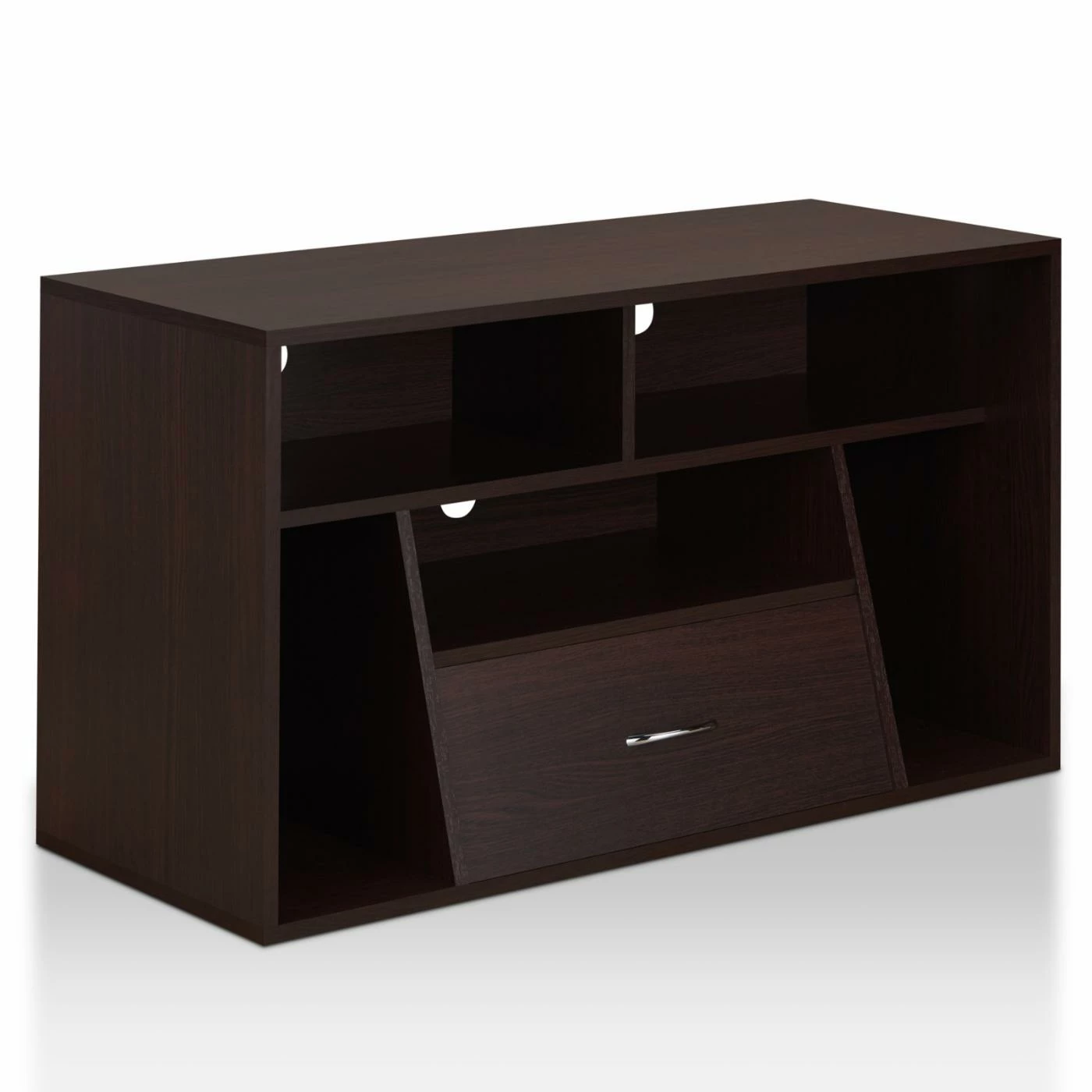 Flaunting sleek, clean lines, the Furniture of America Zoe TV Stand is perfect for holding a home theater system in a minimalist, modern interior. The TV stand can support a heavy, large-screen television, thanks to its sturdy solid and engineered wood construction. Three horizontal shelves with cable management openings await your AV components, and two additional cubbies can be used for storing media or decorative accents. For remotes and small clutter, the stand features one deep drawer.
