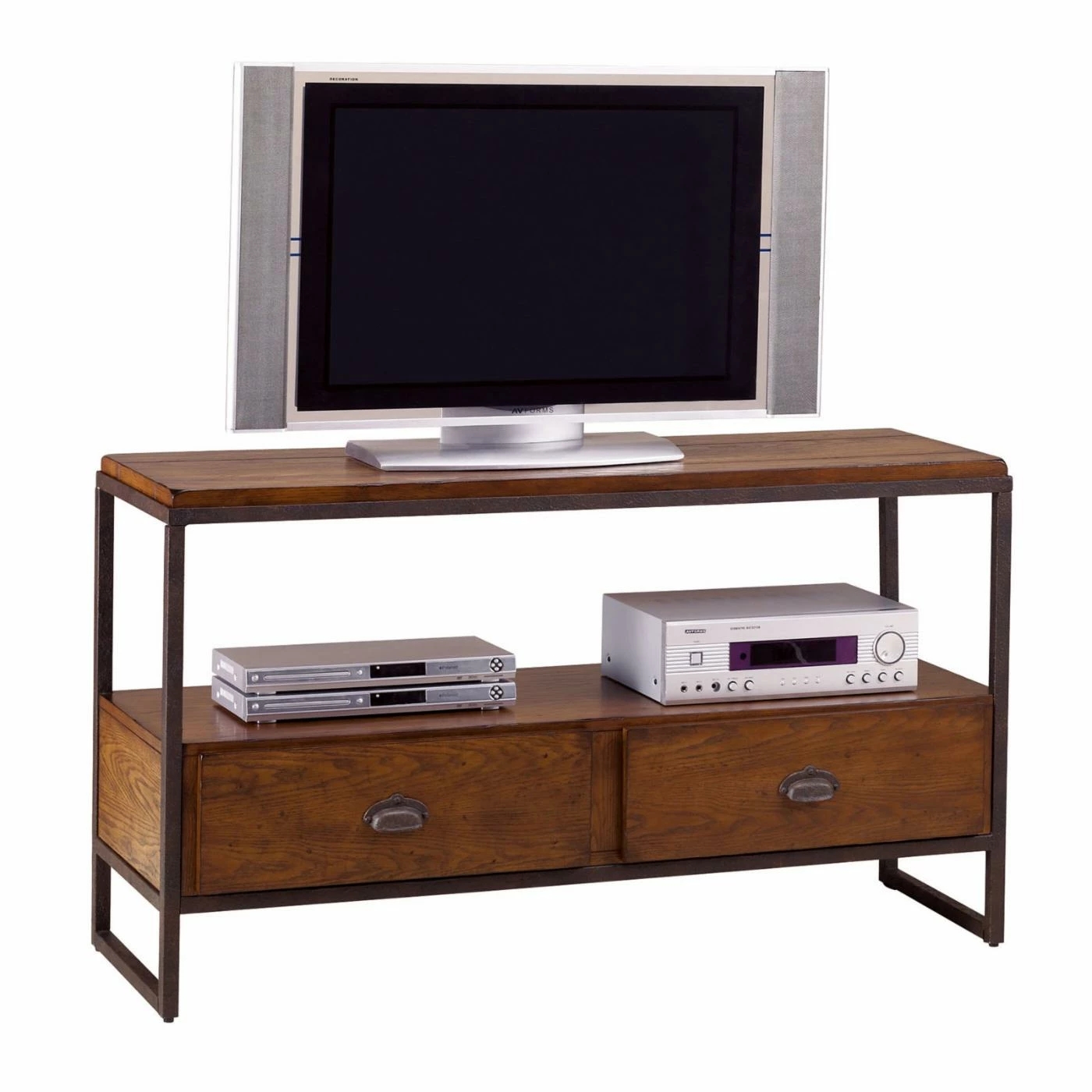 The rustic industrial look of the Hammary Baja T2075286-00 Entertainment Console Table brings a contemporary style to any living space. This console offers a spacious top for your television and a middle shelf for components. Dual lower drawers open via vintage bin pulls and are felt lined, perfect for storing movies, controls, and other items.