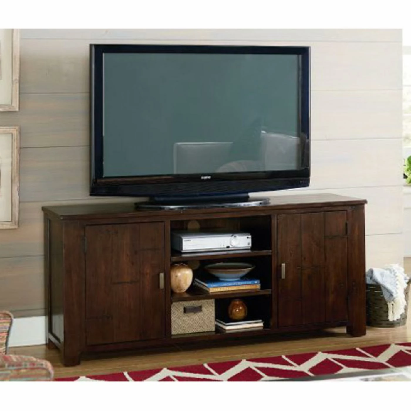 Create a focal point in your living room or den with the Hammary Reclamation Place Post and Beam Entertainment Console. Featuring a wide surface to display your flat-screen TV, this functional unit provides ample space to store all your media equipment. It has two adjustable shelves in the center, as well as an adjustable shelf behind each door. Crafted from solid wood and wood veneers, this stand is built to last.