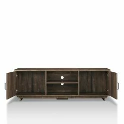 The HN Home Morley Modern Farmhouse Rustic TV Console boasts a clean, rectangular shape and has a reclaimed oak finish. It can hold most TVs up to 60 inches, and it has two shelves at the center with access points for wires and cables so that you can neatly and easily connect your electronics. This TV console also has two concealed cabinets that offer discreet storage space.