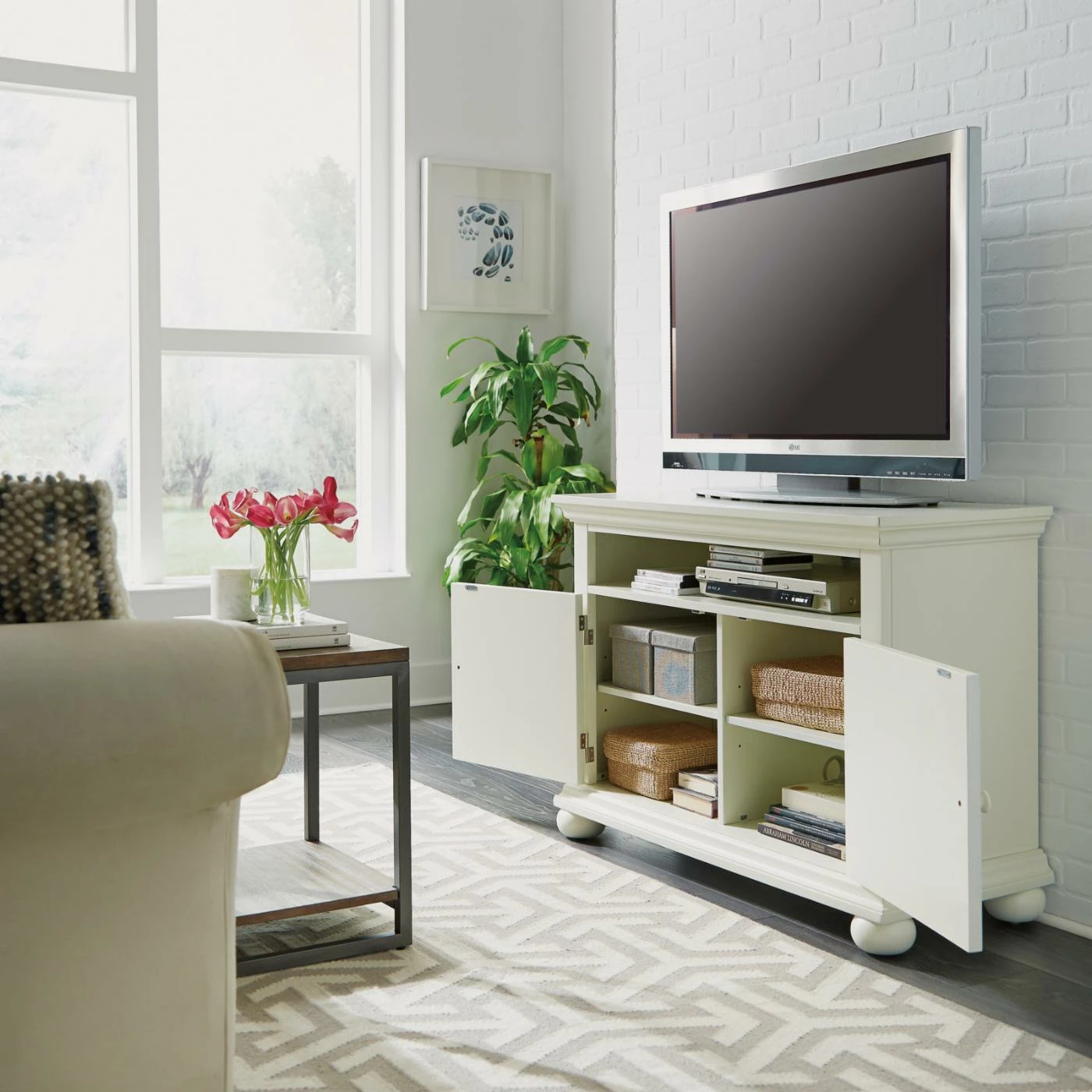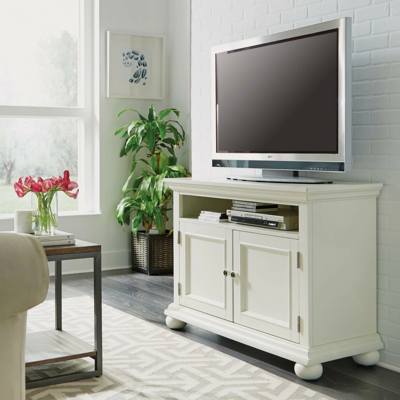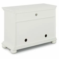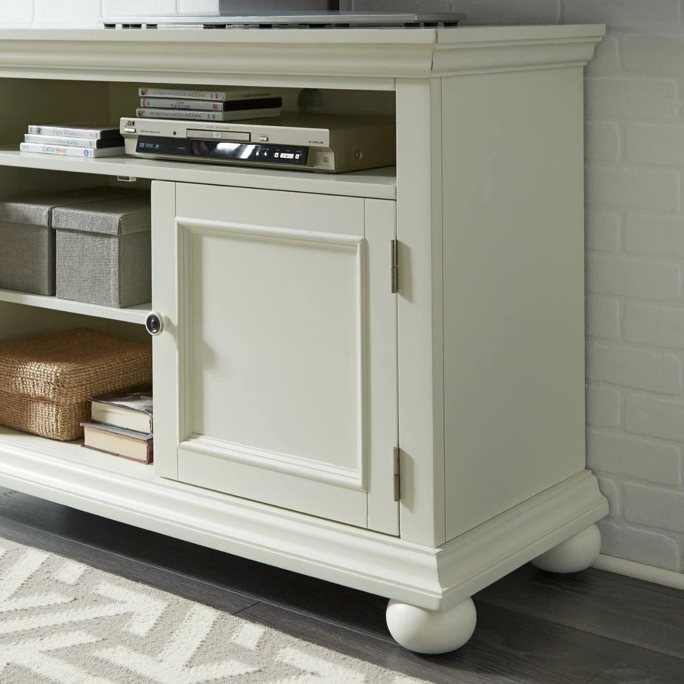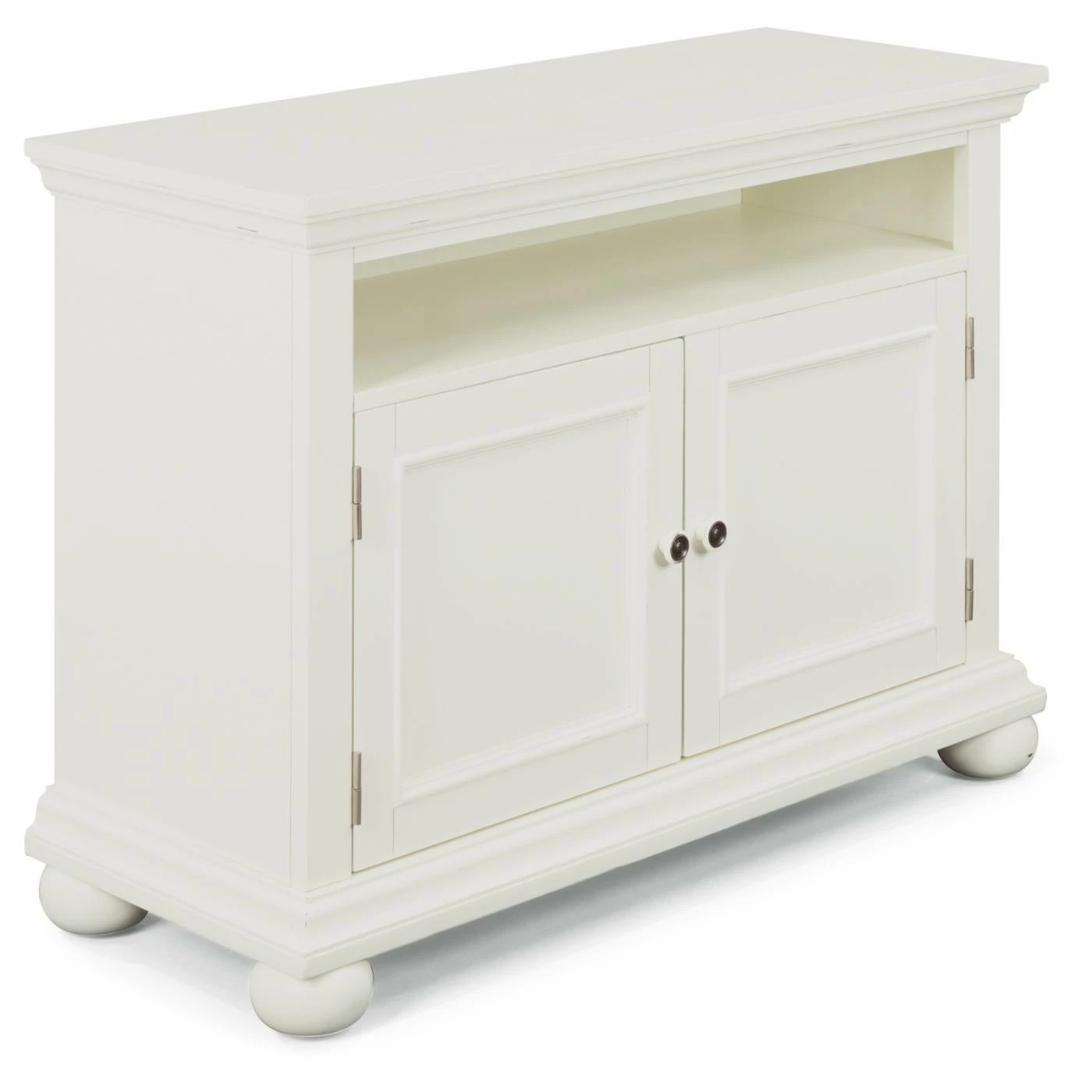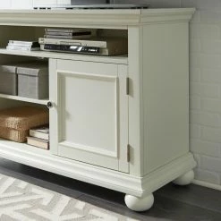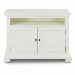 Give your modern media setup a charming home with the Home Styles Dover 44 in. Entertainment Stand. Constructed with poplar solids and engineered wood, this sturdy entertainment stand can hold TV screens up to 50 inches wide. An open top shelf accommodates DVRs and other slim players. Two doors open to two storage compartments with one adjustable shelf in each, perfect for game consoles, books, or other accessories. Electrical cutouts on the back and sides keep those cords neat and tidy. The antiqued nickel door pulls complement the distressed white finish of this farmhouse-inspired design.