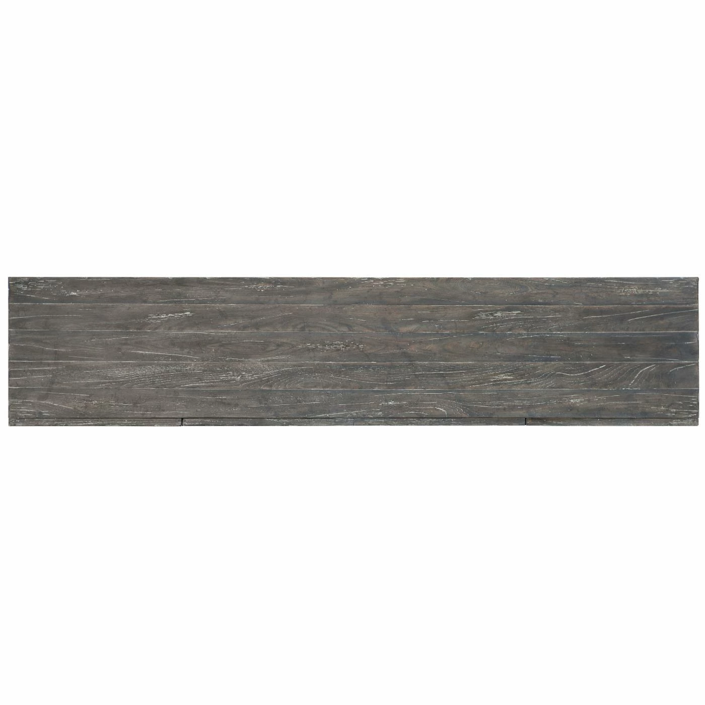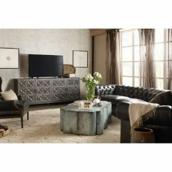 Relax, get comfortable, and curl up with your favorite TV show in front of the Hooker Furniture Beaumont Entertainment Console. This unique storage cabinet is made from a mixture of resin, poplar, and hardwood solids with oak and elm veneers, so it can stand up to the hustle and bustle of everyday life. The slate gray finish is weathered and etched, adding to the rustic vintage appeal of the three dimensional diamond texture on the front. Aged bronze hardware pulls contribute to the antique feel of this piece in a delicate patina. Put electronics in this cabinet without worry – the back is ventilated for temperature control and safety. Two drawers and adjustable shelves make this console table a great option not just for gamers and movie aficionados, but style experts simply looking for a place to store their handwoven blankets and decorative vases.