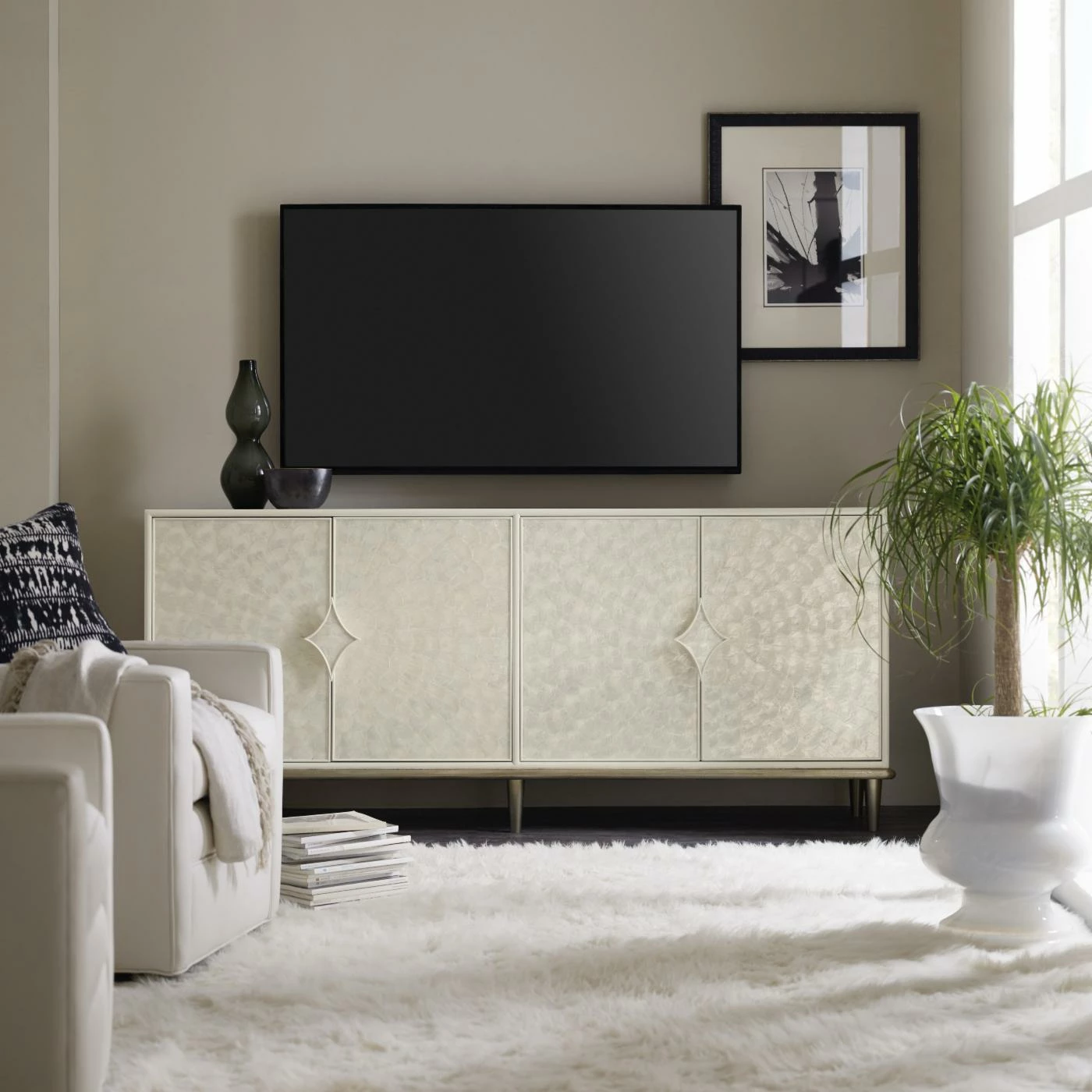 Most entertainment consoles get their title because they hold your TV and electronics, but maybe the Hooker Furniture Entertainment Console – Cream is the real entertainment all by itself. This stunning piece features a hardwood body that’s home to four doors with a shimmering inlay of natural capiz shells in a radiant pattern. Each door opens to reveal an interior drawer. A ventilated back panel makes it easy to manage the cords and cables of your gaming consoles and AV components. Soft-close latches are standard throughout, giving it a high-end feel every time you open a door. An integrated outlet makes it easy to keep your cords and cables tidy.