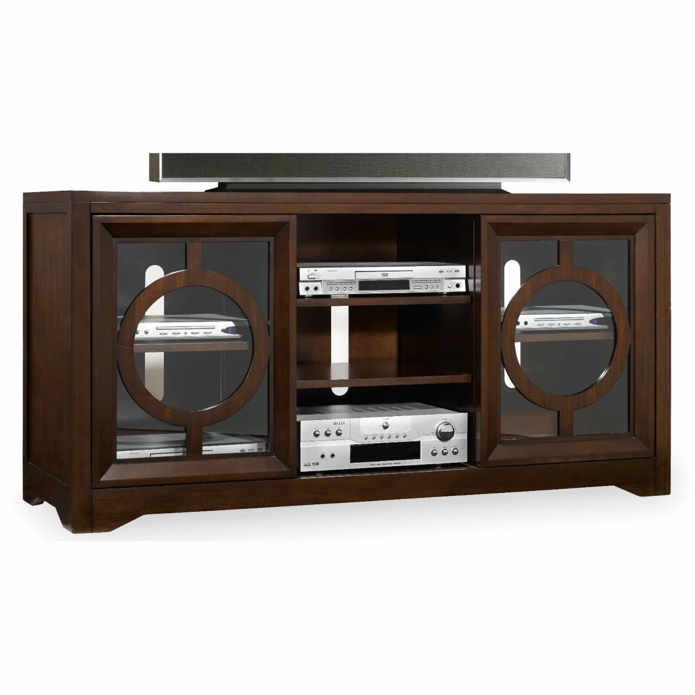 Accent your living or bedroom space with the stylish Hooker Furniture Kinsey Entertainment Console. Constructed of glass, hardwood solids, and walnut veneers, this entertainment console comes embellished in a dark walnut finish. The smooth modern design of this console features two glass cabinet doors that showcase a geometric design. With open shelving ideal for storing electronic media, this console comes included with adjustable shelves. This entertainment console can hold up to a 66-inch flat panel TV. Assembly is required.