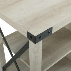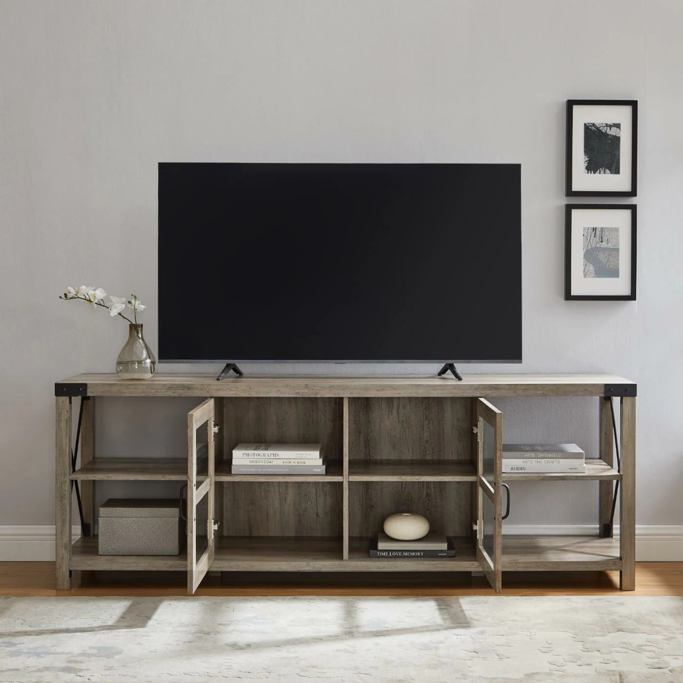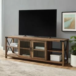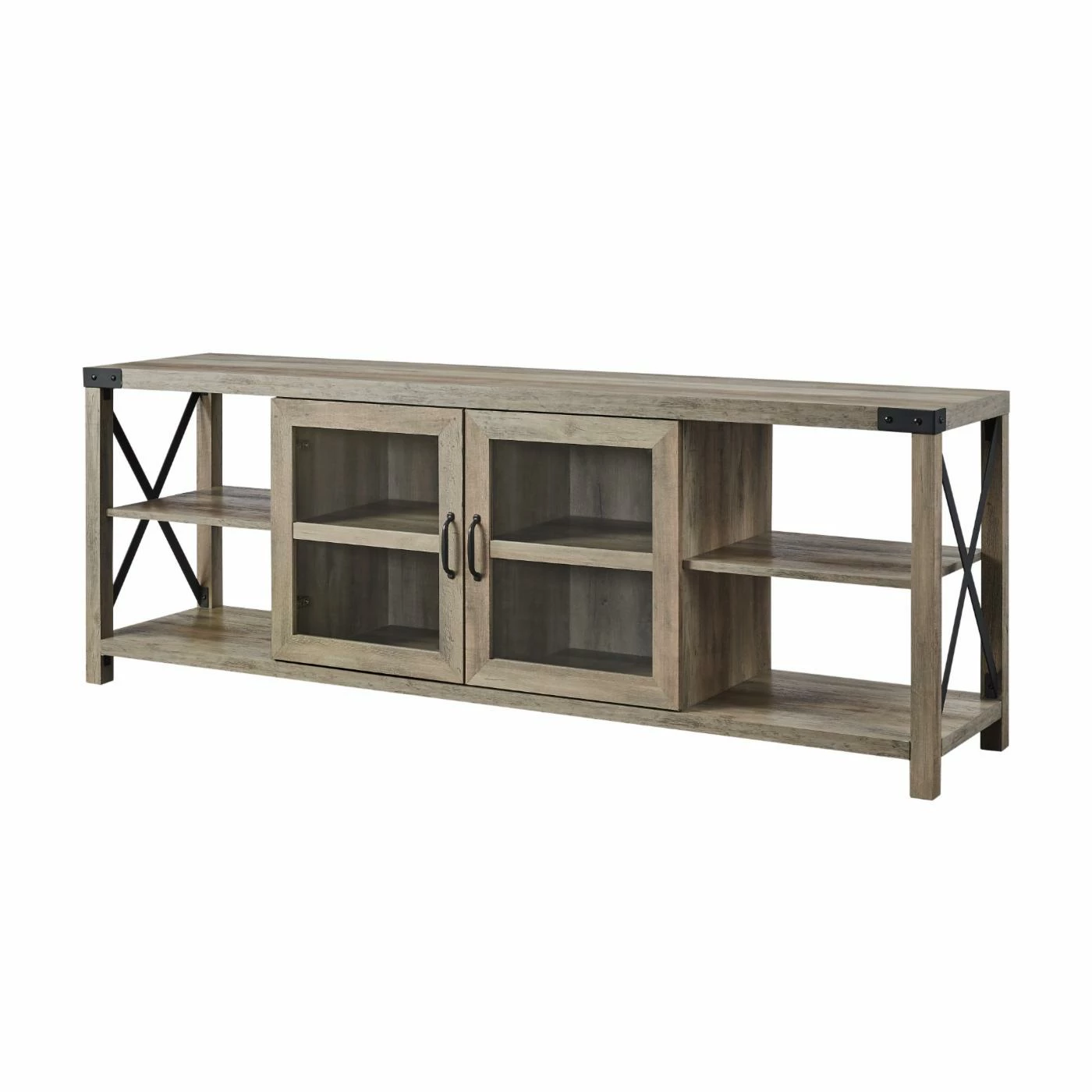 With its array of shelving and storage, the HumbleNest Countryside Modern Rustic TV Stand brings order to your living room – but it also brings a sense of warmth and comfort. Its rustic finish options on laminate expose visible wood grain, while rivets, corner brackets, and metal cross braces speak to the piece’s farmhouse inspiration. Use this media console to hold your televisions (up to 78 inches wide) or to display favorite books and potted plants.