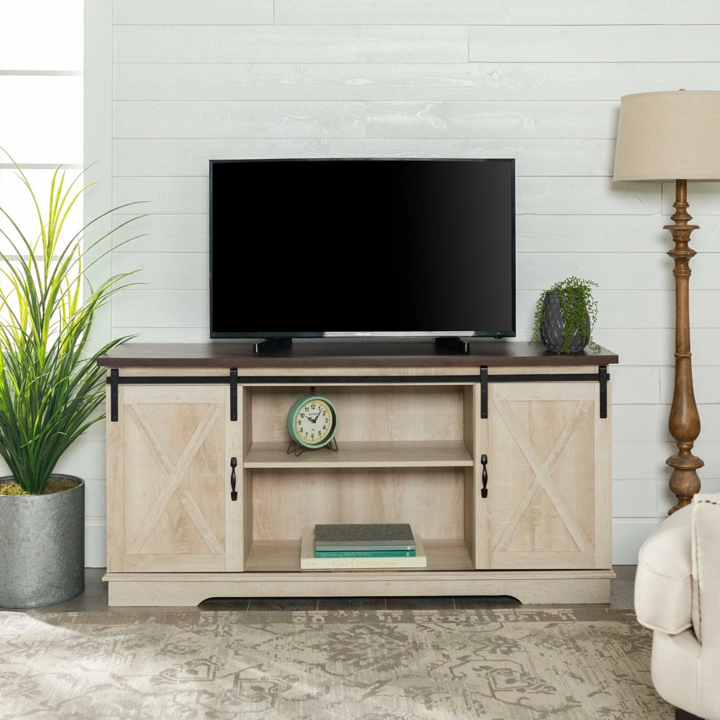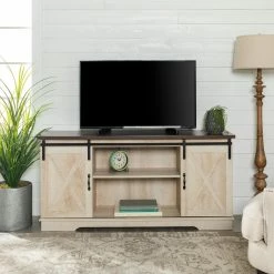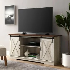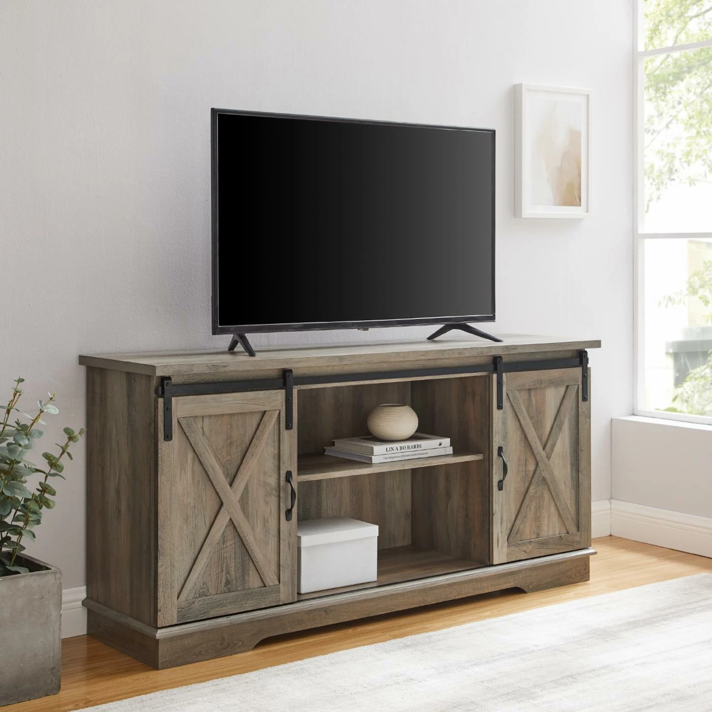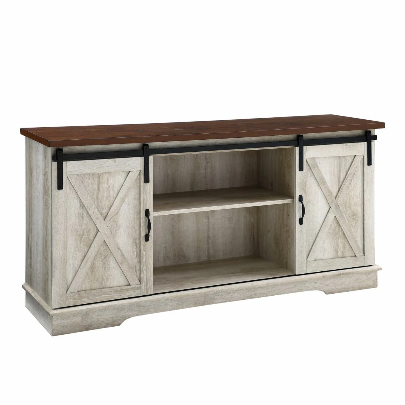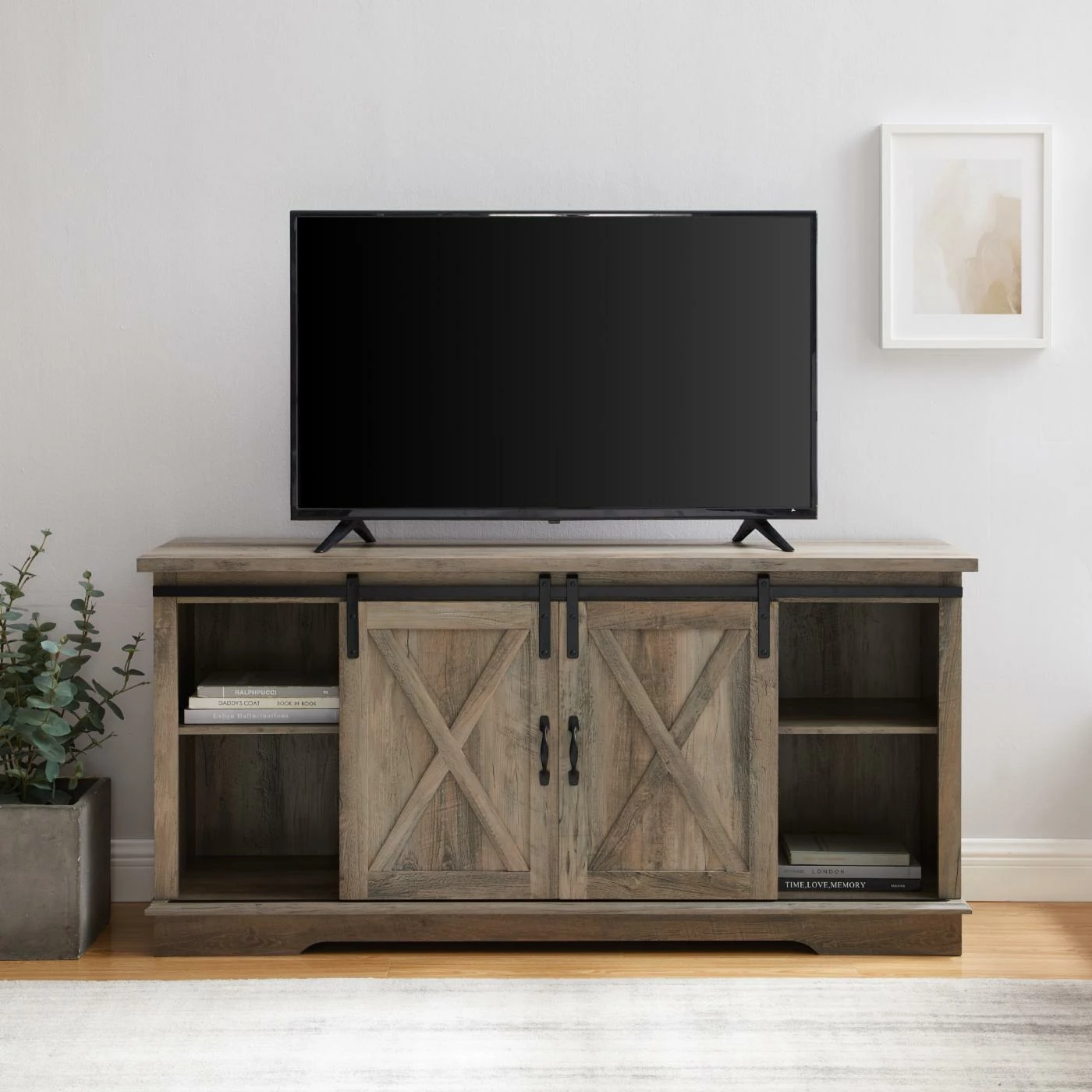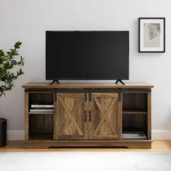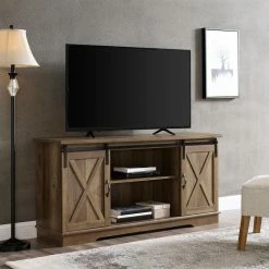 Indulge your craving for all things rustic with the HumbleNest Farmers Market 58 in. Rustic Sliding Barn Door TV Stand. Perfect for a farmhouse-inspired bedroom or living room, this entertainment console offers oodles of storage space. It features two sliding doors that are ideal for compact spaces because you won’t need room for the doors to swing open.