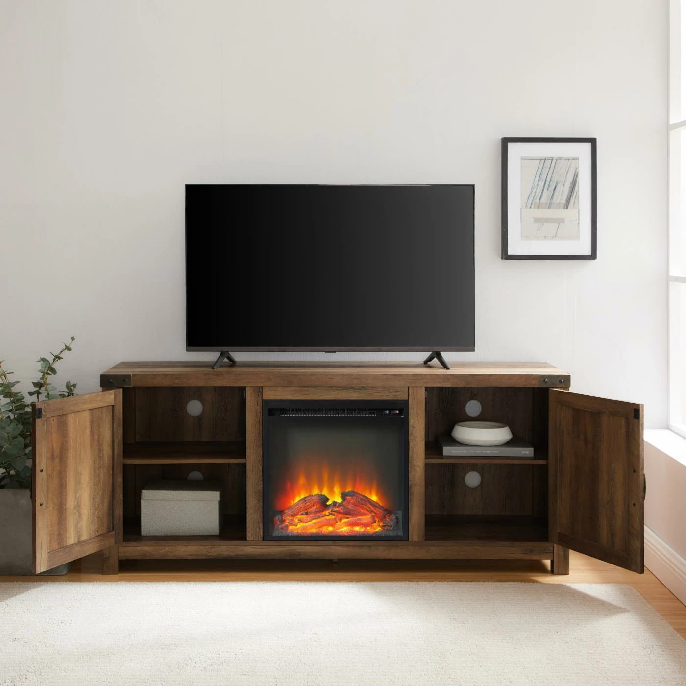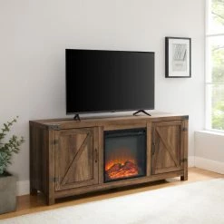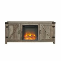 The cozy, vintage styles of the HumbleNest Farmers Market 58 in. Weathered Barn Fireplace TV Stand make it the perfect option for a homey farmhouse living room. Constructed with solid wood, high-grade engineered wood, and veneer, the rustic aesthetic matches the aged hardware perfectly.