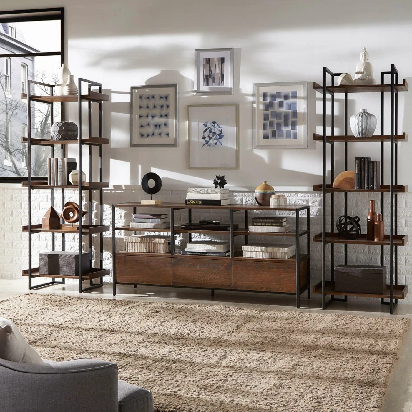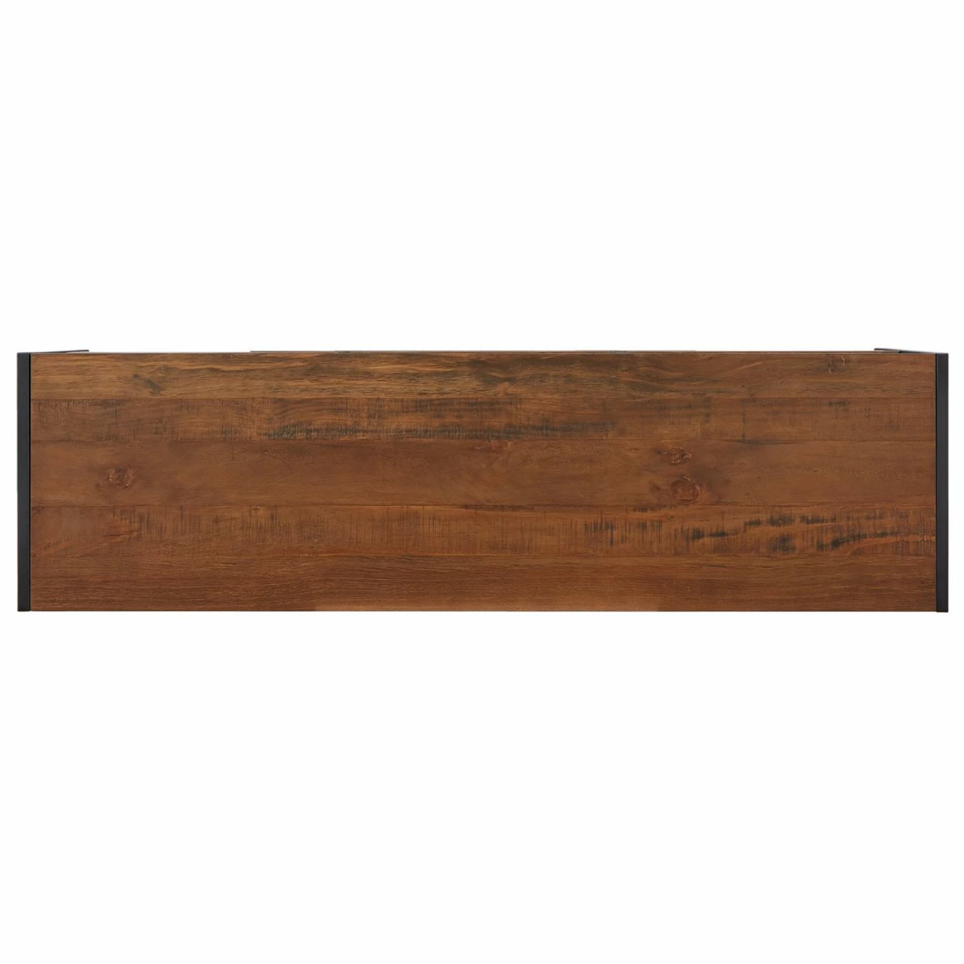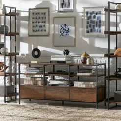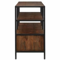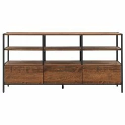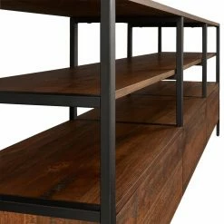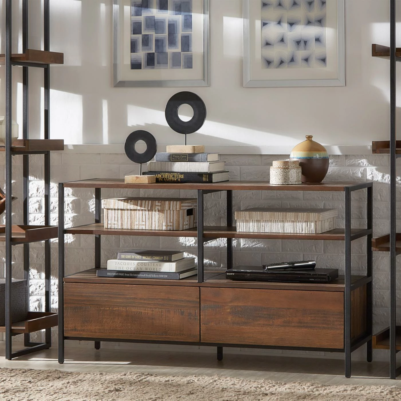 Update your decor, and your TV as well, with the HumbleNest Farmers Market Rustic TV Stand. Boasting an open back for cord management and ample air flow, as well as the ability to hold most TV screens up to 50 inches wide, this TV stand is as functional as it is stylish. The black cast iron frame and rustic brown finish gives this piece a rustic industrial look you’ll love. With its four shelves and two drawers, you’ll have plenty of space for media devices, gaming consoles, remotes, controllers, DVDs, games, and more.