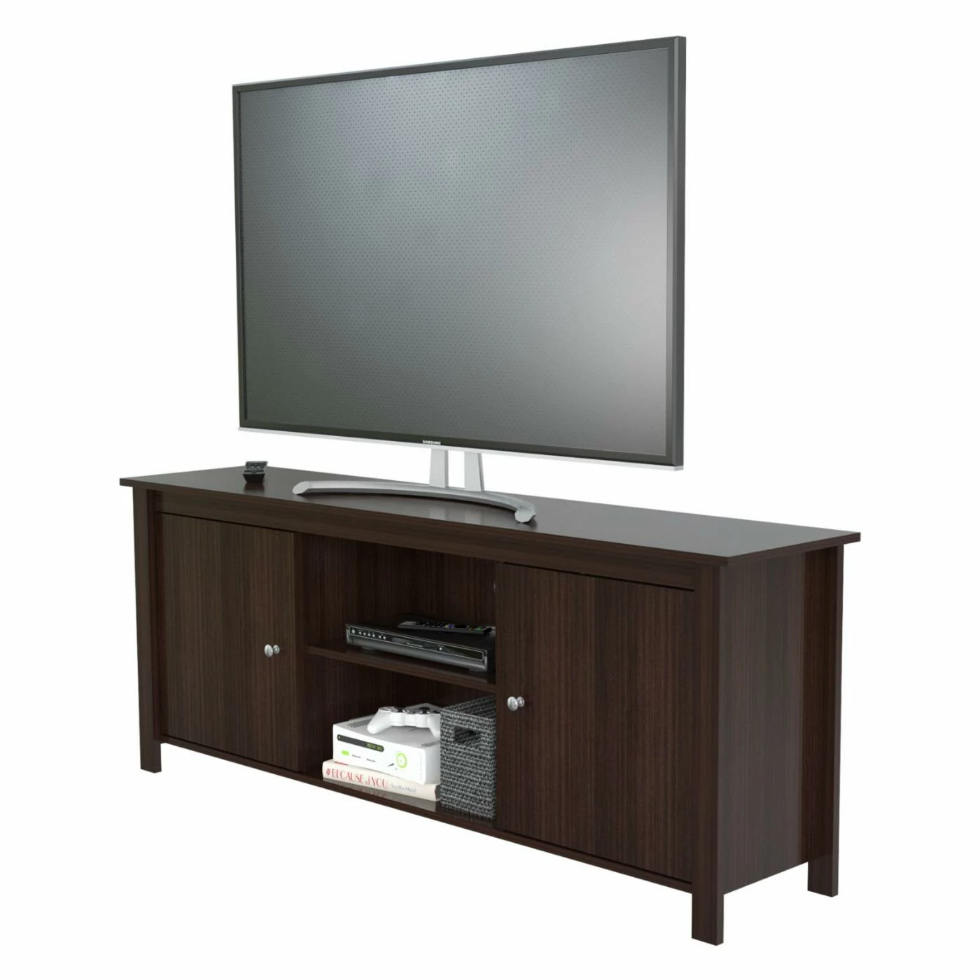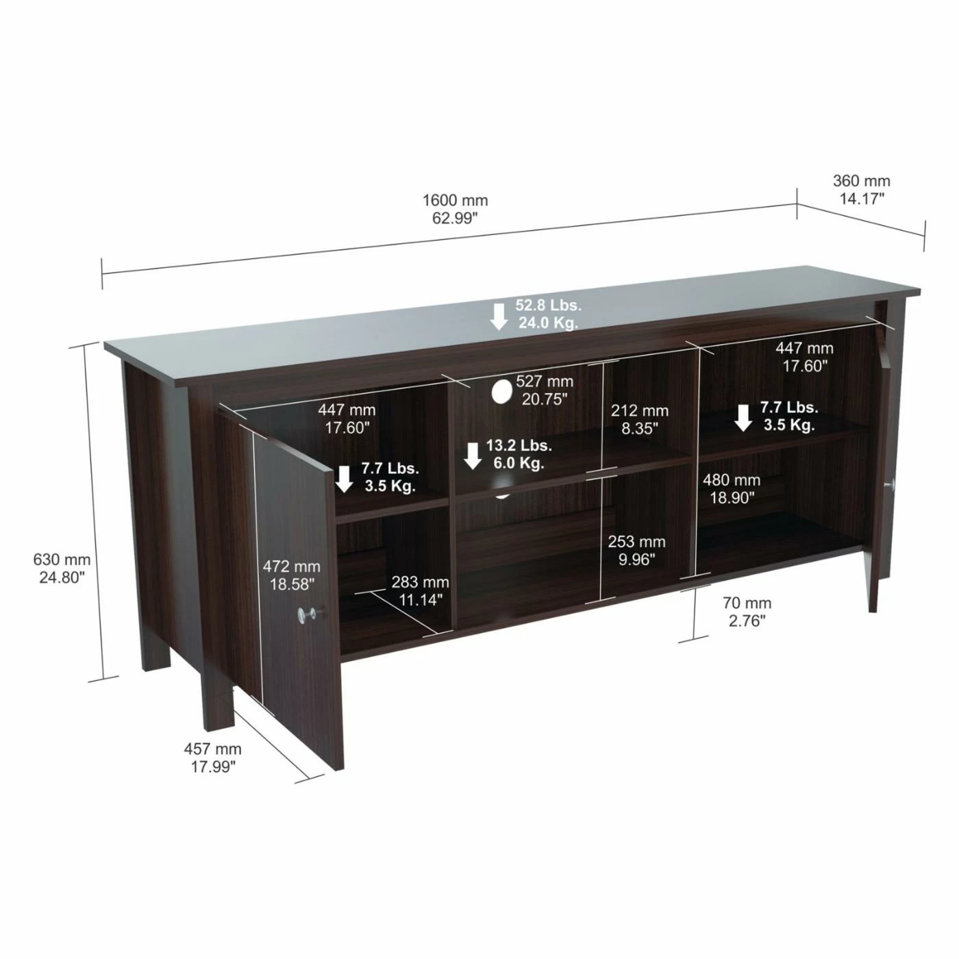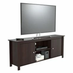 The Inval 60 in. TV Stand with 2 Doors and 2 Shelves – Espresso offers a convenient combination of open and enclosed storage. Behind each of the two doors, you’ll find one enclosed shelf each, while the center features two open shelves. Crafted of double-faced durable melamine wood, which is stain-, heat-, and scratch-resistant, the TV stand is finished in an espresso tone and can accommodate flat-panel TVs up to 60 inches wide and 52 pounds.