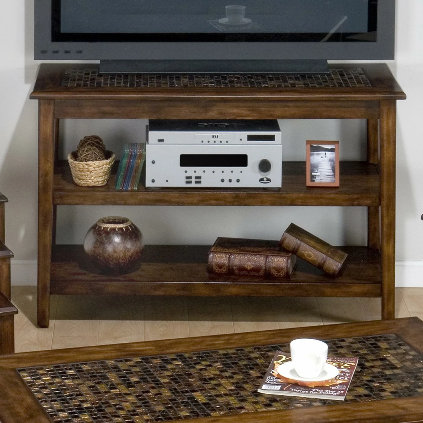 The intricately inlaid stone mosaic tabletop of the Jofran Baroque Brown Sofa Table make a living room or entryway centerpiece a conversation piece, too. This artfully variegated tones of the top are richly offset by a warm brown finish overall. Crafted with durable solid Asian hardwood, this traditional tall table is perfect for use behind a sofa, as a TV or media stand, or as welcoming storage space in a foyer or hall. Its two open shelves are ideally sized to hold books, blankets, electronic equipment, and more.
