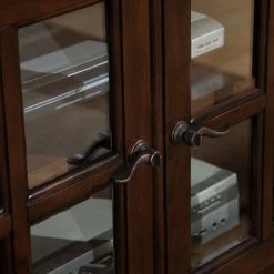 A wealth of architecturally inspired details give the Leick Home 4 Door Corner TV Console with Lever Handles a Craftsman-style touch. The Heartwood Cherry finish sets the perfect scene for the serpentine-shaped top edge, plinth base, mullioned door elements, and bronze lever pulls. And you’ll adore the storage, which features four doors with adjustable interior shelving and perforated backs for easy cord management. The two center doors feature infrared-friendly glass fronts, too.