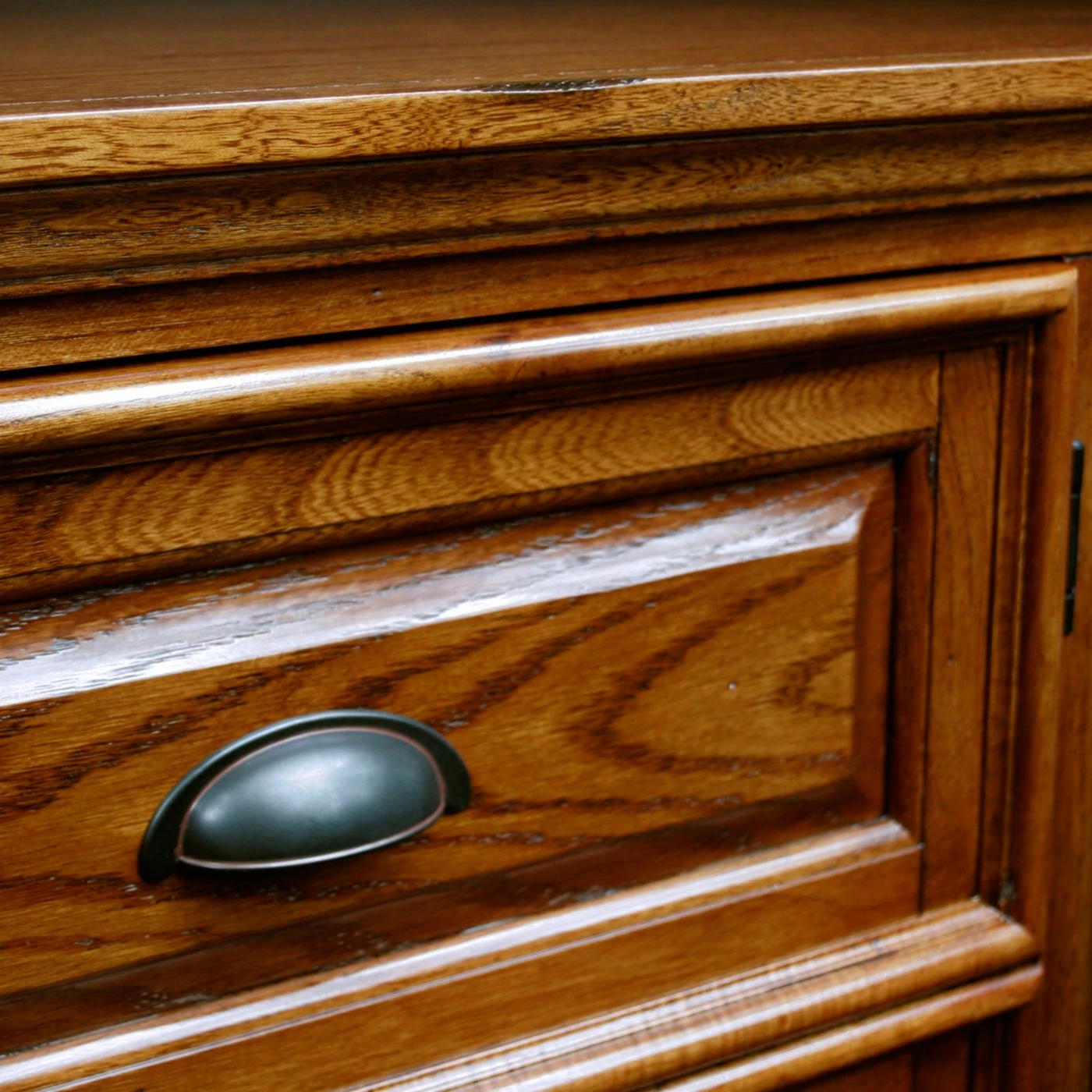 - Made of hardwood solids and oak veneers in medium oak finish