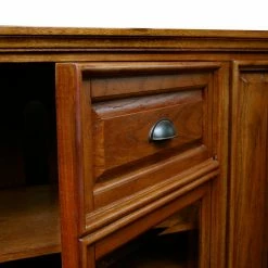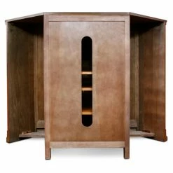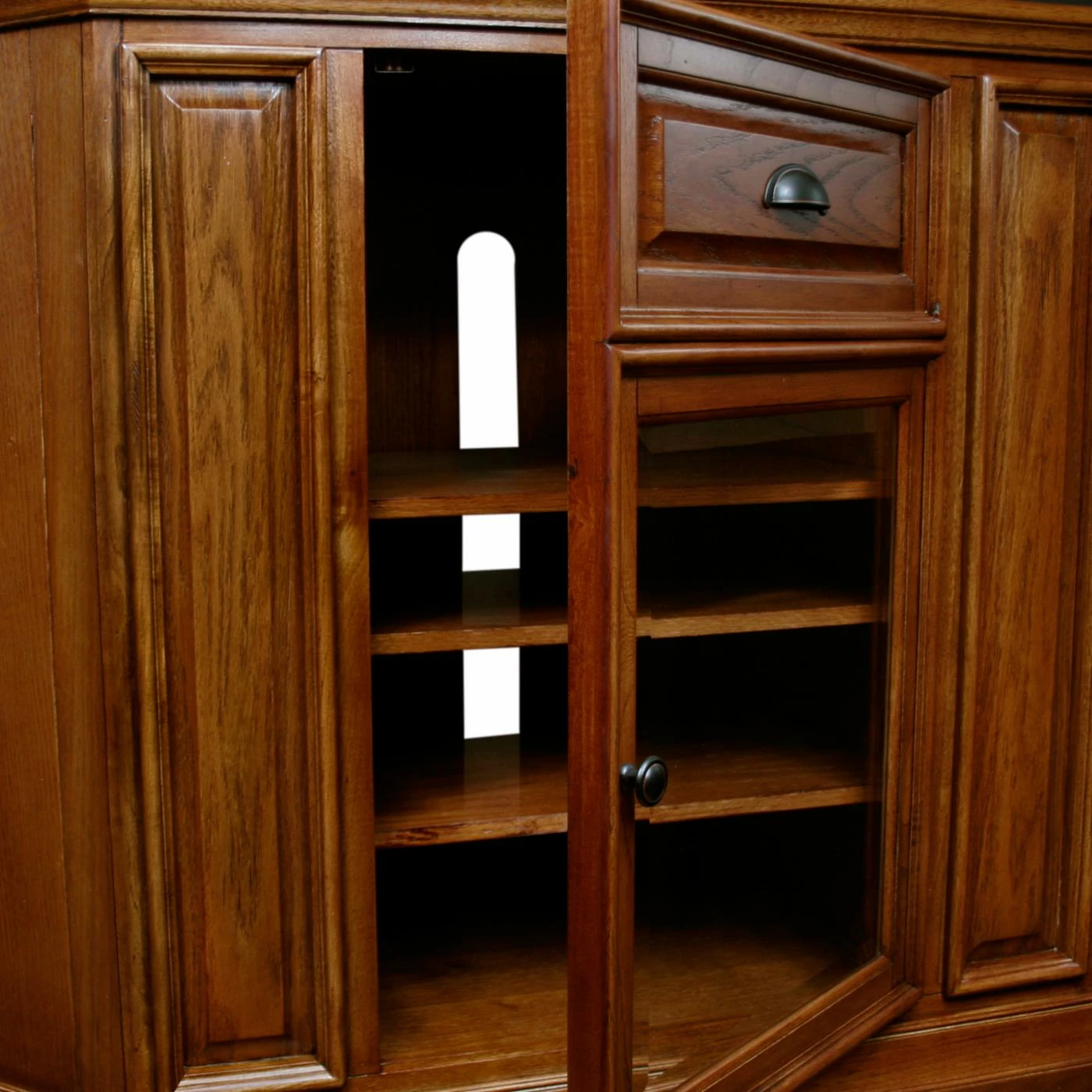- Storage behind a decorative wood and glass door
