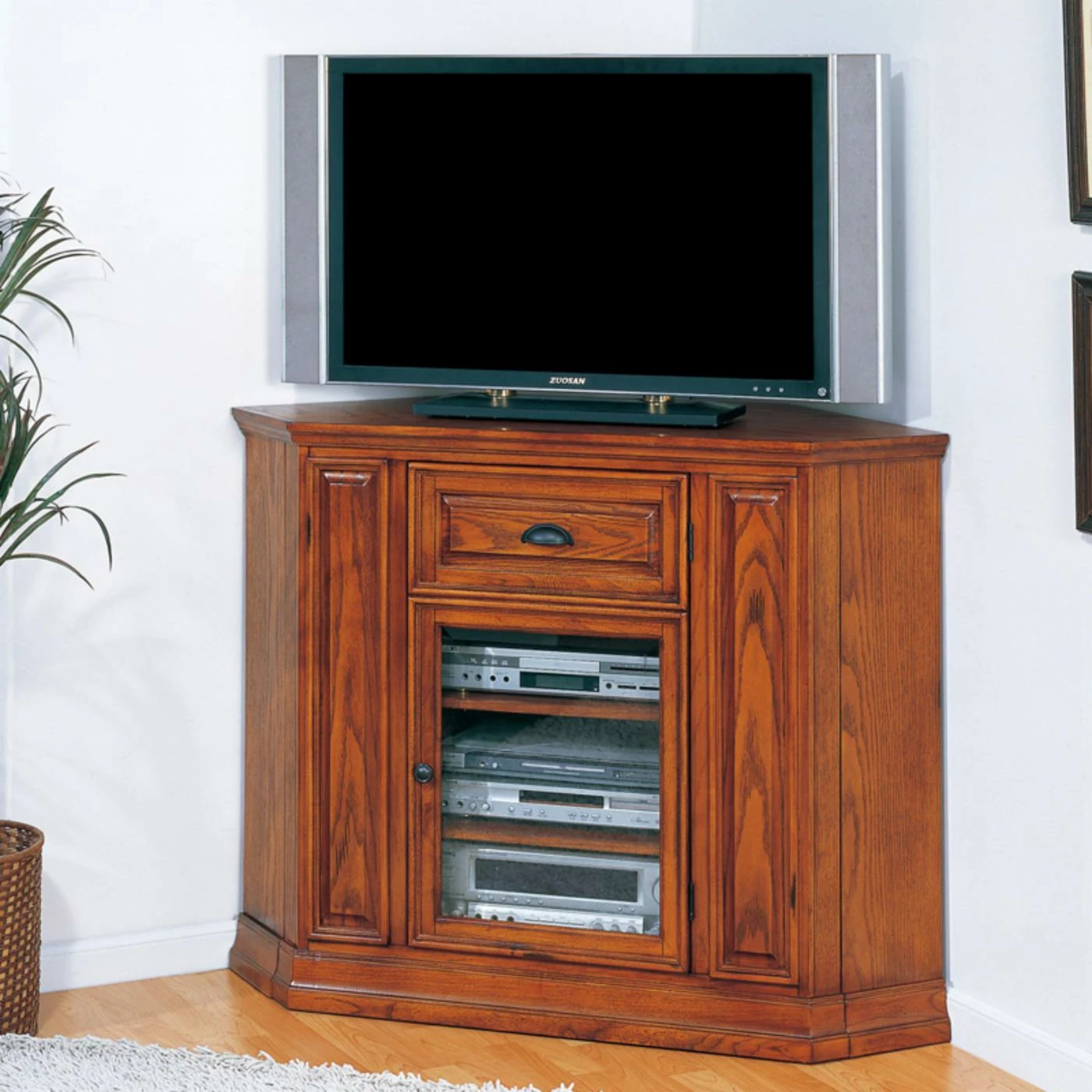 The Leick Home 82232 Riley Holliday Boulder Creek 46 in. Corner TV Console is efficiently designed. This console provides ample space for all your entertainment components with three adjustable shelves enclosed behind a beveled, tempered glass door. Made of hardwood solids and oak veneers in a medium oak finish, this console is attractive and durable. The console also offers easy cord management. An efficient space saving design and hue makes this console a welcome addition to most homes.
