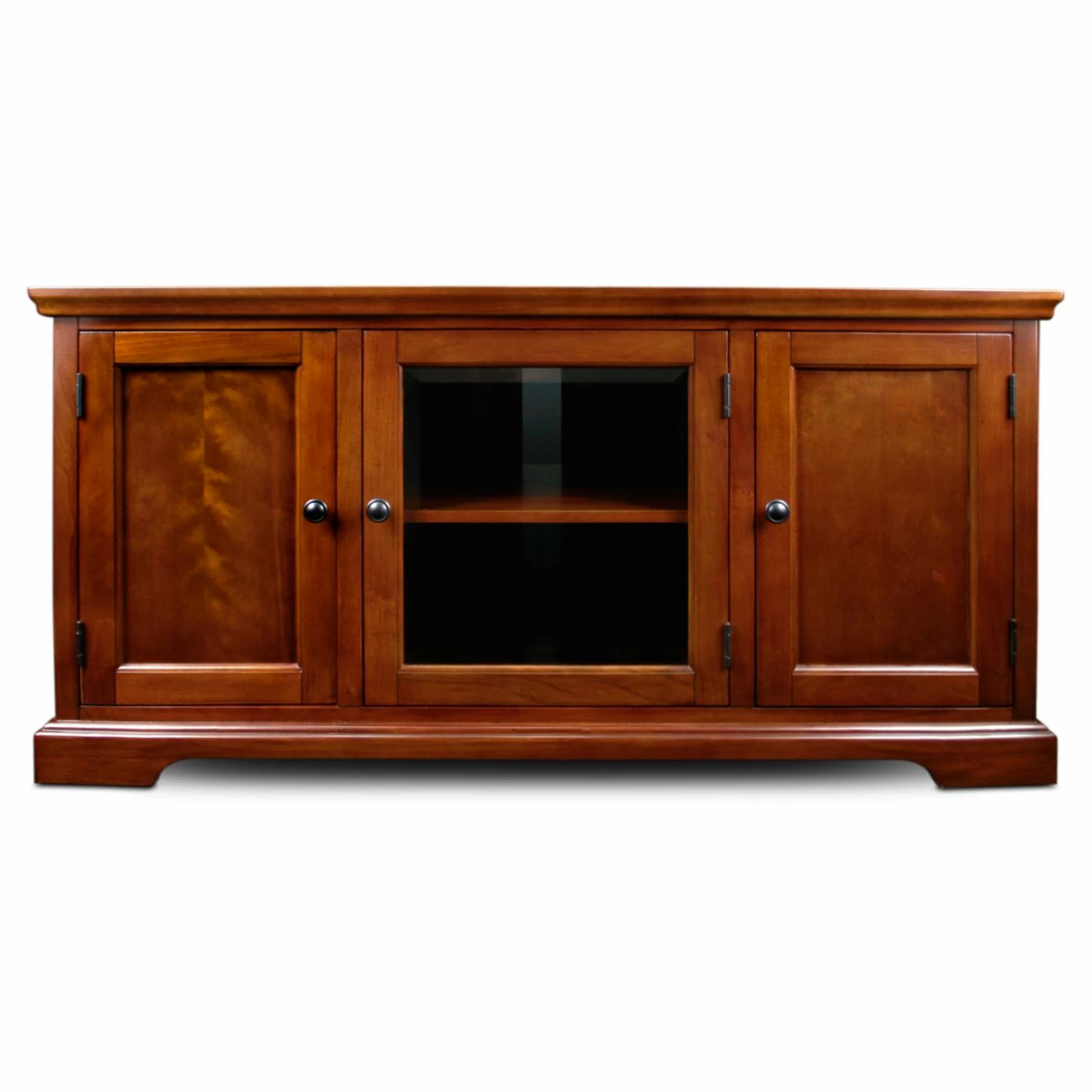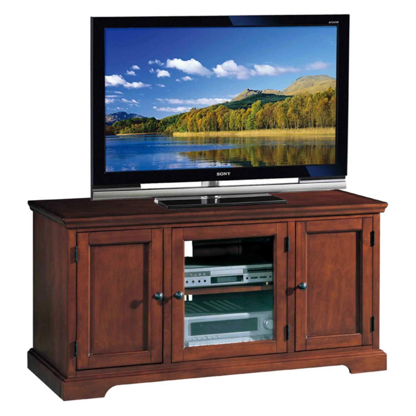 Combining high quality with functionality, the Leick Home 87350 Riley Holliday Westwood 50 in. TV Console is made of hardwood solids and birch veneers. Aiding storage is one adjustable shelf and another fixed, enclosed behind a beveled, tempered glass door. Additional media components can be kept dust free in the two cabinets on either side. Black metal hardware makes a stylish detail along with the brown cherry finish that enhances the console’s visual appeal.