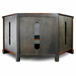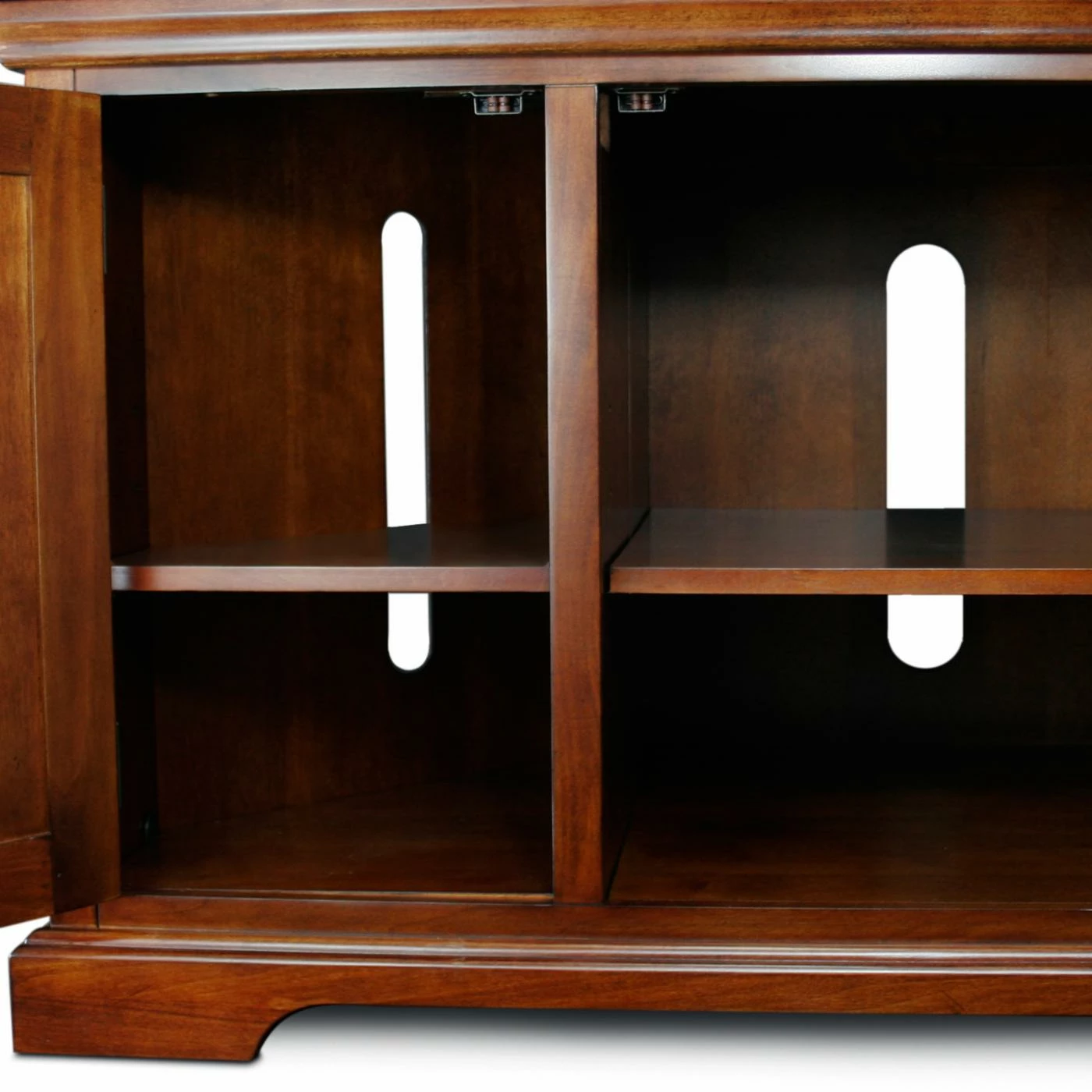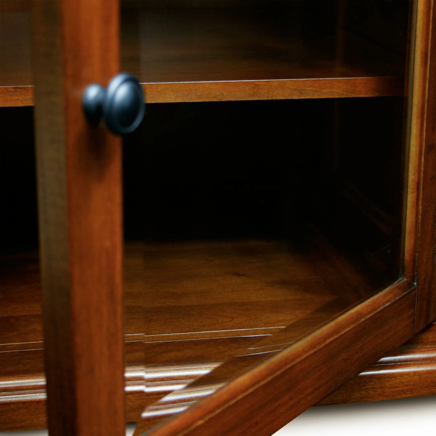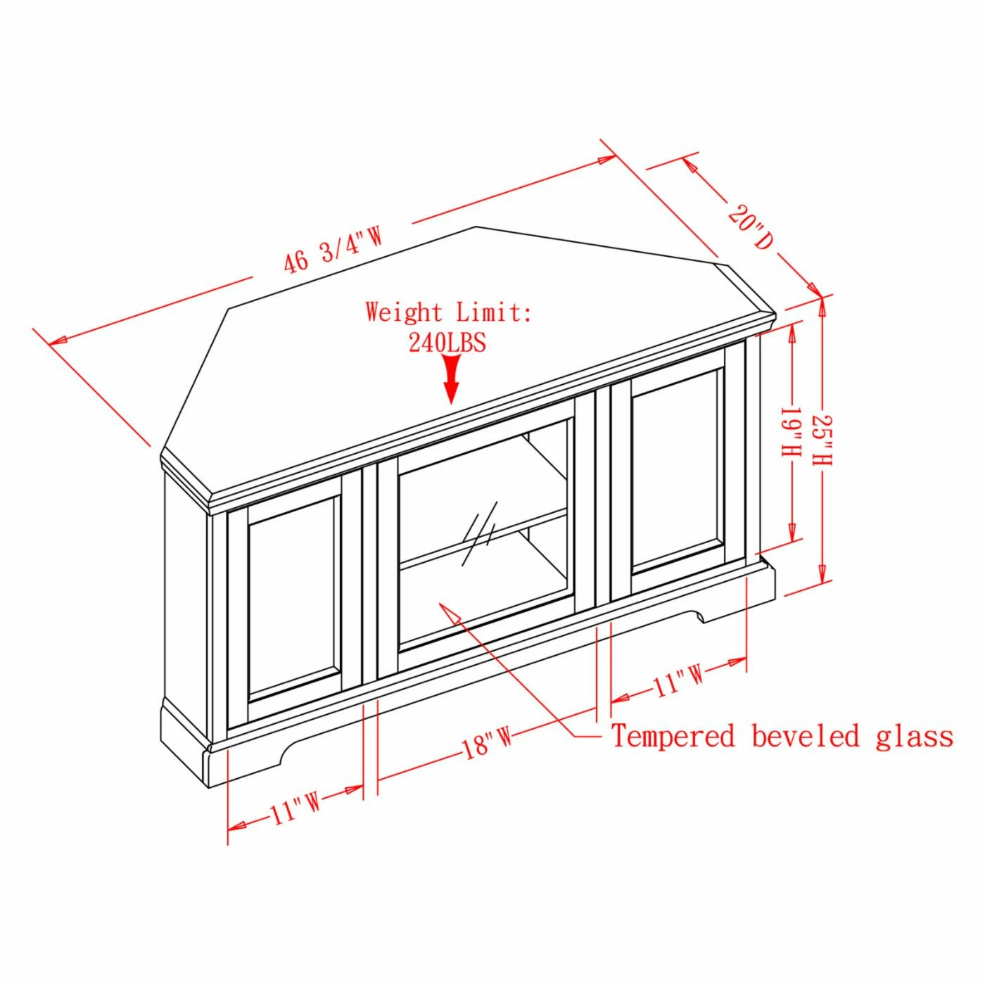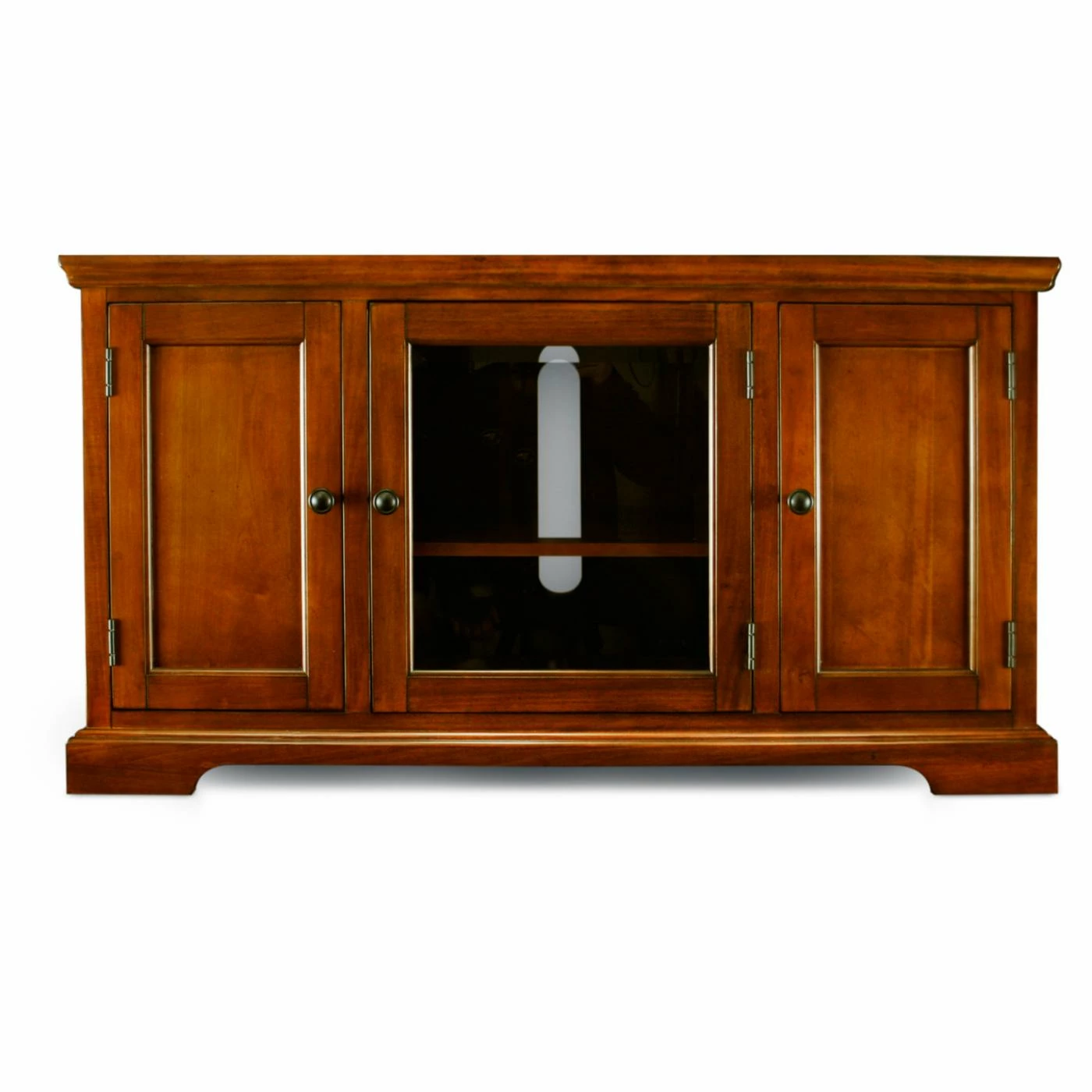 The Leick Home 87385 Riley Holliday Westwood 46 in. Corner TV Console with Storage is efficiently designed. This console provides ample space for all your entertainment components with one adjustable and one fixed shelf, enclosed behind a beveled tempered glass door. Additional storage on either side provides more dust free storage space. Made of hardwood solids and birch veneers with a brown cherry finish, this console is attractive and durable. Cord management is made easier with its perforated back design.