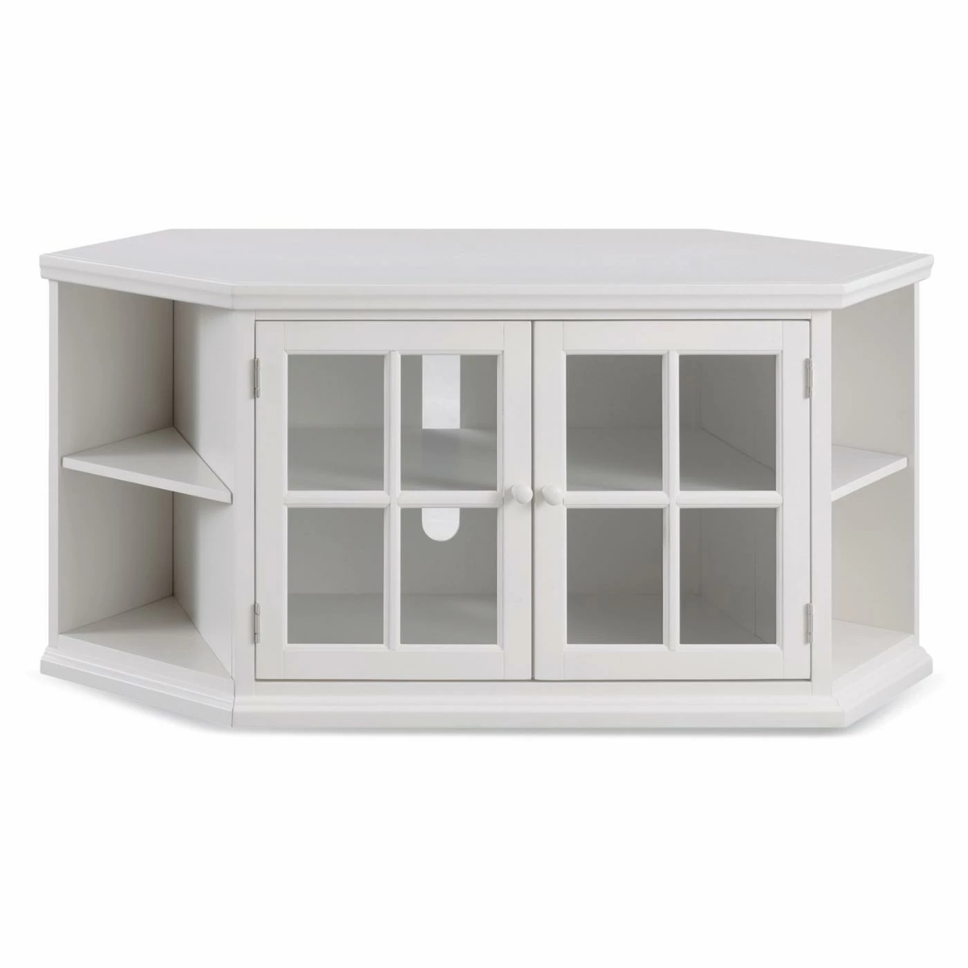 The Leick Home Corner TV Console – Cottage White adds charm, form, and function to your living space without overwhelming the room. Constructed of solid wood and wood veneers, the TV console has a cottage white finish that brightens up any space. The console features two tempered glass doors at the center, which each open to an adjustable shelf behind, providing the perfect, dust-free space to store electronics. The ends of the console are outfitted with bookcase-style open cabinets for additional media storage or display. The consoleβs clipped corners allow it to nestle back into room corners to help maximize every inch of floorspace in your home.