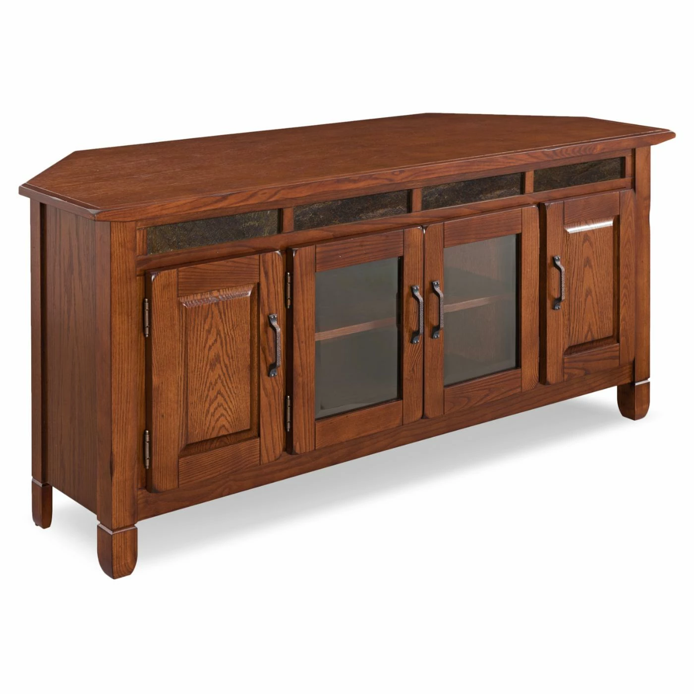 You media storage solution gets a whole lot more elegant with the Leick Home Rustic Corner TV Console – Oak. Constructed of solid oak and oak veneers, the TV console has a rich oak finish that warms any space. The console features two beveled glass doors at the center, which each open to an adjustable shelf behind, providing the perfect, dust-free space to store electronics. On either side of the glass doors are two wooden doors, which also each open to an adjustable shelf behind for enclosed storage. Details like raised wood panels, natural slate tile, hammered texture, and pewter add style, while its clipped corners save precious floor space, allowing the console to slip back into any room corner with ease.