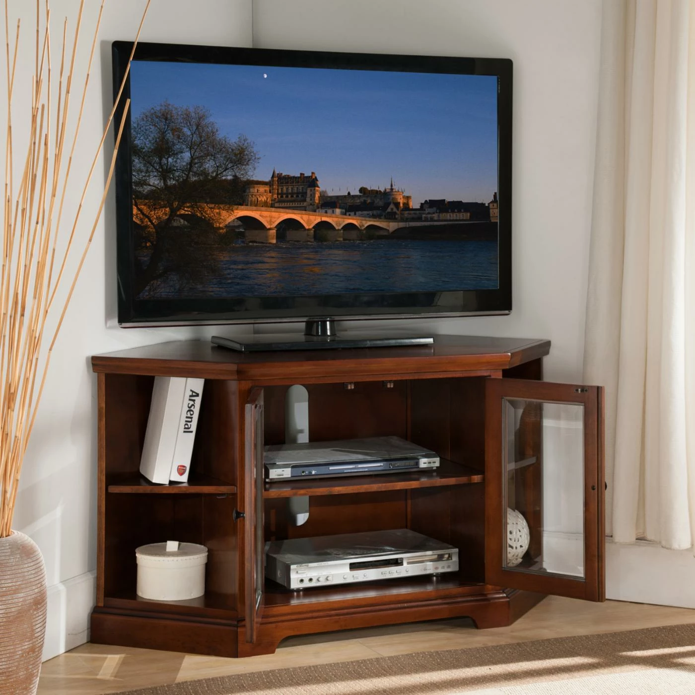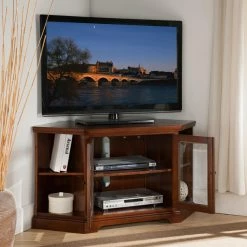 With its corner-friendly design and traditional style, the Leick Home Westwood Corner TV Stand with Bookcases is right at home in most any home – especially yours. The clipped back corners make it easy to nestle this TV stand into a corner, while the Westwood Cherry finish on the wood solids and veneers add warmth to any palette. Behind the two beveled, tempered glass doors, you’ll find an adjustable component shelf, complete with wire management recesses in the back. And on the sides, you’ll find bookcase ends with one adjustable shelf each. The hinge-method construction makes assembly easy.