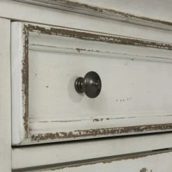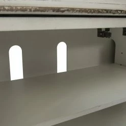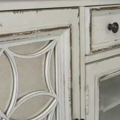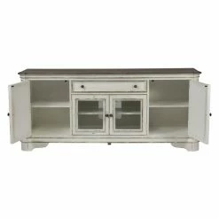 The Liberty Furniture Industries Magnolia Manor TV Stand features fine European style that lends an elegant touch to your room. This piece makes a great center for all your electronics with its wide top and ample storage. It features a top drawer and four glass doors. There are two interior shelves that are removable and adjustable for your convenience. It’s built from poplar solids and veneers in an antique white finish.