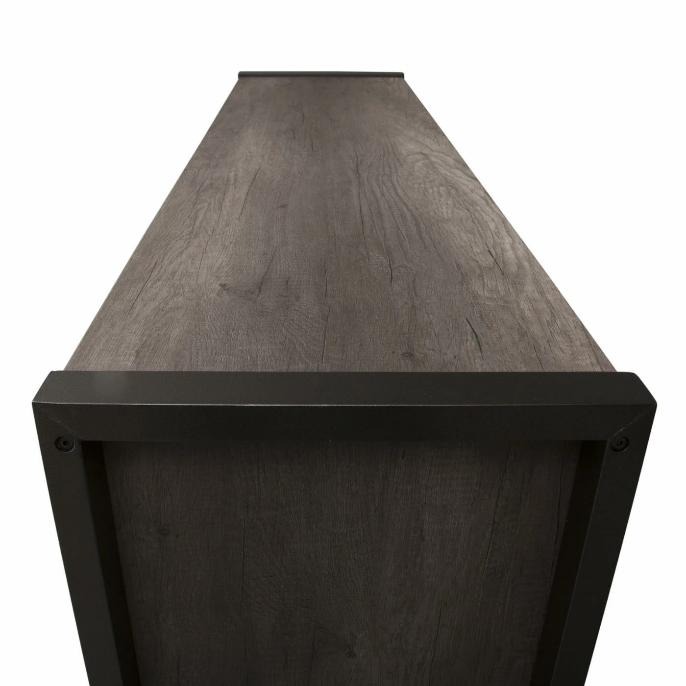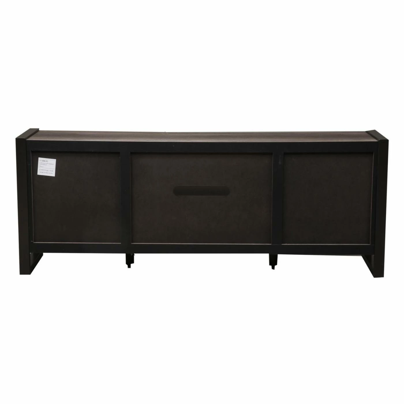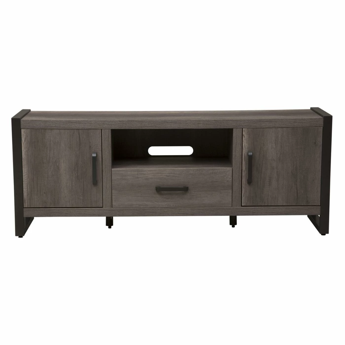 The Liberty Furniture Industries Tanners Creek TV Stand has plenty of space for your TV, media library, and more. The TV stand features one open shelf and one drawer. The two side cabinets keep your media center looking neat and organized. This piece is built from solid rubberwood with a metal frame in a gray finish.