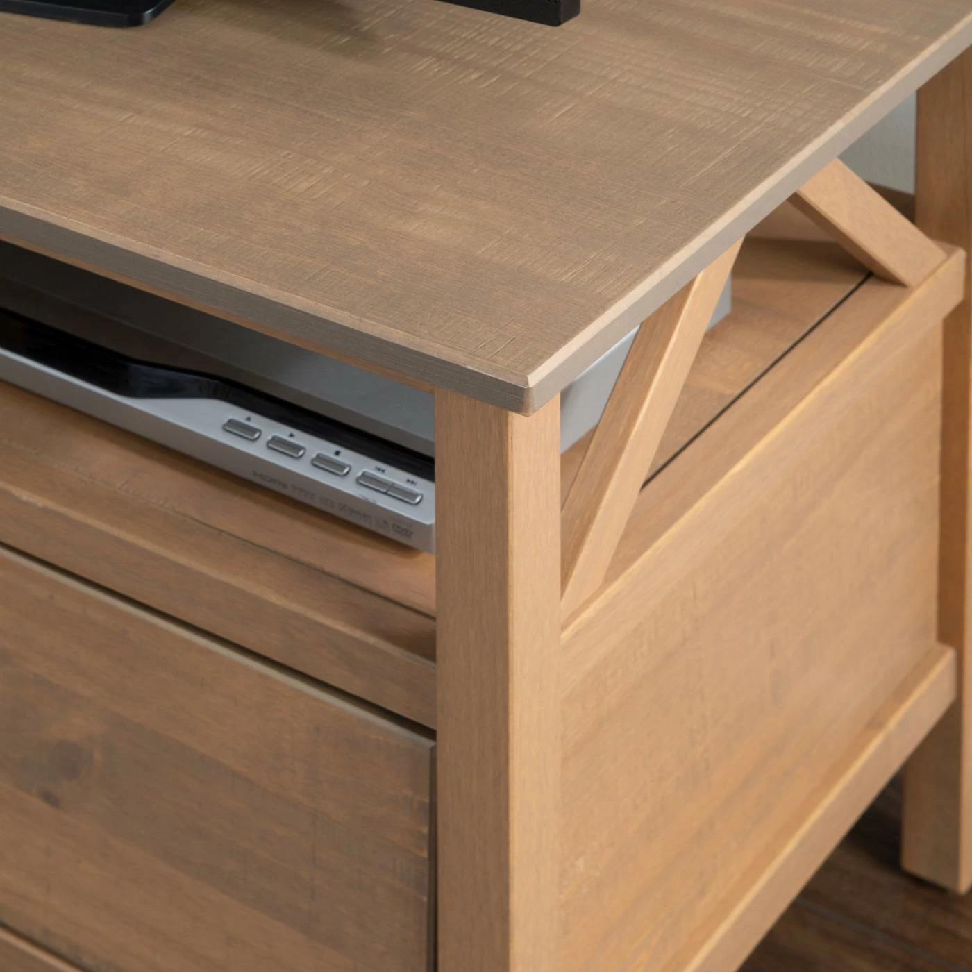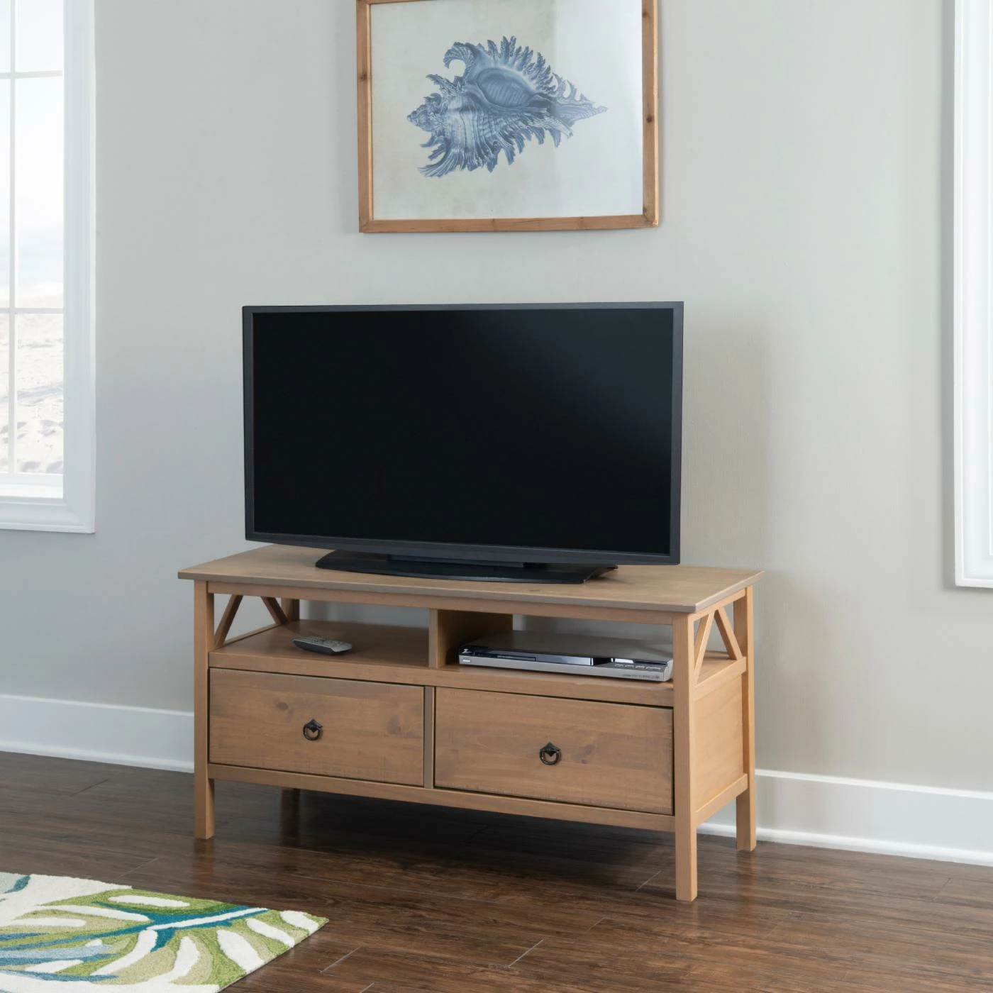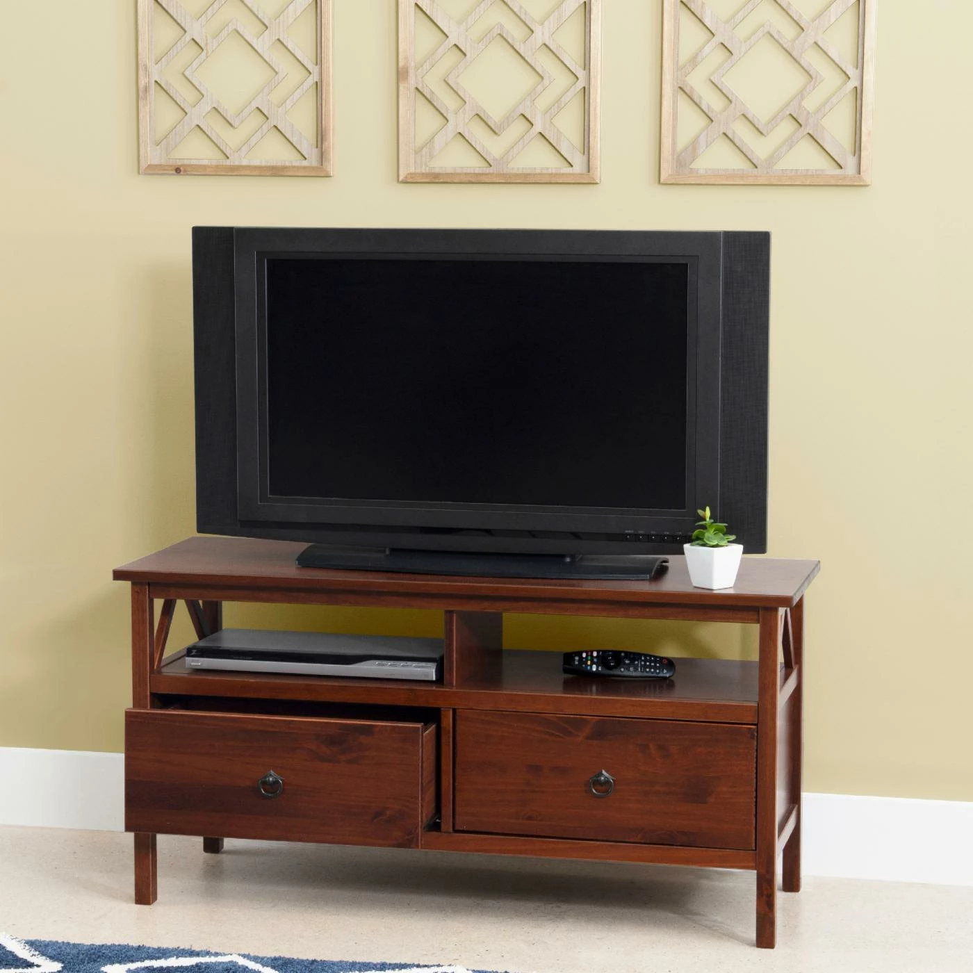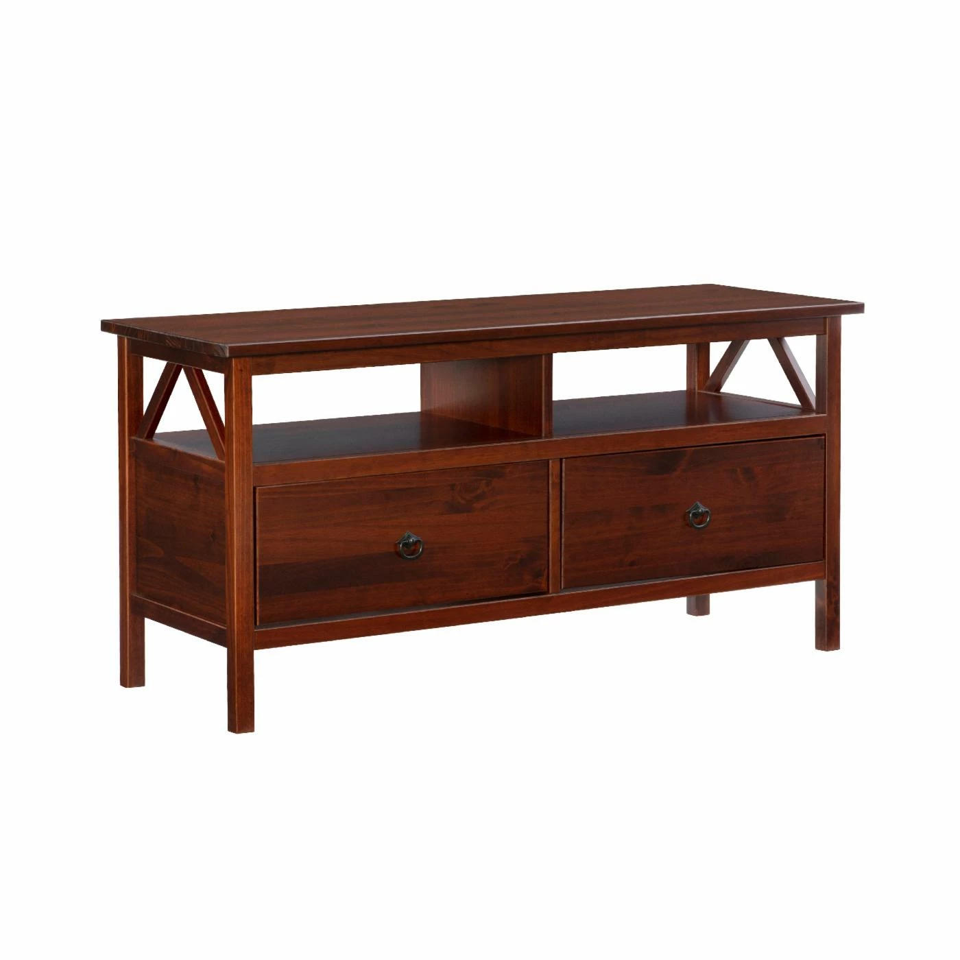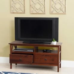 If you’re entertaining the idea of a new place to display your television, look no further than the Linon Titian TV Stand. The rich finish makes it a lovely addition to your living room or den, while the durable construction ensures years of lasting beauty. Two open compartments are ideal for components, while two roomy drawers are perfect for storing media and accessories. Made of pine wood and engineered wood (also known as medium density fiberboard or MDF). Assembly required.