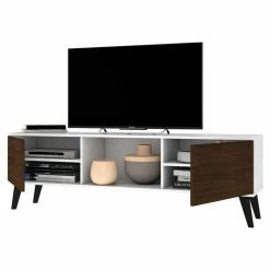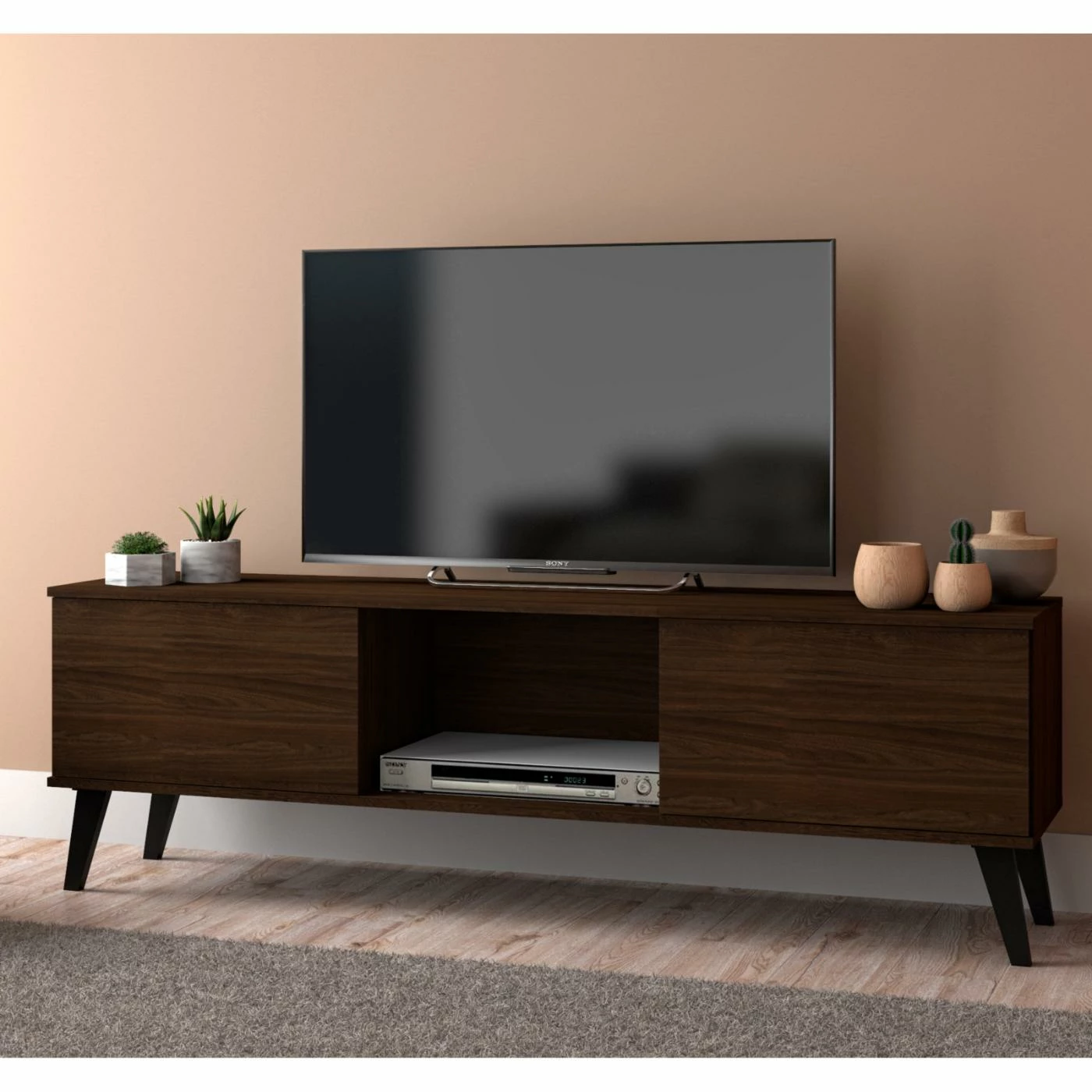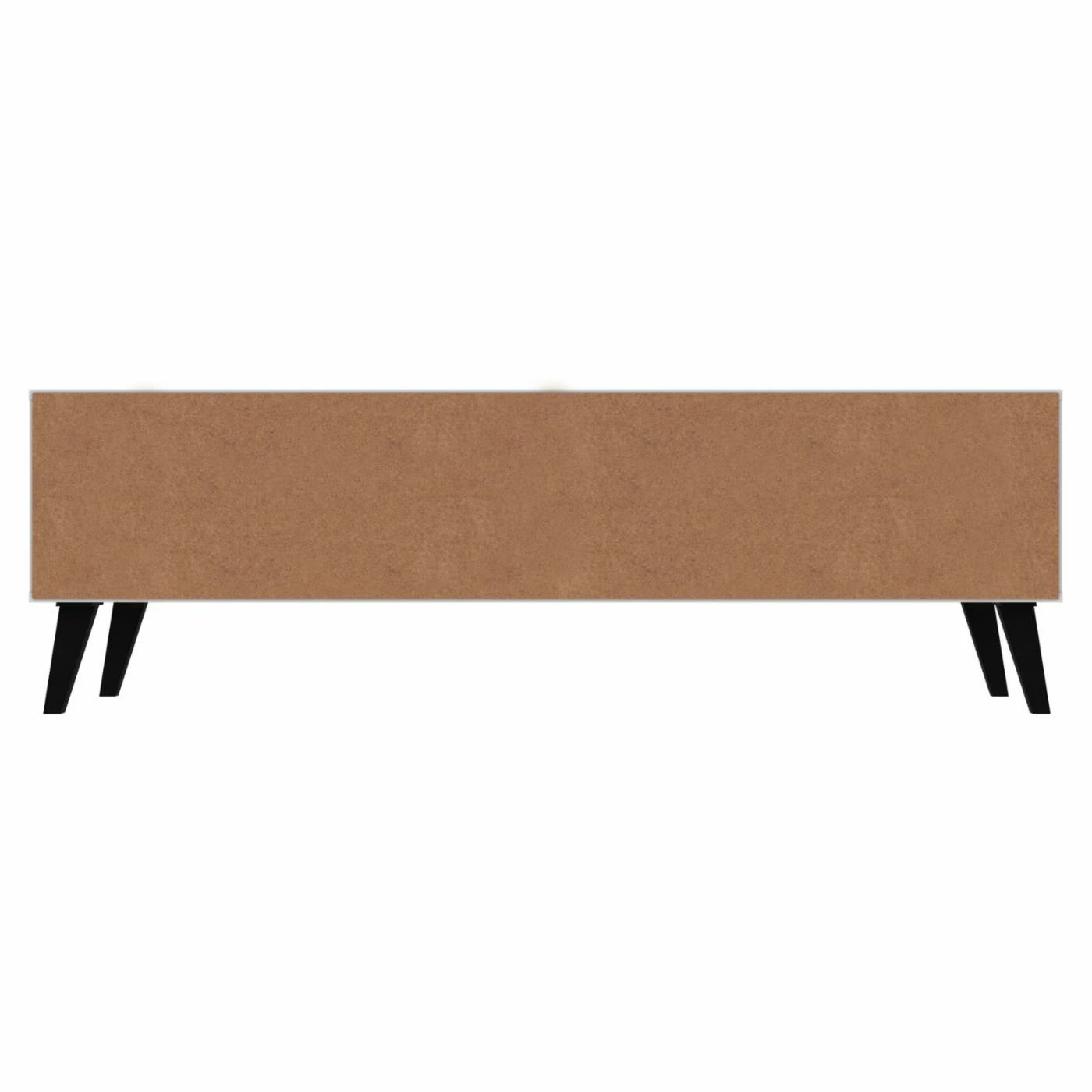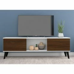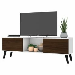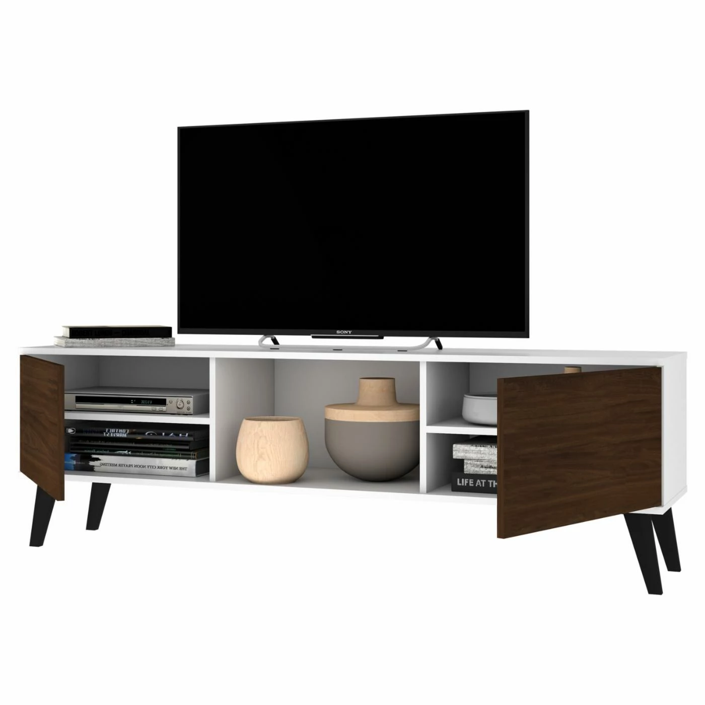 A low profile design supported by tapered, angled legs, the Manhattan Comfort Doyers TV Stand gives your space a mid-mod look. This TV stand is constructed of MDP wood and supported by synthetic ABS legs. Two cabinet doors, each with an interior shelf, provide enclosed storage space. A large, open compartment at the center adds space for media or décor. Includes grommet for wire and media management.