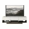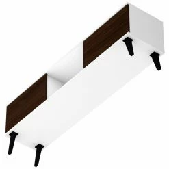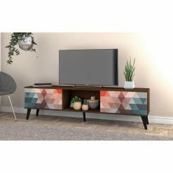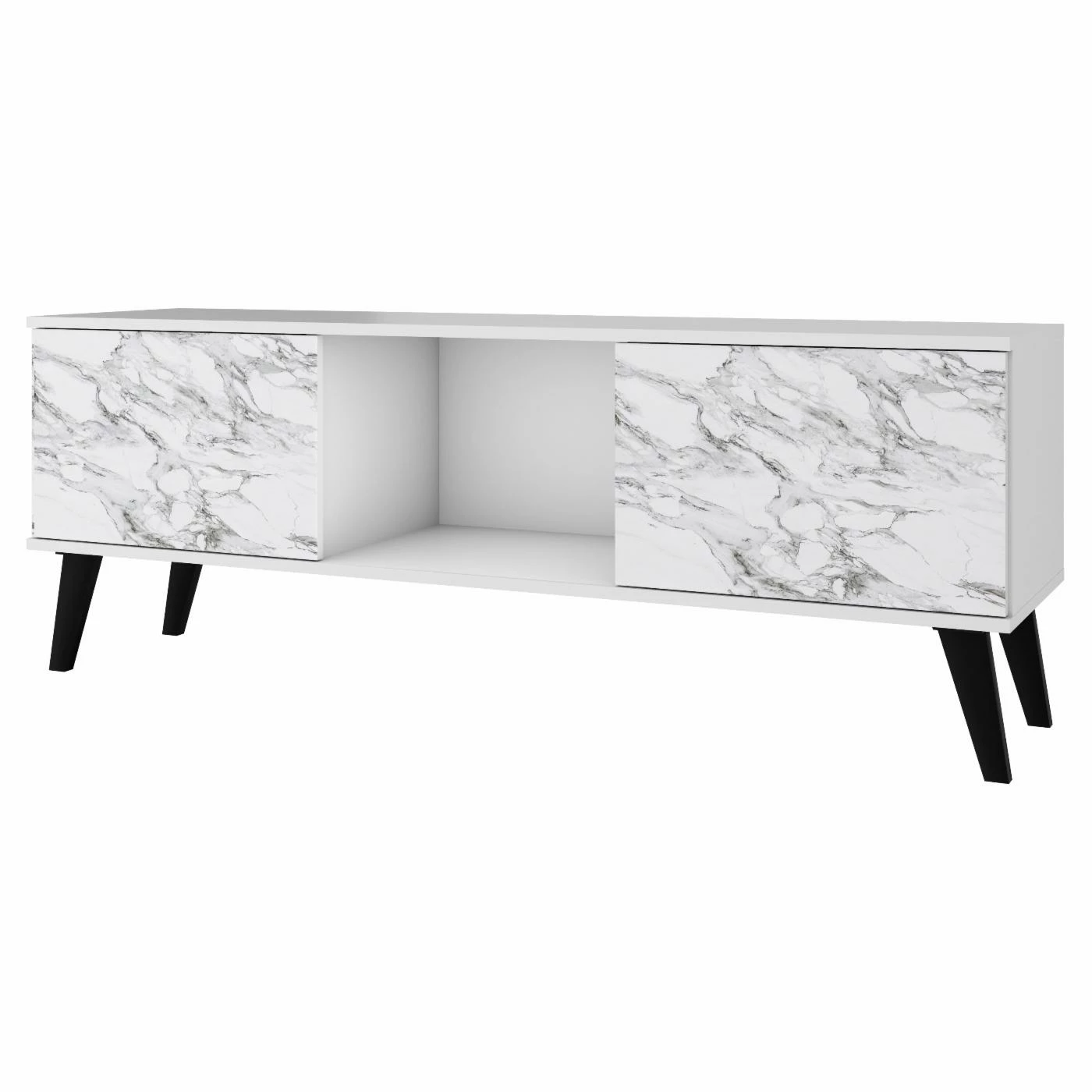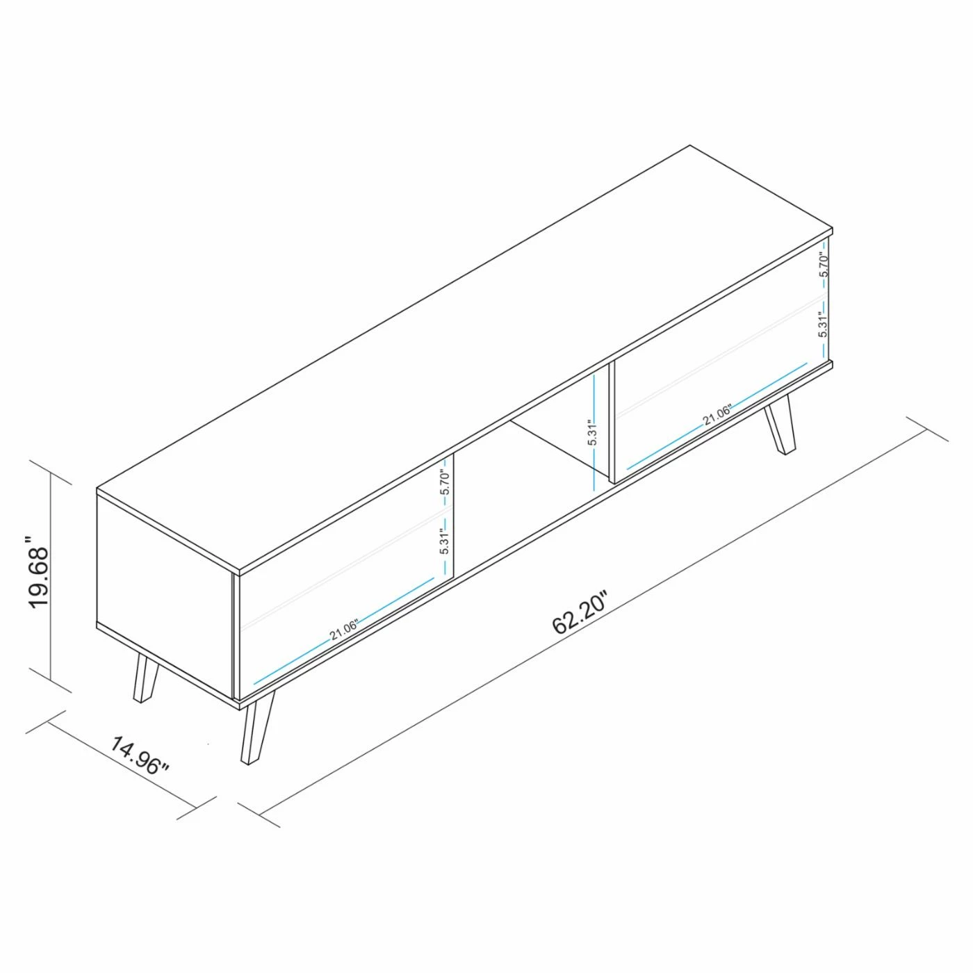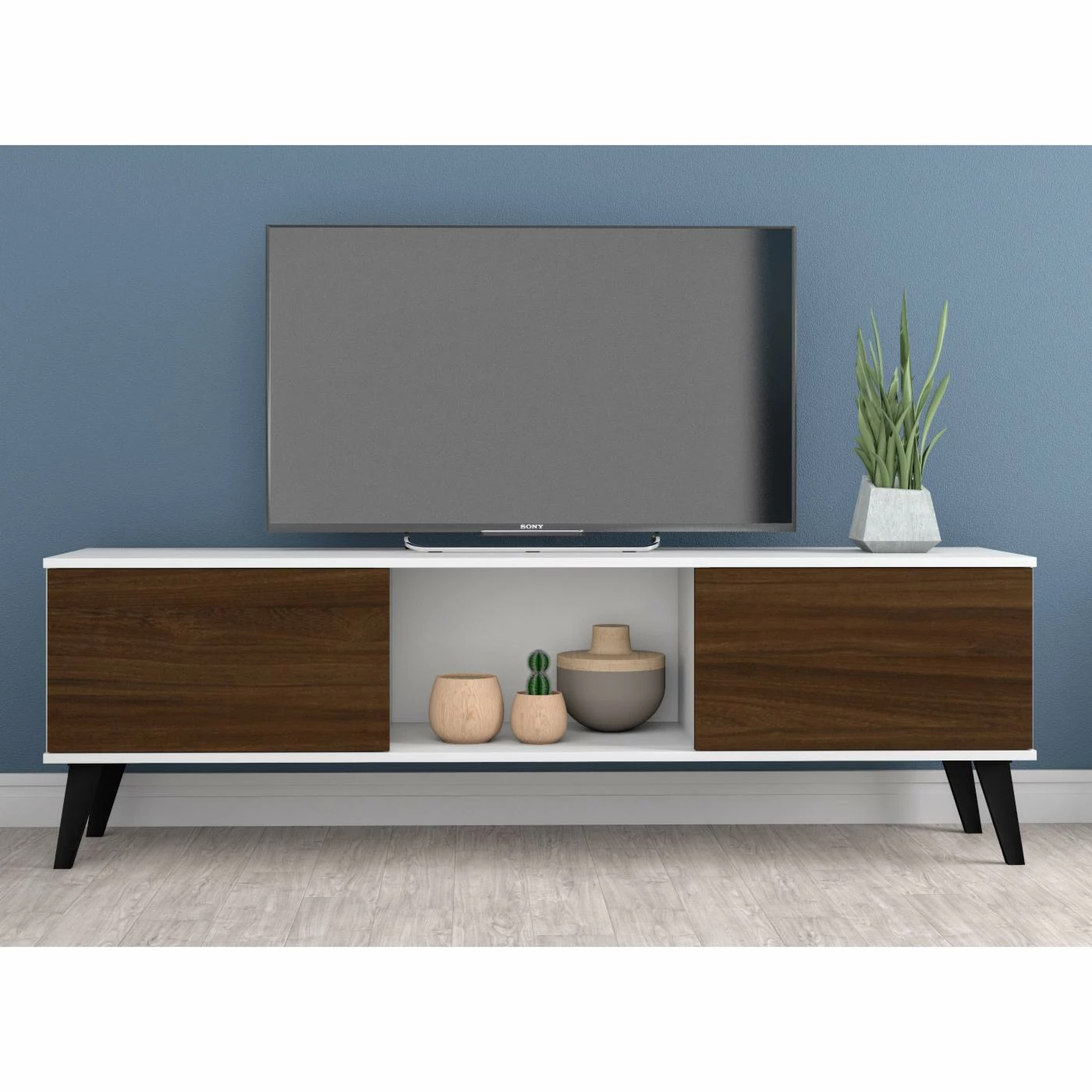 A low profile design supported by tapered, angled legs, the Manhattan Comfort Doyers TV Stand gives your space a mid-mod look. This TV stand is constructed of MDP wood and supported by synthetic ABS legs. Two cabinet doors, each with an interior shelf, provide enclosed storage space. A large, open compartment at the center adds space for media or décor. Includes grommet for wire and media management.